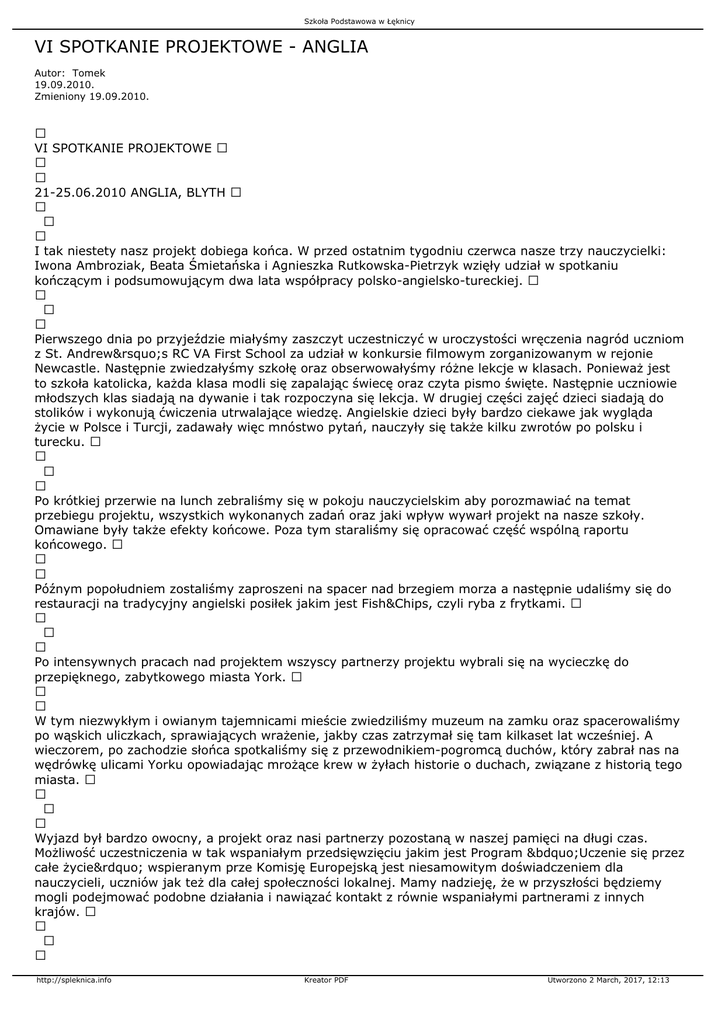 Szkoła Podstawowa w Łęknicy VI SPOTKANIE PROJEKTOWE - ANGLIA Autor: Tomek 19.09.2010. Zmieniony 19.09.2010. VI SPOTKANIE PROJEKTOWE 21-25.06.2010 ANGLIA, BLYTH I tak niestety nasz projekt dobiega końca. W przed ostatnim tygodniu czerwca nasze trzy nauczycielki: Iwona Ambroziak, Beata Śmietańska i Agnieszka Rutkowska-Pietrzyk wzięły udział w spotkaniu kończącym i podsumowującym dwa lata współpracy polsko-angielsko-tureckiej. Pierwszego dnia po przyjeździe miałyśmy zaszczyt uczestniczyć w uroczystości wręczenia nagród uczniom z St. Andrew’s RC VA First School za udział w konkursie filmowym zorganizowanym w rejonie Newcastle. Następnie zwiedzałyśmy szkołę oraz obserwowałyśmy różne lekcje w klasach. Ponieważ jest to szkoła katolicka, każda klasa modli się zapalając świecę oraz czyta pismo święte. Następnie uczniowie młodszych klas siadają na dywanie i tak rozpoczyna się lekcja. W drugiej części zajęć dzieci siadają do stolików i wykonują ćwiczenia utrwalające wiedzę. Angielskie dzieci były bardzo ciekawe jak wygląda życie w Polsce i Turcji, zadawały więc mnóstwo pytań, nauczyły się także kilku zwrotów po polsku i turecku. Po krótkiej przerwie na lunch zebraliśmy się w pokoju nauczycielskim aby porozmawiać na temat przebiegu projektu, wszystkich wykonanych zadań oraz jaki wpływ wywarł projekt na nasze szkoły. Omawiane były także efekty końcowe. Poza tym staraliśmy się opracować część wspólną raportu końcowego. Późnym popołudniem zostaliśmy zaproszeni na spacer nad brzegiem morza a następnie udaliśmy się do restauracji na tradycyjny angielski posiłek jakim jest Fish&Chips, czyli ryba z frytkami. Po intensywnych pracach nad projektem wszyscy partnerzy projektu wybrali się na wycieczkę do przepięknego, zabytkowego miasta York. W tym niezwykłym i owianym tajemnicami mieście zwiedziliśmy muzeum na zamku oraz spacerowaliśmy po wąskich uliczkach, sprawiających wrażenie, jakby czas zatrzymał się tam kilkaset lat wcześniej. A wieczorem, po zachodzie słońca spotkaliśmy się z przewodnikiem-pogromcą duchów, który zabrał nas na wędrówkę ulicami Yorku opowiadając mrożące krew w żyłach historie o duchach, związane z historią tego miasta. Wyjazd był bardzo owocny, a projekt oraz nasi partnerzy pozostaną w naszej pamięci na długi czas. Możliwość uczestniczenia w tak wspaniałym przedsięwzięciu jakim jest Program „Uczenie się przez całe życie” wspieranym prze Komisję Europejską jest niesamowitym doświadczeniem dla nauczycieli, uczniów jak też dla całej społeczności lokalnej. Mamy nadzieję, że w przyszłości będziemy mogli podejmować podobne działania i nawiązać kontakt z równie wspaniałymi partnerami z innych krajów. http://spleknica.info Kreator PDF Utworzono 2 March, 2017, 12:13 Szkoła Podstawowa w Łęknicy Opracowała: Agnieszka Rutkowska-Pietrzyk http://spleknica.info Kreator PDF Utworzono 2 March, 2017, 12:13