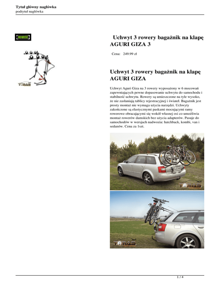 Tytuł główny nagłówka podtytuł nagłówka Uchwyt 3 rowery bagażnik na klapę AGURI GIZA 3 Cena: 249.99 zł Uchwyt 3 rowery bagażnik na klapę AGURI GIZA Uchwyt Aguri Giza na 3 rowery wyposażony w 6 mocowań zapewniających pewne dopasowanie uchwytu do samochodu i stabilność uchwytu. Rowery są umieszczone na tyle wysoko, że nie zasłaniają tablicy rejestracyjnej i świateł. Bagażnik jest prosty montaż nie wymaga użycia narzędzi. Uchwyty zakończone są elastycznymi paskami mocującymi ramy rowerowe obracającymi się wokół własnej osi co umożliwia montaż rowerów damskich bez użycia adapterów. Pasuje do samochodów w wersjach nadwozia: hatchback, kombi, van i sedanów. Cena za 1szt. 1/4 Tytuł główny nagłówka podtytuł nagłówka Lista aut do których bagażnik pasuje (wszystkie wersje nadwoziowe): ALFA ROMEO 75 / 90 / 145 / 146 /147 / 155 / 164 / 166 / 156 / 156 Sport Wagon / GTV /Spider AUDI 100 / 100 Avant / 100 /200 / 100 Quattro / 200 quattro A2 / A4 / A6 / A6 avant / A8 / 80 Avant / A3 A4 Avant / Allroad / TT BMW 316 i / 325 i / 518 / 540 i / 728 / 733 i / 728 i / 745 i 730 i / 750 i Serie 3 / Serie 3 Touring / Serie 3 Coupe Serie 3 Cabrio / Serie 3 Compact / Z 3 Coupe Serie 5 Touring / X 5 / Serie 7 CHRYSLER 300 M / Neon Stufe / Stratus Stufe / Stratus Vision / Voyager / Grand Voyager / PT Cruiser CITROEN BX / XM / ZX / Evasion / Visa / AX / Xsara / Xsara Break Xsara Picasso / Xantia / Xantia Break / XM Break Saxo / Berlingo / C5 DAEWOO Espero / Nexia / Lanos / Nubira / Nubira SW Leganza / Matiz DAIHATSU Applause / Charade / Cuore / Sirion / YRV FIAT Brava / Cinquecento / Marea / Panda / Regata Regata Weekend / Tipo / Tempra SW / Tempra / Ulisse / Bravo / Uno / Seicento / Palio Palio Weekend / Multipla / Stilo / Barchetta 2/4 Tytuł główny nagłówka podtytuł nagłówka FORD Escort / Fiesta / Galaxy / Mondeo Stufe / Mondeo Turnier / Mondeo Scorpio / Scorpio 4 x 4 / Sierra 4 x 4 / Ka / Cougar / Focus S.W. / Puma HONDA Accord / Accord kombi / Accord coupe / Civic / Civic Aerodeck Concerto / Legend / Jazz / Prelude 1.8 / Prelude / Shuttle / Logo Integra HYUNDAI Accent / Lantra / Sephia / Sonica / Coupe / Santamo / XG / Santa Fe / Terracan Trajet / Matrix / Galloper JAGUAR S – Type / X – Type JEEP Cherokee / Grand Cherokee KIA Pride / Sephia / Clarus / Carnival / Rio / Carens / Sportage / Joise LANCIA Lybra / Lybra S.W. / Dedra / Dedra S.W. / Delta / Prisma / Y 10 / K / K S.W. / Y / Z LADA 110 / Niva / Niva 4 / 112 / 111 Station Wagon LAND ROVER Defender / Freelander / Discovery / Range Rover LEXUS IS 200 / GS 300 -430 / LS 400-430 / RX 300 MAZDA 121 / 323 / 626 (bez kombi ) MPV / RX7 turbo / RX7 / Xedos 6 / Xedos 9 / MX 5 / Tribute / Demio / Premacy MERCEDES C 180 -280 / 300 – 600 SEL / A Classe / C Klasse / C Klasse S.W. / C Sport Coupe / E Klasse / S Klasse / M Klasse / V Klasse / CLK MITSUBISHI Colt / Galant / Lancer / Sigma / Space / Space Wagon / Space Star / Carirsma / Pajero Pinin / Pajero / Pajero Sport NISSAN Almera / Almera Tino / Maxima QG / Micra / Primera 3/4 Tytuł główny nagłówka podtytuł nagłówka Serena / 100 NX / Sunny / Sunny Y 10 / Sunny OPEL Astra / Agila / Corsa / Frontera / Omega S.W. / Omega / Vectra / Vectra S.W. / Zafira PEUGEOT 106 / 205 / 206 / 306 / 307 / 405 / 405 kombi / 406 S.W. / 406 / 406 Coupe / 605 / 607 / 505 / 806 RENAULT CLio / Megane Classic / 19 / Twingo / Laguna kombi / Safrane / Espace / Grand Espace / ROVER 25 / 45 / 75 / 420 / 620 / 623 / 400 / 200 / 618 / 800 SAAB 9-3 / 9-5 / 900 / 9000 SEAT Alhambra / Arosa / Cordoba / Cordoba Vario / Ibiza / Marbella / Toledo SKODA Favorit / Felicia / Felicia kombi / Octavia / Octavia kombi/ Fabia / Fabia kombi SUBARU Justy / Legacy / Impreza / Impreza kombi SUZUKI Alto / ECS / Swift / Baleno / Baleno kombi / Samurai / Grand Vitara TOYOTA Camry / Carina / Carina kombi / Corolla / Corolla kombi / Previa / Starlet / Yaris / Avensis / Avensis I kombi Picnic VOLVO 440 / 460 / 740 / 850 / 940 / S40 / V40 / S60 / S70 / S80 / V90 / S90 / C70 / Polar VOLKSWAGEN Golf II /Golf III / Golf III kombi / Passat / Vento / Polo / Sharan / T2 / T$ / Lupo / New Beeatle / Bora 4/4 Powered by TCPDF (www.tcpdf.org)