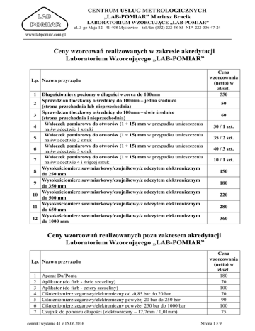 CENTRUM USŁUG METROLOGICZNYCH „LAB-POMIAR” Mariusz Bracik LABORATORIUM WZORCUJĄCE „LAB-POMIAR” ul. 3-go Maja 12 41-408 Mysłowice tel./fax (032) 222-38-85 NIP: 222-006-47-24 www.labpomiar.com.pl Ceny wzorcowań realizowanych w zakresie akredytacji Laboratorium Wzorcującego „LAB-POMIAR” Lp. Nazwa przyrządu 1 Długościomierz poziomy o długości wzorca do 100mm Sprawdzian tłoczkowy o średnicy do 100mm – jedna średnica 2 (strona przechodnia lub nieprzechodnia) Sprawdzian tłoczkowy o średnicy do 100mm – dwie średnice 3 (strona przechodnia i nieprzechodnia) Wałeczek pomiarowy do otworów (1 ÷ 15) mm w przypadku umieszczenia 4 na świadectwie 1 sztuki Wałeczek pomiarowy do otworów (1 ÷ 15) mm w przypadku umieszczenia 5 na świadectwie 2 sztuk Wałeczek pomiarowy do otworów (1 ÷ 15) mm w przypadku umieszczenia 6 na świadectwie 3 sztuk Wałeczek pomiarowy do otworów (1 ÷ 15) mm w przypadku umieszczenia 7 na świadectwie 4 i więcej sztuk Wysokościomierz suwmiarkowy/czujnikowy/z odczytem elektronicznym 8 do 250 mm Wysokościomierz suwmiarkowy/czujnikowy/z odczytem elektronicznym 9 do 350 mm Wysokościomierz suwmiarkowy/czujnikowy/z odczytem elektronicznym 10 do 500 mm Wysokościomierz suwmiarkowy/czujnikowy/z odczytem elektronicznym 11 do 650 mm Wysokościomierz suwmiarkowy/czujnikowy/z odczytem elektronicznym 12 do 1000 mm Cena wzorcowania (netto) w zł/szt. 550 50 60 30 / 1 szt. 35 / 2 szt. 40 / 3 szt. 10 / 1 szt. 150 180 220 280 360 Ceny wzorcowań realizowanych poza zakresem akredytacji Laboratorium Wzorcującego „LAB-POMIAR” Lp. Nazwa przyrządu 1 2 3 4 5 6 7 Aparat Du’Ponta Aplikator (do farb - dwie szczeliny) Aplikator (do farb - cztery szczeliny) Ciśnieniomierz zegarowy/elektroniczny od -0,85 bar do 20 bar Ciśnieniomierz zegarowy/elektroniczny powyżej 20 bar do 250 bar Ciśnieniomierz zegarowy/elektroniczny powyżej 250 bar do 1000 bar Czujnik do pomiaru długości (elektroniczny – 12,7mm / 0,01mm) cennik: wydanie 41 z 15.06.2016 Cena wzorcowania (netto) w zł/szt. 180 70 100 70 90 100 75 Strona 1 z 9 CENTRUM USŁUG METROLOGICZNYCH „LAB-POMIAR” Mariusz Bracik LABORATORIUM WZORCUJĄCE „LAB-POMIAR” ul. 3-go Maja 12 41-408 Mysłowice tel./fax (032) 222-38-85 NIP: 222-006-47-24 www.labpomiar.com.pl 8 9 10 11 12 13 14 15 16 17 18 19 20 21 22 23 24 25 26 27 28 29 30 31 32 33 34 35 36 37 38 39 40 41 42 Czujnik do pomiaru długości (elektroniczny – 12,7mm / 0,001mm) Czujnik do pomiaru długości (elektroniczny – 25,4mm / 0,01mm) Czujnik do pomiaru długości (elektroniczny – 25,4mm / 0,001mm) Czujnik do pomiaru długości (elektroniczny – 50,8mm / 0,01mm) Czujnik do pomiaru długości (elektroniczny – 50,8mm / 0,001mm) Czujnik do pomiaru długości (elektroniczny – 100mm / 0,01mm) Czujnik do pomiaru długości (elektroniczny – 100mm / 0,001mm) Czujnik do pomiaru długości (zegarowy – 10mm / 0,01mm) Czujnik do pomiaru długości (zegarowy – 50mm / 0,01mm) Czujnik do pomiaru długości (zegarowy – 100mm / 0,01mm) Czujnik do pomiaru długości (zegarowy mikronowy – 1mm) Czujnik do pomiaru długości (zegarowy mikronowy – 5mm) Czujnik dźwigniowo – zębaty (diatest) metryczny Czujnik dźwigniowo – zębaty (diatest) calowy Czujnik indukcyjny ze wskaźnikiem analogowym Czujnik mechaniczny (ortotest, linimetr) Czujnik optyczny (optimetr – 0,001mm) Czujnik optyczny (ultraoptimetr – 0,0002mm) Czujnikowy przyrząd do pomiaru wymiarów zewnętrznych (grubości) – macki zewnętrzne – elektroniczny lub zegarowy - 100mm / 0,1mm Czujnikowy przyrząd do pomiaru wymiarów zewnętrznych (grubości) – macki zewnętrzne – elektroniczny lub zegarowy - 100mm / 0,01mm Czujnikowy przyrząd do pomiaru wymiarów zewnętrznych (grubości) – macki zewnętrzne – elektroniczny lub zegarowy - 100mm / 0,001mm Czujnikowy przyrząd do pomiaru wymiarów wewnętrznych – macki wewnętrzne – elektroniczny lub zegarowy - 100mm / 0,1mm Czujnikowy przyrząd do pomiaru wymiarów wewnętrznych – macki wewnętrzne – elektroniczny lub zegarowy - 100mm / 0,01mm Czujnikowy przyrząd do pomiaru wymiarów wewnętrznych – macki wewnętrzne – elektroniczny lub zegarowy - 100mm / 0,001mm Dalmierz laserowy w zakresie 0,1 ÷ 1m Dalmierz laserowy w zakresie 0,1 ÷ 12m Długościomierz pionowy Długościomierz poziomy o zakresie pomiarowym do 500 mm (wzorzec powyżej 100 mm) Długościomierz poziomy o zakresie pomiarowym do 1000 mm (wzorzec powyżej 100 mm) Elastikometr - przyrząd do sprawdzania sprężyn (sprawdzenie jednej głowicy do pomiaru siły i układu pomiaru wysokości) Elastikometr - przyrząd do sprawdzania sprężyn (sprawdzenie dwóch głowic do pomiaru siły i układu pomiaru wysokości) Elastikometr - przyrząd do sprawdzania sprężyn (sprawdzenie trzech głowic do pomiaru siły i układu pomiaru wysokości) Głębokościomierz mikrometryczny Głębokościomierz suwmiarkowy/elektroniczny Głowica mikrometryczna – zadajnik mikrometryczny (0 ÷ 25 mm) cennik: wydanie 41 z 15.06.2016 90 100 115 125 130 160 180 80 110 150 80 100 90 100 150 170 180 250 80 120 135 85 125 140 100 120 250 490 650 250 400 490 60 45 120 Strona 2 z 9 CENTRUM USŁUG METROLOGICZNYCH „LAB-POMIAR” Mariusz Bracik LABORATORIUM WZORCUJĄCE „LAB-POMIAR” ul. 3-go Maja 12 41-408 Mysłowice tel./fax (032) 222-38-85 NIP: 222-006-47-24 www.labpomiar.com.pl 43 Głowica mikrometryczna – zadajnik mikrometryczny (0 ÷ 50 mm) Głowica podziałowa – podzielnica (optyczna/mechaniczna) 44 (dz. el.: 1; 3; 10; 30, 1) 45 Grindometr 46 Grubościomierz czujnikowy (zegarowy/elektroniczny) – działka el. 0,01mm 47 Grubościomierz czujnikowy (zegarowy/elektroniczny) – działka el. 0,001mm 48 Grubościomierz / ściankomierz szczękowy/zegarowy działka el. 0,1mm 49 Grzebień malarski - do 12 szczelin 50 Grzebień malarski - powyżej 12 szczelin Kątomierz uniwersalny 4 x 90 lub 0 360 - 5 lub 1 51 (noniuszowy/elektroniczny) Kątomierz elektroniczny 0,1/ poziomn