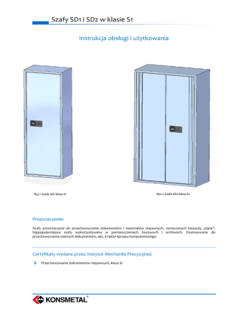 Szafy SD1 i SD2 w klasie S1 Instrukcja obsługi i użytkowania Rys.1 Szafa SD1 klasa S1 Rys.2 Szafa SD2 klasa S1 Przeznaczenie: Szafy przeznaczone do przechowywania dokumentów i materiałów niejawnych, oznaczonych klauzulą „tajne”. Najpopularniejsze szafy wykorzystywane w pomieszczeniach biurowych i archiwach. Dostosowane do przechowywania ważnych dokumentów, akt, a także sprzętu komputerowego. Certyfikaty wydane przez Instytut Mechaniki Precyzyjnej: Przechowywanie dokumentów niejawnych, klasa S1 Szafy SD1 i SD2 w klasie S1 Opis produktu: Korpus i drzwi wykonane z blachy stalowej o grubości: 3 [mm] nadającej odpowiednią sztywność oraz zabezpieczonej przed korozją. Szafa SD1/SD2 klasa S1 wyposażona w zamek kluczowy kl. A wg EN 1300 z dwoma kluczami, zabezpieczony przed działaniem destrukcyjnym w tym przed przewierceniem Drzwi szafy SD1/SD2 klasy S1 blokowane mechanizmem ryglowym na trzech krawędziach z ryglami o średnicy 20 [mm] i przekroju 314 [mm2] i rozstawie maksymalnym 670 [mm] (rozstaw zależny od wymiarów szafy) oraz stałym ryglem przyzawiasowym. Półki wewnętrzne wykonane z blachy o grubości o,8 [mm] z regulacją wysokości zawieszenia o maksymalnym obciążeniu 50 [kg]. Zawiasy wewnętrzne. Kąt otwarcia drzwi w szafach SD1 w klasie S1 wynosi 90 stopni Kąt otwarcia drzwi w szafach SD2 w klasie S1 wynosi 180 stopni Gwarancja 24 miesiące. Wyposażenie podstawowe: Zamek kluczowy kl. A dla szafy SD1 oraz SD2 w klasie S1 Półki Instrukcja obsługi i użytkowania wyrobu z kartą gwarancyjną. Wyposażenie dodatkowe Skrytki wykonane z blachy o grubości 2 [mm] indywidualnie zamykane na zamek EuroLocks B671 lub zamek kl. A wg EN 1300. Skrytki w szafach dwudrzwiowych i jednodrzwiowych posiadają jedną komorę i zamykane są na jeden klucz Dodatkowe półki. Dodatkowy zamek kluczowy, szyfrowy lub elektroniczny Uchwyt do plombowania – kołki z miseczką do odciśnięcia pieczęci. Dwa otwory montażowe w dnie szafy. Kotwy mocujące. Drugi kluczyk do przeszyfrowania. Rodzaje zamków: Kluczowy; Szyfrowy; Elektroniczny; Szafy SD1 i SD2 w klasie S1 Montaż do podłoża: Szafy montowane są do podłoża stalowym łącznikiem rozporowym. Rys. 5 UWAGA: Urządzenie powinno być zamocowane w podłożu betonowym min. C16/20 (B20) zależnie od klasy wyrobu kotwą segmentową M12x100 Aby zamontować szafę do podłoża należy: 1. Ustawić szafę w miejscu przeznaczenia. 2. Zdjąć zaślepki z otworów w dnie wyrobu. 3. Nawiercić otwory w podłożu przez otwory w wyrobie na głębokość odpowiadającą długości łącznika rozporowego. 4. Ustawić szafę tak, aby otwory w dnie kasy i otwory w podłożu nachodziły na siebie. 5. Włożyć kotwy i dokręcić nakrętki. W przypadku, gdy śruba łącznika rozporowego po dokręceniu nakrętki wystaje powyżej dna wewnątrz kasy, należy poluzować nakrętkę, a następnie wkrętakiem wkręcić śrubę i dokręcić nakrętkę. 6. Przykryć otwory zaślepkami. Obsługa szafy – otwieranie: Otwieranie wyrobów wyposażonych tylko w zamek kluczowy: 1. Włożyć klucz do otworu zamka. 2. Obrócić klucz o kąt pow. 90° (pow.1/4 obrotu) w prawą stronę, napotkany opór świadczy o otwarciu zamka, klucz musi pozostać w zamku (konstrukcja zamka kluczowego uniemożliwia wyjęcie klucza w pozycji otwartej zamka). 3. Obrócić pokrętło o około 90° (1/4 obrotu) w prawo, napotkany opór świadczy o odblokowaniu mechanizmów drzwi. 4. Po odciągnięciu drzwi do siebie następuje otwarcie wyrobu (w przypadku SD2 należy odciągnąć prawe, a następnie lewe drzwi). Szafy SD1 i SD2 w klasie S1 Otwieranie wyrobów wyposażonych tylko w zamek szyfrowy: 1. Otworzyć zamek szyfrowy wykonując czynności opisane w dołączonej instrukcji obsługi zamka szyfrowego. 2. Obrócić pokrętło o około 90° (1/4 obrotu) w prawo, napotkany opór świadczy o odblokowaniu mechanizmów drzwi. 3. Po odciągnięciu drzwi do siebie następuje otwarcie wyrobu (w przypadku SD2 należy odciągnąć prawe, a następnie lewe drzwi). Otwieranie wyrobów wyposażonych w zamki kluczowy i szyfrowy: 1. Otworzyć zamek szyfrowy zgodnie z dołączoną instrukcji obsługi zamka szyfrowego. 2. Włożyć klucz do otworu zamka. 3. Obrócić klucz o kąt pow. 90° (pow.1/4 obrotu) w prawą stronę, napotkany opór świadczy o otwarciu zamka, klucz musi pozostać w zamku (konstrukcja zamka kluczowego uniemożliwia wyjęcie klucza w pozycji otwartej zamka). 4. Obrócić pokrętło o około 90° (1/4 obrotu) w prawo, napotkany opór świadczy o odblokowaniu mechanizmów drzwi. 5. Po odciągnięciu drzwi do siebie, następuje otwarcie wyrobu (w przypadku SD2 należy odciągnąć prawe, a następnie lewe drzwi). Obsługa szafy – zamykanie: Zamykanie wyrobów wyposażonych tylko w zamek kluczowy: 1. Chwycić pokrętło (rygle muszą być schowane), zamknąć drzwi dociskając je do szafy, obrócić pokrętło w lewą stronę do oporu, następuje zaryglowanie drzwi (w przypadku SD2 należy zamknąć drzwi lewe, a następnie prawe). 2. Obrócić klucz o kąt pow.90° (1/4 obrotu) w lewą stronę, napotkany opór świadczy o zamknięciu zamka, klucz należy wyjąć, następuje zamknięcie wyrobu. Zamykanie wyrobów wyposażonych tylko w zamek szyfrowy: 1. Chwycić pokrętło (rygle muszą być schowane) zamknąć drzwi dociskając je do kasy, obrócić pokrętło w lewą stronę do oporu, następuje zaryglowanie drzwi (w przypadku SD2 należy zamknąć drzwi lewe, a następnie prawe). 2. Zamknąć zamek szyfrowy wykonując czynności opisane w dołączonej instrukcji obsługi zamka szyfrowego, następuje zamknięcie wyrobu. Zamykanie wyrobów wyposażonych w zamki kluczowy i szyfrowy: 1. Chwycić pokrętło (rygle muszą być schowane) zamknąć drzwi dociskając je do szafy, obrócić pokrętło w lewą stronę do oporu, następuje zaryglowanie drzwi (w przypadku MS2 należy zamknąć drzwi lewe, a następnie prawe). 2. Obrócić klucz o kąt pow. 90° (pow.1/4 obrotu) 