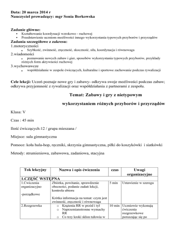 Data: 20 marca 2014 r Nauczyciel prowadzący: mgr Sonia Borkowska Zadanie główne: Kształtowanie koordynacji wzrokowo - ruchowej Przedstawienie uczniom możliwości innego wykorzystania typowych przyborów i przyrządów Zadania szczegółowe z zakresu: 1.motoryczności Szybkość, zwinność, zręczność, skoczność, siła, koordynacja i równowaga 2.wiadomości poznawanie nowych zabaw i gier, sposobów wykorzystania typowych przyborów, przykłady różnych form aktywności ruchowej 3.wychowawcze współdziałanie w zespole ćwiczących, kulturalne i sportowe zachowanie podczas rywalizacji Cele lekcji: Uczeń poznaje nowe gry i zabawy- odkrywa swoje możliwości podczas zabaw; odkrywa przyjemność z rywalizacji oraz współdziałania z partnerami z zespołu. Temat: Zabawy i gry z nietypowym wykorzystaniem różnych przyborów i przyrządów Klasa: V Czas : 45 min Ilość ćwiczących:12 / grupa mieszana / Miejsce: sala gimnastyczna Pomoce: koła hula-hop, ręczniki, skrzynia gimnastyczna, piłki do koszykówki i siatkówki Metody: strumieniowa, zabawowa, zadaniowa, stacyjna Tok lekcyjny Nazwa i opis ćwiczenia czas Uwagi organizacyjne 1.CZĘŚĆ WSTĘPNA 1.Cwiczenia organizacyjno Zbiórka, powitanie, sprawdzenie obecności, podanie zadań lekcji, kontrola ubioru 5 min Ustawienie w szeregu -porządkowe 2.Rozgrzewka Krótka informacja na temat: czym jest zwinność, zręczność i równowaga o Krążenia RR w przód i tył 10 min o Naprzemianstronne wymachy RR o Co trzy kroki skłon tułowia w Uczniowie wykonują ćwiczenia rozgrzewkowe poruszając się po o o o o o przód W podskokach krążenie RR oburącz w tył Co trzy kroki wymach prostej nogi w górę Bieg ze skipem A i skipem B, Przeplatanka, Cwał bokiem. kopercie. Po każdym ćwiczeniu inny uczeń prowadzi Zmiana ćwiczenia na polecenie nauczyciela. Berek w parach – uczniowie bawią się w klasycznego berka, w którym berkiem są dwie osoby trzymające się za ręce Zabawa DZIEŃ I NOC – dwie drużyny ustawione na środka boiska. Na hasło dzień, członkowie tej grupy gonią uczniów z grupy noc. 2.CZĘŚĆ GŁÓWNA Forma stacyjna - I stacja – uczniowie w parach trzymając mały ręcznik za rogi. Wykonują próby trafienia piłką koszykową będącą na ręczniku do kosza. - II stacja – uczniowie ustawieni w kole trzymają postawione koło HulaHop. Na sygnał kręcą kółkiem na podłodze i przemieszczają się łapiąc kolejno kółko. Osoba która dopuściła do upadku kółka wykonuje trzy karne przysiady. 20 min Uczniowie podzieleni na trzy czteroosobowe drużyny. Pomagają przynieść i przygotować przybory i przyrządy Uczniowie wykonują bieg najpierw w prawą a następnie w lewą stronę łapiąc za każdym razem dalsze koło - III stacja – uczniowie trzymający się jednego koła Hula-Hop poruszają się po krawędzi ostatniej części skrzyni - IV stacja – uczniowie pokonują w dowolny sposób skrzynię ustawioną pionowo i poziomo do dzieci Rywalizacja klasowa Gra „Traf piłką ostatniego”. Jedna drużyna ustawia się tworząc koło w odległości kroku jedno od drugiego. (miejsce zaznaczone pod nogami ucznia szarfą). Drużyna druga stoi w środku koła ustawiając się w rzędzie trzymając mocno pod boki jedna drugą. Dzieci tworzące koło Po wykonaniu ćwiczeń uczniowie podzieleni na dwie drużyny Uczniowie stojący w środku koła muszą pilnie uważać u kogo znajduje się piłka i starać się poruszać przerzucają piłkę starając się uderzyć nią ostatniego w rzędzie. Trafiony ostatni staje na początku szeregu. Gra toczy się do momentu kiedy wszyscy zawodnicy zostaną zbici. Wygrywa drużyna która w krótszym czasie zbije wszystkich zawodników 3. CZĘŚĆ KOŃCOWA Zabawy uspokajające Pętla – uczniowie stają bardzo blisko 5min siebie i podają ręce jakiejkolwiek osobie (każda dłoń innej) Po połączeniu uczniowie mają za zadanie bez puszczania rąk rozwiązać pętlę Zakończenie lekcji Podsumowanie i omówienie lekcji. 5 min Ocena najaktywniejszych uczniów i tych którzy trafili do kosza piłką w ręczniku Zbiórka. Pożegnanie. całym zespołem tak szybko i zwinnie, aby nie dopuścić do trafienia ostatniego w rzędzie.