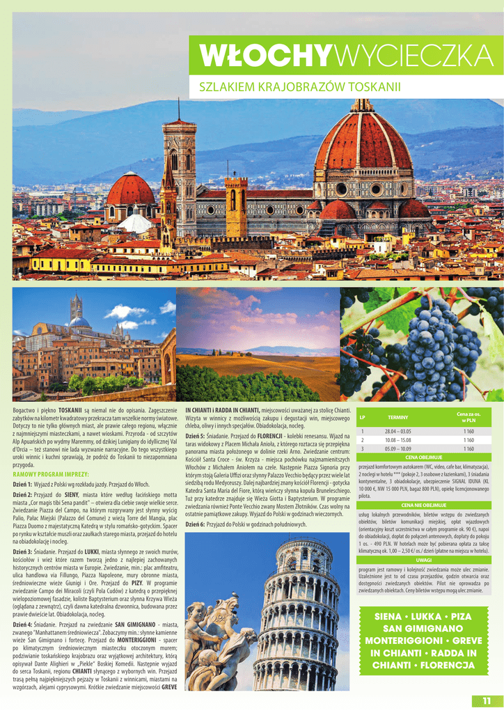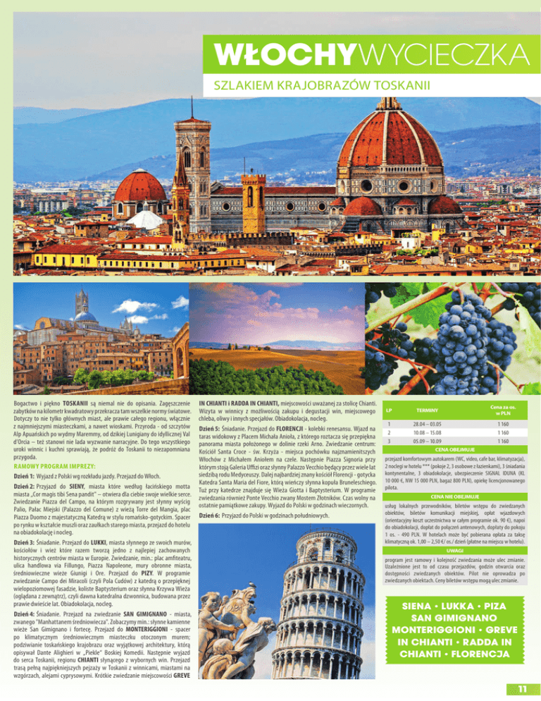 włochy WYCieCZkA szlaKiem KrajoBrazów TosKanii Bogactwo i piękno toSKAnII są niemal nie do opisania. zagęszczenie zabytków na kilometr kwadratowy przekracza tam wszelkie normy światowe. dotyczy to nie tylko głównych miast, ale prawie całego regionu, włącznie z najmniejszymi miasteczkami, a nawet wioskami. przyroda - od szczytów alp apuańskich po wydmy maremmy, od dzikiej lunigiany do idyllicznej Val d’orcia – też stanowi nie lada wyzwanie narracyjne. do tego wszystkiego uroki winnic i kuchni sprawiają, że podróż do toskanii to niezapomniana przygoda. RAMoWY PRoGRAM IMPREZY: dzień 1: Wyjazd z polski wg rozkładu jazdy. przejazd do Włoch. dzień 2: przyjazd do SIEnY, miasta które według łacińskiego motta miasta „cor magis tibi sena pandit" – otwiera dla ciebie swoje wielkie serce. zwiedzanie piazza del campo, na którym rozgrywany jest słynny wyścig palio, pałac miejski (palazzo del comune) z wieżą torre del mangia, plac piazza duomo z majestatyczną Katedrą w stylu romańsko-gotyckim. spacer po rynku w kształcie muszli oraz zaułkach starego miasta, przejazd do hotelu na obiadokolację i nocleg. dzień 3: Śniadanie. przejazd do LuKKI, miasta słynnego ze swoich murów, kościołów i wież które razem tworzą jedno z najlepiej zachowanych historycznych centrów miasta w europie. zwiedzanie, min.: plac amfiteatru, ulica handlowa via fillungo, piazza napoleone, mury obronne miasta, średniowieczne wieże Giunigi i ore. przejazd do PIZY. W programie zwiedzanie campo dei miracoli (czyli pola cudów) z katedrą o przepięknej wielopoziomowej fasadzie, koliste Baptysterium oraz słynna Krzywa Wieża (oglądana z zewnątrz), czyli dawna katedralna dzwonnica, budowana przez prawie dwieście lat. obiadokolacja, nocleg. dzień 4: Śniadanie. przejazd na zwiedzanie SAn GIMIGnAno - miasta, zwanego "manhattanem średniowiecza". zobaczymy min.: słynne kamienne wieże san Gimignano i fortecę. przejazd do MontERIGGIonI - spacer po klimatycznym średniowiecznym miasteczku otoczonym murem; podziwianie toskańskiego krajobrazu oraz wyjątkowej architektury, którą opisywał dante alighieri w „piekle“ Boskiej Komedii. następnie wyjazd do serca toskanii, regionu ChIAntI słynącego z wybornych win. przejazd trasą pełną najpiękniejszych pejzaży w toskanii z winnicami, miastami na wzgórzach, alejami cyprysowymi. Krótkie zwiedzanie miejscowości GREVE In ChIAntI i RAddA In ChIAntI, miejscowości uważanej za stolicę chianti. Wizyta w winnicy z możliwością zakupu i degustacji win, miejscowego chleba, oliwy i innych specjałów. obiadokolacja, nocleg. dzień 5: Śniadanie. przejazd do fLoREnCJI - kolebki renesansu. Wjazd na taras widokowy z placem michała anioła, z którego roztacza się przepiękna panorama miasta położonego w dolinie rzeki arno. zwiedzanie centrum: Kościół santa croce - św. Krzyża - miejsca pochówku najznamienitszych Włochów z michałem aniołem na czele. następnie piazza signoria przy którym stoją Galeria uffizi oraz słynny palazzo Vecchio będący przez wiele lat siedzibą rodu medyceuszy. dalej najbardziej znany kościół florencji - gotycka Katedra santa maria del fiore, którą wieńczy słynna kopuła Bruneleschiego. tuż przy katedrze znajduje się Wieża Giotta i Baptysterium. W programie zwiedzania również ponte Vecchio zwany mostem złotników. czas wolny na ostatnie pamiątkowe zakupy. Wyjazd do polski w godzinach wieczornych. dzień 6: przyjazd do polski w godzinach południowych. LP TERMINY Cena za os. w PLN 1 2 3 28.04 – 03.05 10.08 – 15.08 05.09 – 10.09 1 160 1 160 1 160 CENA OBEJMUJE przejazd komfortowym autokarem (Wc, video, cafe bar, klimatyzacja), 2 noclegi w hotelu *** (pokoje 2, 3 osobowe z łazienkami), 3 śniadania kontynentalne, 3 obiadokolacje, ubezpieczenie siGnal iduna (Kl 10 000 €, nW 15 000 pln, bagaż 800 pln), opiekę licencjonowanego pilota. CENA NIE OBEJMUJE usług lokalnych przewodników, biletów wstępu do zwiedzanych obiektów, biletów komunikacji miejskiej, opłat wjazdowych (orientacyjny koszt uczestnictwa w całym programie ok. 90 €), napoi do obiadokolacji, dopłat do połączeń antenowych, dopłaty do pokoju 1 os. - 490 pln. W hotelach może być pobierana opłata za taksę klimatyczną ok. 1,00 – 2,50 €/ os./ dzień (płatne na miejscu w hotelu). UwAgI program jest ramowy i kolejność zwiedzania może ulec zmianie. uzależnione jest to od czasu przejazdów, godzin otwarcia oraz dostępności zwiedzanych obiektów. pilot nie oprowadza po zwiedzanych obiektach. ceny biletów wstępu mogą ulec zmianie. siena lUkka piza san giMignano Monteriggioni greVe in chianti radda in chianti florencJa 11