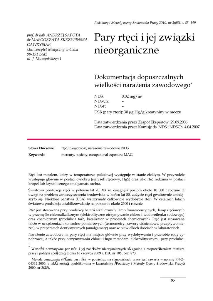 Podstawy i Metody oceny Środowiska Pracy 2010, nr 3(65), s. 85–149 prof. dr hab. ANDRZEJ SAPOTA dr MAŁGORZATA SKRZYPIŃSKAGAWRYSIAK Uniwersytet Medyczny w Łodzi 90-151 Łódź ul. J. Muszyńskiego 1 Pary rtęci i jej związki nieorganiczne Dokumentacja dopuszczalnych wielkości narażenia zawodowego*† NDS: 0,02 mg/m3 NDSCh: – NDSP: – DSB (pary rtęci): 30 mg Hg/g kreatyniny w moczu Data zatwierdzenia przez Zespół Ekspertów: 29.09.2006 Data zatwierdzenia przez Komisję ds. NDS i NDSCh: 4.04.2007 Słowa kluczowe: rtęć, toksyczność, narażenie zawodowe, NDS. Keywords: mercury, toxicity, occupational exposure, MAC. Rtęć jest metalem, który w temperaturze pokojowej występuje w stanie ciekłym. W przyrodzie występuje głównie w postaci cynobru (siarczek rtęciowy, HgS) oraz jako rtęć rodzima w postaci kropel lub krystalicznego amalgamatu srebra. Światowa produkcja rtęci w połowie lat 70. XX w. osiągnęła poziom około 10 000 t rocznie. Z uwagi na problem zanieczyszczenia środowiska w końcu lat 80. zużycie rtęci gwałtownie zmniejszyło się. Niektóre państwa (USA) wstrzymały całkowicie wydobycie rtęci. W ostatnich latach światowa produkcja ustabilizowała się na poziomie około 2500 t rocznie. Rtęć jest stosowana przy produkcji baterii alkalicznych, lamp fluorescencyjnych, lamp rtęciowych w przemyśle chloroalkalicznym (elektrolityczne otrzymywanie chloru i wodorotlenku sodowego) oraz chemicznym (produkcja farb, katalizator w procesach chemicznych). Rtęć jest stosowana także w urządzeniach kontrolno-pomiarowych (termometry, zawory ciśnieniowe, przepływomierze), w preparatach dentystycznych (amalgamaty) oraz w niewielkich ilościach w laboratoriach. Narażenie zawodowe na pary rtęci ma miejsce głównie przy wydobywaniu i przerobie rudy cynobrowej, a także przy otrzymywaniu chloru i ługu metodami elektrolitycznymi, przy produkcji * Wartości normatywne par rtęci i jej związków nieorganicznych są zgodne z rozporządzeniem ministra pracy i polityki społecznej z dnia 16 czerwca 2009 r. DzU nr 105, poz. 873. Metoda oznaczania stężenia par rtęci w powietrzu na stanowiskach pracy jest zawarta w normie PN-Z04332:2006, a także została opublikowana w kwartalniku „Podstawy i Metody Oceny Środowiska Pracy” 2000, nr 3(25). 85 stopów metali, barwników, fungicydów oraz przy produkcji i obsłudze takich przyrządów wypełnionych rtęcią, jak np.: przepływomierze, różnego rodzaju aparatura pomiarowa, termometry, barometry, prostowniki. Narażeni na rtęć są również pracownicy laboratoriów, pracowni naukowych, gabinetów dentystycznych i zakładów fotograficznych. W zakładach przemysłu chloroalkalicznego w różnych państwach stężenie rtęci w powietrzu wynosiło < 10 ÷ 430 mg/m3. Obserwowane stężenia rtęci w moczu u pracowników tych zakładów wynosiły od 0 do około 750 mg/l. W warunkach przemysłowych narażenie dotyczy wyłącznie narażenia drogą inhalacyjną na pary rtęci. Inne nieorganiczne związki rtęci praktycznie nie stwarzają ryzyka przy narażeniu inhalacyjnym. Według danych stacji sanitarno-epidemiologicznych w 2007 r. na pary rtęci powyżej wartości najwyższego dopuszczalnego stężenia (NDS), tj. 0,025 mg/m3 było narażonych 48 pracowników przy produkcji wyrobów chemicznych. Dla nieorganicznych związków rtęci przekroczeń wartości NDS (0,05 mg/m3) nie zanotowano. Narządem krytycznym u ludzi w zatruciach ostrych parami rtęci są płuca. W przypadku narażenia zawodowego postać ostra występuje rzadko. Po narażeniu na pary rtęci o dużym stężeniu obserwowano wiele skutków ze strony układu nerwowego, m.in.: drżenia, chwiejność emocjonalną, bezsenność, zaburzenia pamięci, polineuropatie, zaburzenia w funkcjach poznawczych i motorycznych oraz zaburzenia widzenia. W przewlekłym narażeniu ludzi na rtęć i jej związki nieorganiczne obserwowano głównie skutki neurotoksyczne i nefrotoksyczne. Po narażeniu szczurów na pary rtęci o stężeniu 27 mg/m3 przez 2 h padło 20 z 30 zwierząt. Wartość DL50 dla szczurów po dożołądkowym podaniu chlorku rtęci(II) wynosi 25,9 mg Hg/kg. Na tej podstawie, zgodnie z klasyfikacją UE, rtęć i jej związki nieorganiczne można zaliczyć do związków toksycznych. W eksperymentach podprzewlekłych i przewlekłych nieorganiczne związki rtęci wykazywały głównie działanie nefrotoksyczne, zależnie od wielkości dawki. W ocenie działania rakotwórczego IARC zaklasyfikowała rtęć metaliczną i jej związki nieorganiczne do grupy 3., czyli związków nieklasyfikowanych pod względem działania rakotwórczego dla ludzi. W licznych doniesieniach wykazano, że chlorek rtęci(II) działał mutagennie, natomiast pary rtęci nie wykazywały takiego działania. Mimo że w przypadku narażenia ludzi dane na temat wpływu rtęci metalicznej i jej nieorganicznych związków na rozrodczość są niejednoznaczne, to jej wpływ na zwierzęta jest udowodniony. Ponadto, z uwagi na fakt, że rtęć przechodzi przez barierę łożyska, istnieją zalecenia, aby u kobiet w wieku rozrodczym maksymalnie ograniczyć narażenie na rtęć i jej związki. O ile większość danych uzyskanych na podstawie wyników badań przeprowadzonych na zwierzętach dotyczy badań nieorganicznych związków rtęci, zwłaszcza chlorku rtęci(II), to dane z badań epidemiologicznych dotyczą głównie narażenia zawodowego na pary rtęci. Nadmierne narażenie zawodowe na rtęć metaliczną (pary) i jej związki powoduje wystąpienie objawów psychiatrycznych, behawioralnych i neurologicznych i wiąże się również z uszkodzeniem nerek. Tak więc, krytycznymi narządami w przypadku chronicznego narażenia na rtęć i jej związki nieorganiczne są ośrodkowy układ nerwowy i nerki. Ustalenie zatem wartości NDS powinno dotyczyć takiej wartości stężeń, poniżej której nie pojawią się subkliniczne zmiany. Najwcześniejszymi obserwowanymi zmianami są zaburzenia neu