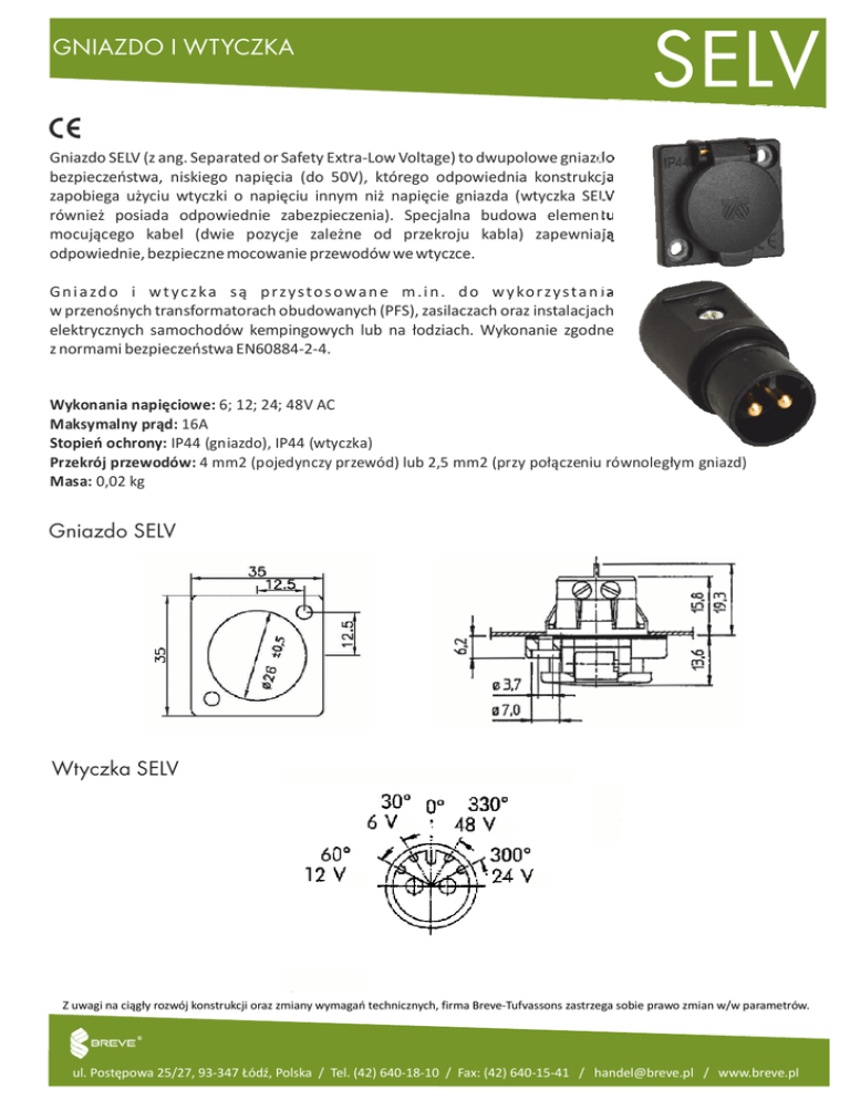 GNIAZDO I WTYCZKA SELV Gniazdo SELV (z ang. Separated or Safety Extra-Low Voltage) to dwupolowe gniazdo bezpieczeństwa, niskiego napięcia (do 50V), którego odpowiednia konstrukcja zapobiega użyciu wtyczki o napięciu innym niż napięcie gniazda (wtyczka SELV również posiada odpowiednie zabezpieczenia). Specjalna budowa elementu mocującego kabel (dwie pozycje zależne od przekroju kabla) zapewniają odpowiednie, bezpieczne mocowanie przewodów we wtyczce. G n i a zd o i w t y c z k a s ą p r z y s t o s o w a n e m . i n . d o w y ko r z y s t a n i a w przenośnych transformatorach obudowanych (PFS), zasilaczach oraz instalacjach elektrycznych samochodów kempingowych lub na łodziach. Wykonanie zgodne z normami bezpieczeństwa EN60884-2-4. Wykonania napięciowe: 6; 12; 24; 48V AC Maksymalny prąd: 16A Stopień ochrony: IP44 (gniazdo), IP44 (wtyczka) Przekrój przewodów: 4 mm2 (pojedynczy przewód) lub 2,5 mm2 (przy połączeniu równoległym gniazd) Masa: 0,02 kg Gniazdo SELV Wtyczka SELV Z uwagi na ciągły rozwój konstrukcji oraz zmiany wymagań technicznych, firma Breve-Tufvassons zastrzega sobie prawo zmian w/w parametrów. ul. Postępowa 25/27, 93-347 Łódź, Polska / Tel. (42) 640-18-10 / Fax: (42) 640-15-41 / [email protected] / www.breve.pl