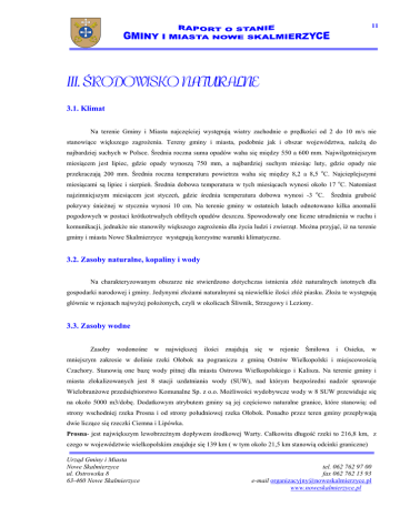 11 III. ŚRODOWISKO NATURALNE 3.1. Klimat Na terenie Gminy i Miasta najczęściej występują wiatry zachodnie o prędkości od 2 do 10 m/s nie stanowiące większego zagroŜenia. Tereny gminy i miasta, podobnie jak i obszar województwa, naleŜą do najbardziej suchych w Polsce. Średnia roczna suma opadów waha się między 550 a 600 mm. Najwilgotniejszym miesiącem jest lipiec, gdzie opady wynoszą 750 mm, a najbardziej suchym miesiąc luty, gdzie opady nie przekraczają 200 mm. Średnia roczna temperatura powietrza waha się między 8,2 a 8,5 oC. Najcieplejszymi miesiącami są lipiec i sierpień. Średnia dobowa temperatura w tych miesiącach wynosi około 17 oC. Natomiast najzimniejszym miesiącem jest styczeń, gdzie średnia temperatura dobowa wynosi -3 oC. Średnia grubość pokrywy śnieŜnej w styczniu wynosi 10 cm. Na terenie gminy w ostatnich latach odnotowano kilka anomalii pogodowych w postaci krótkotrwałych obfitych opadów deszczu. Spowodowały one liczne utrudnienia w ruchu i komunikacji, jednakŜe nie stanowiły większego zagroŜenia dla Ŝycia ludzi i zwierząt. MoŜna przyjąć, iŜ na terenie gminy i miasta Nowe Skalmierzyce występują korzystne warunki klimatyczne. 3.2. Zasoby naturalne, kopaliny i wody Na charakteryzowanym obszarze nie stwierdzono dotychczas istnienia złóŜ naturalnych istotnych dla gospodarki narodowej i gminy. Jedynymi złoŜami naturalnymi są niewielkie ilości złóŜ piasku. ZłoŜa te występują głównie w rejonach najwyŜej połoŜonych, czyli w okolicach Śliwnik, Strzegowy i Leziony. 3.3. Zasoby wodne Zasoby wodonośne w największej ilości znajdują się w rejonie Śmiłowa i Osieka, w mniejszym zakresie w dolinie rzeki Ołobok na pograniczu z gminą Ostrów Wielkopolski i miejscowością Czachory. Stanowią one bazę wody pitnej dla miasta Ostrowa Wielkopolskiego i Kalisza. Na terenie gminy i miasta zlokalizowanych jest 8 stacji uzdatniania wody (SUW), nad którym bezpośredni nadzór sprawuje WielobranŜowe przedsiębiorstwo Komunalne Sp. z o.o. MoŜliwości wydobywcze wody w 8 SUW przewiduje się na około 5000 m3/dobę. Dodatkowym atrybutem gminy są jej częściowo naturalne granice, które stanowią: od strony wschodniej rzeka Prosna i od strony południowej rzeka Ołobok. Ponadto przez teren gminy przepływają dwie liczące się rzeczki Ciemna i Lipówka. Prosna- jest największym lewobrzeŜnym dopływem środkowej Warty. Całkowita długość rzeki to 216,8 km, z czego w województwie wielkopolskim znajduje się 139 km ( w tym około 21,5 km stanowią odcinki graniczne) Urząd Gminy i Miasta Nowe Skalmierzyce ul. Ostrowska 8 63-460 Nowe Skalmierzyce tel. 062 762 97 00 fax 062 762 15 93 e-mail [email protected] www.noweskalmierzyce.pl 12 Ołobok – lewobrzeŜny dopływ Prosny. Ma długość 36,5 km. Ciemna – jest lewobrzeŜnym dopływem Prosny o długości 20 km i powierzchni zalewni 123,7 km2. Rzeka bierze swój początek w okolicach Czachór, uchodzi do Prosny w 45 km jej biegu. W 5,6 km biegu rzeki usytuowany jest zbiornik retencyjny Gołuchów o powierzchni 51,5 ha. ZagroŜeniem wód rzeki są ścieki z zakładów rolnych w Kotowiecku i Sobótce oraz miejscowości Jedlec i Gołuchów. 3.4. Zasoby przyrodnicze, krajobrazowe Na terenie gminy Nowe Skalmierzyce został ustanowiony obszar chronionego krajobrazu obejmujący dolinę rzek Ołoboku i Prosny oraz południową część doliny Ciemnej. LeŜą tam grunty wsi Biskupice Ołob., Śliwnik, Leziony, Śmiłowa i Osieka. Łączna ich powierzchnia wynosi 838 ha, co stanowi 6,70 % obszaru gminy, w tym: • 735 ha grunty orne, • 43 ha lasy, • 25 ha łąki, • 10 ha wody, • 25 ha pozostałe tereny. Występujące w tym rejonie łąki mają podłoŜe torfowe i zaliczane są do łąk naturalnych. Znajdujące się tu wielkie zbiorniki wodne oraz skupisko róŜnorodnej roślinności sprzyjają gnieŜdŜeniu się chronionych gatunków ptactwa a w szczególności derkacza. Oprócz chronionego krajobrazu na terenie gminy występują pomniki przyrody mające wartość pamiątkową i krajobrazową. Zalicza się do nich pomajątkowy XIX-wieczny park w Śmiłowie o powierzchni 6,28 ha, który stanowi własność Skarbu Państwa. Teren parku jest falisty i przylega równolegle do wysokiego brzegu Prosny. MoŜna w nim spotkać potęŜne dęby szypułkowe dochodzące w obwodzie do 6 m, okazałe lipy drobnolistne w obwodach do 4 m, a takŜe świerki pospolite, wejmutki, daglezje, jesiony, jawory i inne. Bogata szata roślinna oraz wyjątkowo malowniczy krajobraz przyciąga wiele osób na niedzielny odpoczynek. Na terenie gminy znajdują się równieŜ pomajątkowe zabytkowe parki w Chotowie, Kotowiecku, Miedzianowie i Śliwnikach oraz wiejskie parki w Boczkowie, OciąŜu, Kurowie, Czachorach i Gostyczynie. Poza tym w Gałązkach Wielkich, Gałązkach Małych, Mącznikach i Osieku występują zespoły zadrzewieniowe o charakterze parkowym. Nie są one jednak ujęte w rejestrze zabytków ani teŜ w Uchwale Wojewódzkiej Rady Narodowej w Kaliszu o uznaniu terenów zadrzewionych jako parki wiejskie. Wymienione wyŜej parki są zniszczone, zaniedbane i utraciły dawną świetność. We wszystkich tych parkach jak i na terenach zadrzewionych występuje starodrzew z gatunkami drzew rodzimych głównie lipy drobnolistnej, lipy szerokolistnej, dębów szypułkowych, świerków, jesionów, klonów, Urząd Gminy i Miasta Nowe Skalmierzyce ul. Ostrowska 8 63-460 Nowe Skalmierzyce tel. 062 762 97 00 fax 062 762 15 93 e-mail [email protected] www.noweskalmierzyce.pl 13 buków, jaworów, grabów, wiązów, rzadko innych drzew. W kilku parkach rosną pojedyncze okazy sędziwych drzew, które ujęto w rejestrze pomników przyrody. NaleŜą do nich: • w Chotowie 3 dęby szypułkowe o obwodach ponad 5m oraz aleja grabowa o dł. ok. 100 m. • w Czachorach -1 białodrzew o obwodzie 6,40 m oraz 1 platan klonolistny o obwodzie 4,18 m i 3 dęby szypułkowe o obwodach do 5m. • w OciąŜu 2 dęby sz
