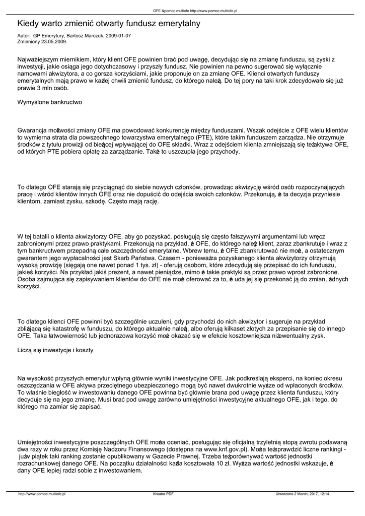 OFE &pomoc multiofe http://www.pomoc.multiofe.pl Kiedy warto zmienić otwarty fundusz emerytalny Autor: GP Emerytury, Bartosz Marczuk, 2009-01-07 Zmieniony 23.05.2009. Najważniejszym miernikiem, który klient OFE powinien brać pod uwagę, decydując się na zmianę funduszu, są zyski z inwestycji, jakie osiąga jego dotychczasowy i przyszły fundusz. Nie powinien na pewno sugerować się wyłącznie namowami akwizytora, a co gorsza korzyściami, jakie proponuje on za zmianę OFE. Klienci otwartych funduszy emerytalnych mają prawo w każdej chwili zmienić fundusz, do którego należą. Do tej pory na taki krok zdecydowało się już prawie 3 mln osób. Wymyślone bankructwo Gwarancja możliwości zmiany OFE ma powodować konkurencję między funduszami. Wszak odejście z OFE wielu klientów to wymierna strata dla powszechnego towarzystwa emerytalnego (PTE), które takim funduszem zarządza. Nie otrzymuje środków z tytułu prowizji od bieżącej wpływającej do OFE składki. Wraz z odejściem klienta zmniejszają się też aktywa OFE, od których PTE pobiera opłatę za zarządzanie. Także to uszczupla jego przychody. To dlatego OFE starają się przyciągnąć do siebie nowych członków, prowadząc akwizycję wśród osób rozpoczynających pracę i wśród klientów innych OFE oraz nie dopuścić do odejścia swoich członków. Przekonują, że ta decyzja przyniesie klientom, zamiast zysku, szkodę. Często mają rację. W tej batalii o klienta akwizytorzy OFE, aby go pozyskać, posługują się często fałszywymi argumentami lub wręcz zabronionymi przez prawo praktykami. Przekonują na przykład, że OFE, do którego należy klient, zaraz zbankrutuje i wraz z tym bankructwem przepadną całe oszczędności emerytalne. Wbrew temu, że OFE zbankrutować nie może, a ostatecznym gwarantem jego wypłacalności jest Skarb Państwa. Czasem - ponieważ za pozyskanego klienta akwizytorzy otrzymują wysoką prowizję (sięgają one nawet ponad 1 tys. zł) - oferują osobom, które zdecydują się przepisać do ich funduszu, jakieś korzyści. Na przykład jakiś prezent, a nawet pieniądze, mimo że takie praktyki są przez prawo wprost zabronione. Osoba zajmująca się zapisywaniem klientów do OFE nie może oferować za to, że uda jej się przekonać ją do zmian, żadnych korzyści. To dlatego klienci OFE powinni być szczególnie uczuleni, gdy przychodzi do nich akwizytor i sugeruje na przykład zbliżającą się katastrofę w funduszu, do którego aktualnie należą, albo oferują kilkaset złotych za przepisanie się do innego OFE. Taka łatwowierność lub jednorazowa korzyść może okazać się w efekcie kosztowniejsza niż ewentualny zysk. Liczą się inwestycje i koszty Na wysokość przyszłych emerytur wpłyną głównie wyniki inwestycyjne OFE. Jak podkreślają eksperci, na koniec okresu oszczędzania w OFE aktywa przeciętnego ubezpieczonego mogą być nawet dwukrotnie wyższe od wpłaconych środków. To właśnie biegłość w inwestowaniu danego OFE powinna być głównie brana pod uwagę przez klienta funduszu, który decyduje się na jego zmianę. Musi brać pod uwagę zarówno umiejętności inwestycyjne aktualnego OFE, jak i tego, do którego ma zamiar się zapisać. Umiejętności inwestycyjne poszczególnych OFE można oceniać, posługując się oficjalną trzyletnią stopą zwrotu podawaną dwa razy w roku przez Komisję Nadzoru Finansowego (dostępna na www.knf.gov.pl). Można też sprawdzić liczne rankingi już w piątek taki ranking zostanie opublikowany w Gazecie Prawnej. Trzeba też porównywać wartość jednostki rozrachunkowej danego OFE. Na początku działalności każda kosztowała 10 zł. Wyższa wartość jednostki wskazuje, że dany OFE lepiej radzi sobie z inwestowaniem. http://www.pomoc.multiofe.pl Kreator PDF Utworzono 2 March, 2017, 12:14 OFE &pomoc multiofe http://www.pomoc.multiofe.pl Kolejny ważny element to koszty, jakie ponosi uczestnik OFE. Im droższy jest fundusz, tym mniej pieniędzy pozostaje na jego rachunku. Liczy się tutaj wysokość prowizji od wpływającej do funduszu składki (jest pobierana bezpośrednio z pieniędzy wpływających do OFE z ZUS) oraz tzw. opłata za zarządzanie (pobierana od aktywów funduszu). Do kwietnia 2004 r. OFE konkurowały ze sobą wysokością prowizji od składki. Same ustalały ich wysokość. Większość redukowała je w miarę upływu czasu, w którym klient należał do OFE. Zmiana przepisów, obowiązująca od 2004 r., określiła maksymalne limity opłaty od składki. Docelowo, ale dopiero od 1 stycznia 2014 r., OFE nie będą mogły z pieniędzy przekazywanych im z ZUS zabrać więcej niż 3,5 proc. Do tej daty maksymalny limit opłaty wynosi: od kwietnia 2004 r. do 2010 roku 7 proc., od 2011 roku 6,125 proc., od 2012 roku 5,25 proc., od 2013 roku 4,375 proc. Niestety, wraz ze zmianą przepisów wszystkie OFE (poza Allianz Polska OFE) ustaliły wysokość prowizji na maksymalnym dopuszczalnym 7-proc. poziomie. Wysokość prowizji jest szczególnie istotna dla osób, które zamierzają zmienić OFE. Jeśli zyskały już w swoim funduszu prawo do niższej prowizji, może się okazać, że w nowym OFE będą ją płacić na wyższym poziomie. Także wysokość opłaty za zarządzanie, pobieranej przez PTE z aktywów OFE, czyli pieniędzy przyszłych emerytów, większość OFE ustaliła na maksymalnie wysokim poziomie. Wysokość tej opłaty jest więc dla klienta OFE, decydującego się na zmianę, neutralna. Wybierając nowe OFE, powinno się brać pod uwagę dostępność danego funduszu (czy na przykład posiada infolinię), doświadczenie jego akcjonariuszy w zarządzaniu pieniędzmi, łatwość sprawdzania stanu swojego konta emerytalnego (na przykład możliwość robienia tego przez internet) czy korygowania danych osobowych. Ile kosztuje zmiana Klient OFE może zmienić dotychczasowy OFE przed upływem 2-letniego stażu członkowskiego, pod warunkiem że sam z własnych pieni