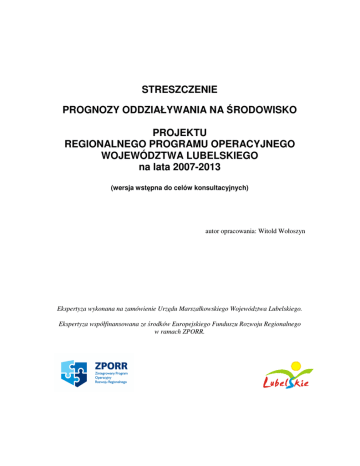STRESZCZENIE PROGNOZY ODDZIAŁYWANIA NA ŚRODOWISKO PROJEKTU REGIONALNEGO PROGRAMU OPERACYJNEGO WOJEWÓDZTWA LUBELSKIEGO na lata 2007-2013 (wersja wstępna do celów konsultacyjnych) autor opracowania: Witold Wołoszyn Ekspertyza wykonana na zamówienie Urzędu Marszałkowskiego Województwa Lubelskiego. Ekspertyza współfinansowana ze środków Europejskiego Funduszu Rozwoju Regionalnego w ramach ZPORR. LUBLIN, sierpień 2006 Zamieszczone w niniejszym opracowaniu opinie i poglądy odzwierciedlają stanowisko autora a nie Zamawiającego. SPIS TREŚCI I. Wprowadzenie…………………………………………………………………………...... I.1. Podstawy formalno-prawne............................................................................................. I.2. Cel i zakres prognozy...................................................................................................... I.3. Generalne założenia metodyczne.................................................................................... I.4. Konsultacje społeczne projektu RPO…………………………………………………... II. Charakterystyka projektu Regionalnego Programu Operacyjnego…….…................ III. Główne cechy rozwoju społeczno gospodarczego i stan środowiska regionu – synteza............................................................................................................................. IV. Projekt RPO w kontekście najistotniejszych dokumentów strategicznych na poziomie krajowym i regionalnym…………………...…………………………………….. V. Potencjalne znaczące oddziaływania realizacji RPO na środowisko……………….... V.1. Oddziaływania negatywne.............................................................................................. V.2. Oddziaływania pozytywne............................................................................................. VI. Wnioski i rekomendacje................................................................................................... 3 3 4 4 6 7 10 11 12 12 12 13 2 I. Wprowadzenie I.1. Podstawy formalno-prawne Podstawę prawną przeprowadzenia postępowania w sprawie oceny oddziaływania na środowisko (OOŚ) projektu „Regionalnego Programu Operacyjnego Województwa Lubelskiego” (zwany dalej RPO) stanowi art. 40 ustawy z dnia 27 kwietnia 2001 r. Prawo ochrony środowiska (Dz.U. Nr 62 z dnia 20 czerwca 2001 r., poz. 627 z późn. zmianami). Ustawa Prawo ochrony środowiska koresponduje z wymaganiami Unii Europejskiej z zakresu ocen oddziaływania projektów dokumentów strategicznych na środowisko, które określone zostały w dyrektywach: - 2001/42/WE z dnia 27 czerwca 2001 r. w sprawie oceny wpływu niektórych planów i programów na środowisko, - 2003/4/WE w sprawie publicznego dostępu do informacji dotyczących środowiska. - 2003/35/WE z dnia 26 maja 2003 r. przewidująca udział społeczeństwa w odniesieniu do sporządzania niektórych planów i programów w zakresie środowiska oraz zmieniająca w odniesieniu do udziału społeczeństwa i dostępu do wymiaru sprawiedliwości dyrektywy Rady 85/337/EWG i 96/61/WE (obowiązuje od 25 czerwca 2003 r.). Dokument, który powstaje w trakcie postępowania w sprawie OOŚ projektu dokumentu o charakterze strategicznym nosi nazwę „prognozy oddziaływania na środowisko”. Procedura postępowania w sprawie oceny oddziaływania na środowisko projektu RPO składa się z następujących etapów: 1) Ustalenie zakresu i stopnia szczegółowości informacji wymaganych w prognozie. Ustalenie zakresu merytorycznego prognozy następuje na drodze uzgodnienia z Wojewodą Lubelskim oraz Państwowym Wojewódzkim Inspektorem Sanitarnym. (art. 42.1 Poś). 2) Sporządzenie dokumentu „Prognozy oddziaływania na środowisko” (art. 41.1 Poś). 3) Opiniowanie projektu RPO wraz z „Prognozą”: • wydanie opinii przez Wojewodę Lubelskiego oraz Państwowego Wojewódzkiego Inspektora Sanitarnego w Lublinie (art. 43.1 Poś), • zapewnienie udziału społeczeństwa w postępowaniu w sprawie oceny oddziaływania na środowisko projektu RPO (art. 43.2 Poś): 4) Sporządzenie końcowej wersji Prognozy – uwzględnienie uwag zgłoszonych przez Wojewodę Lubelskiego oraz Państwowego Wojewódzkiego Inspektora Sanitarnego, a także uwag wynikających z konsultacji społecznych (etap związany z zasadami dobrej praktyki), 5) Podanie do publicznej wiadomości informacji o zgłoszonych uwagach, wnioskach oraz o sposobie ich wykorzystania w ostatecznej wersji dokumentu RPO (art. 34.2 Poś). 3 Do przyjętego dokumentu RPO należy załączyć pisemne informacje o sposobie wykorzystania (art. 44.2 Poś): 1) ustaleń zawartych w prognozie oddziaływania na środowisko, 2) opinii i uzgodnień organu ochrony środowiska oraz organu, o którym mowa w art. 45 ustawy Poś, 3) wyników udziału społeczeństwa, 4) informacji o metodach i częstotliwości przeprowadzania analizy realizacji postanowień dokumentu. I.2. Cel i zakres prognozy Generalnymi celami prognozy są: • określenie stopnia spójności założeń i celów projektu RPO z założeniami i wytycznymi polityki ekologicznej w Polsce oraz w Unii Europejskiej; • analiza spójności priorytetów i działań z odpowiednimi dokumentami wyższego rzędu (Strategia Rozwoju Kraju, Narodowe Strategiczne Ramy Odniesienia – Narodowa Strategia Spójności) • ocena potencjalnych znaczących zagrożeń dla środowiska wynikających z realizacji postanowień zawartych w projekcie RPO; • wskazanie możliwości ograniczania potencjalnych znaczących oddziaływań na środowisko wynikających z realizacji ustaleń RPO; • przedstawienie rekomendacji dotyczących monitorowania wdrażania postanowień ujętych w projekcie RPO. Zakres zagadnień, które należy uwzględnić w prognozie określa art. 41.2 ustawy Poś. Przepisy te zostały uszczegółowione w wyniku wydanych uzgodnień dotycząc