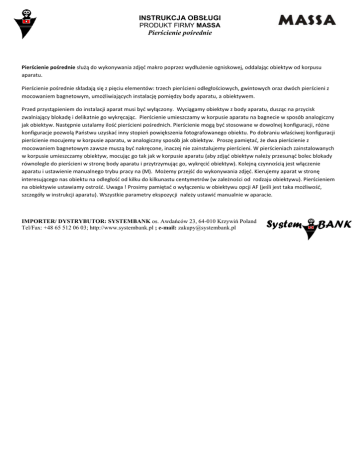 INSTRUKCJA OBSŁUGI PRODUKT FIRMY MASSA Pierścienie pośrednie Pierścienie pośrednie służą do wykonywania zdjęć makro poprzez wydłużenie ogniskowej, oddalając obiektyw od korpusu aparatu. Pierścienie pośrednie składają się z pięciu elementów: trzech pierścieni odległościowych, gwintowych oraz dwóch pierścieni z mocowaniem bagnetowym, umożliwiających instalację pomiędzy body aparatu, a obiektywem. Przed przystąpieniem do instalacji aparat musi być wyłączony. Wyciągamy obiektyw z body aparatu, dusząc na przycisk zwalniający blokadę i delikatnie go wykręcając. Pierścienie umieszczamy w korpusie aparatu na bagnecie w sposób analogiczny jak obiektyw. Następnie ustalamy ilość pierścieni pośrednich. Pierścienie mogą być stosowane w dowolnej konfiguracji, różne konfiguracje pozwolą Państwu uzyskać inny stopień powiększenia fotografowanego obiektu. Po dobraniu właściwej konfiguracji pierścienie mocujemy w korpusie aparatu, w analogiczny sposób jak obiektyw. Proszę pamiętać, że dwa pierścienie z mocowaniem bagnetowym zawsze muszą być nakręcone, inaczej nie zainstalujemy pierścieni. W pierścieniach zainstalowanych w korpusie umieszczamy obiektyw, mocując go tak jak w korpusie aparatu (aby zdjąć obiektyw należy przesunąć bolec blokady równolegle do pierścieni w stronę body aparatu i przytrzymując go, wykręcić obiektyw). Kolejną czynnością jest włączenie aparatu i ustawienie manualnego trybu pracy na (M). Możemy przejść do wykonywania zdjęć. Kierujemy aparat w stronę interesującego nas obiektu na odległość od kilku do kilkunastu centymetrów (w zależności od rodzaju obiektywu). Pierścieniem na obiektywie ustawiamy ostrość. Uwaga ! Prosimy pamiętać o wyłączeniu w obiektywu opcji AF (jeśli jest taka możliwość, szczegóły w instrukcji aparatu). Wszystkie parametry ekspozycji należy ustawić manualnie w aparacie. IMPORTER/ DYSTRYBUTOR: SYSTEMBANK os. Awdańców 23, 64-010 Krzywiń Poland Tel/Fax: +48 65 512 06 03; http://www.systembank.pl ; e-mail: [email protected]
