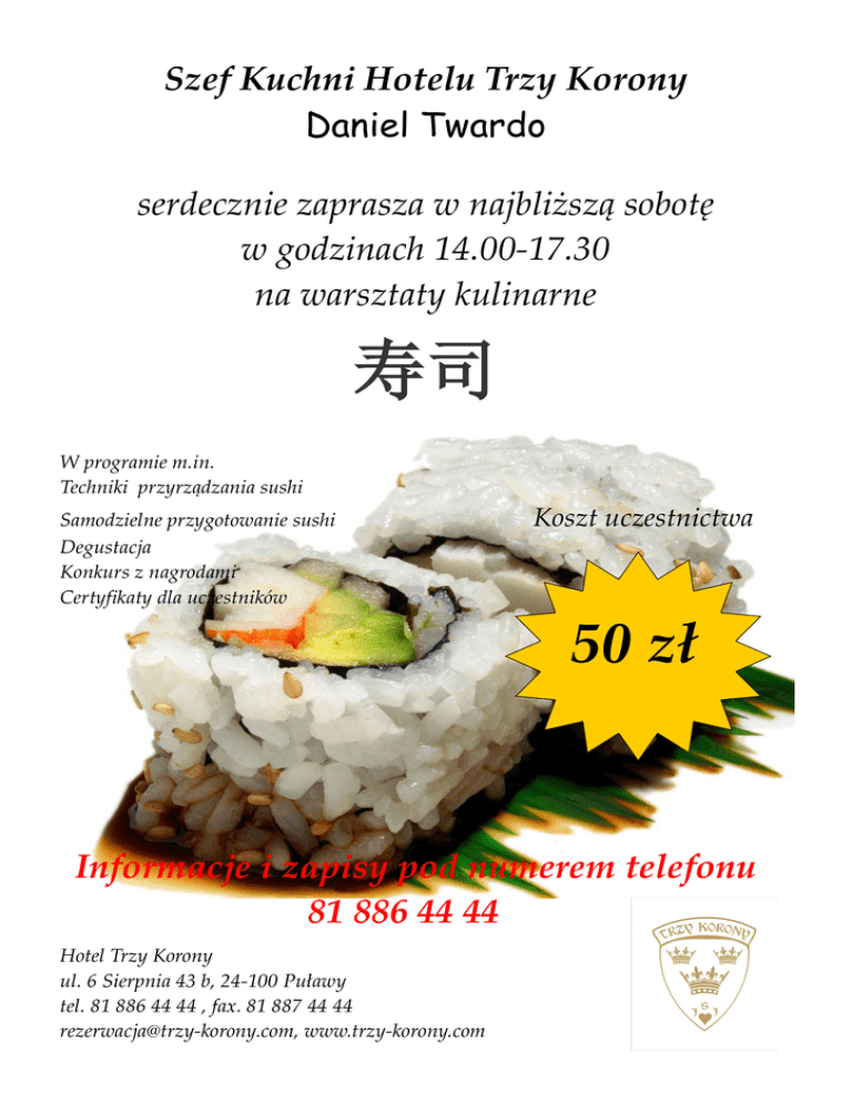 Szef Kuchni Hotelu Trzy Korony Daniel Twardo serdecznie zaprasza w najbliższą sobotę w godzinach 14.00-17.30 na warsztaty kulinarne 寿司 W programie m.in. Techniki przyrządzania sushi Samodzielne przygotowanie sushi Degustacja Konkurs z nagrodami Certyfikaty dla uczestników Koszt uczestnictwa 50 zł Informacje i zapisy pod numerem telefonu 81 886 44 44 Hotel Trzy Korony ul. 6 Sierpnia 43 b, 24-100 Puławy tel. 81 886 44 44 , fax. 81 887 44 44 [email protected], www.trzy-korony.com