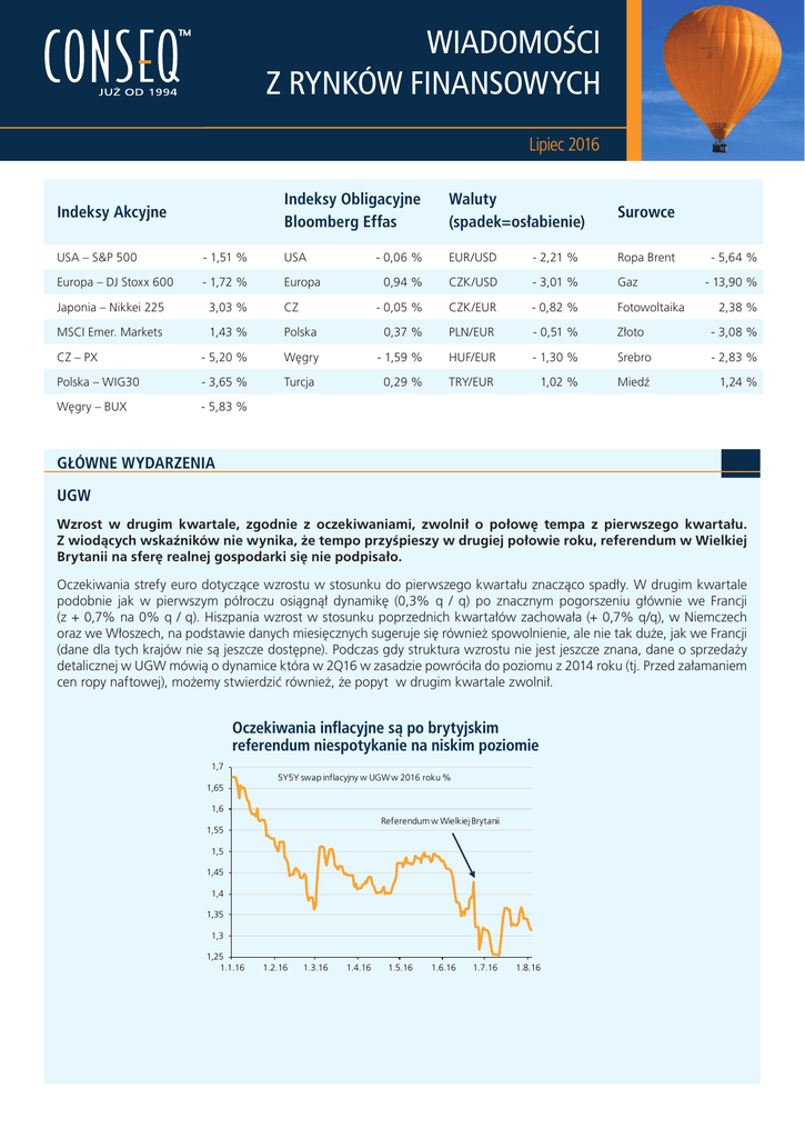 I N V E S T I Č NWIADOMOŚCI Í PROGRAM Z RYNKÓW FINANSOWYCH HORIZONT INVEST Informace o produktu Lipiec 2016 Program Horizont Invest je inspirován životem. V mládí je plný dravosti a energie, s přibývajícím Indeksy Obligacyjne Waluty stářím preferuje jistoty a bezpečí. V počátku je koncipován razantněji (silnější zastoupení investic Indeksy Akcyjne Surowce Bloomberg Effas (spadek=osłabienie) s vyšším výnosem a rizikem), s blížícím se závěrem programu se pak poměr investic mění ve prospěch- konzervativních, jejichž investiční riziko (a výnos) jsou nižší. USA – S&P 500 1,51 % USA - 0,06 % EUR/USD - 2,21 % Ropa Brent - 5,64 % Europa – DJ Stoxx 600 - 1,72 % - 3,01 % Gaz - 13,90 % Program Horizont Invest vám věkem a blížícím se závěrem pomůže jednoduše investovat Fotowoltaika programu se pak 2,38 zastoupení Japonia – Nikkei 225 3,03 % CZ - 0,05 % CZK/EUR - 0,82 % % a zvýšit tak potenciál zhodno- rizikovějších investic snižuje MSCI Emer. Markets 1,43 % Polska 0,37 % PLN/EUR - 0,51 % peněz. Złoto - 3,08 % cení vašich uspořených a jsou nahrazovány investicemi Současně je ale- 1,30 navržen konzervativními, -jejichž invesCZ – PX - 5,20 % Węgry - 1,59 % HUF/EUR % tak, aby Srebro 2,83 % maximálně stabilizoval a chránil tiční riziko (a výnos) jsou nižší. Polska – WIG30 - 3,65 % Turcja 0,29 % TRY/EUR % Miedź 1,24 % výnosy vložených1,02 investic. Atraktivní nástroj pro investováWęgry – BUX - 5,83 % ní z něj činí zejména možnost Program Horizont Invest vám pomůže řešit kombinovat investice s vyšším financování všech zásadních životních situací. výnosem s investicemi s nízkým Chcete své DĚTI vybavit do dospělého života? rizikem. Program je tak možné GŁÓWNE WYDARZENIA navrhnout podle vašich možOpravujete nebo kupujete váš nový DOMOV? ností, představ a potřeb. V počáUGW Potřebujete se zabezpečit na DŮCHOD? tečním období, kdy před sebou Wzrost w drugim zgodnie z oczekiwaniami, zwolniłmáte o połowę tempa z pierwszego kwartału. Nebokwartale, chcete vhodně investovat VOLNÉPROSTŘEDKY? dostatek času k překlenutí Z wiodących wskaźników nie wynika, że tempo przyśpieszy w drugiej połowie roku, referendum w Wielkiej • Dlouhodobé pravidelné investování převážně do rizikových Brytanii na sferęKteré realnej gospodarki się nie podpisało. portfolio je pro vás nejvhodnější? aktiv (zejména akciových fonOczekiwania strefyLišíeuro dotyczące wzrostua konzervativních w stosunku do pierwszego kwartału znacząco spadły. W kwartale dů)drugim zvyšuje potenciál zhodnose poměrem dynamických investičních podobnie jak w pierwszym półroczu osiągnął dynamikę (0,3% q / q) po znacznym pogorszeniu głównie we Francji nástrojů, ovšem u všech platí, že s přibližujícím se koncem cení úspor investora. (z + 0,7% na 0% programu q / q). Hiszpania wzrost w stosunku poprzednich w snižování Niemczech podíl dynamické složky klesá ve prospěch složky kwartałów zachowała (+ 0,7% q/q), • Postupné rizikovosti oraz we Włoszech,konzervativní. na podstawie danych miesięcznych sugeruje się również spowolnienie, ale nie tak duże, jak Francjiletech portfolia v we posledních (dane dla tych krajów nie są jeszcze dostępne). Podczas gdy struktura wzrostu nie jest jeszcze znana,programu dane o sprzedaży naopak chrání dříve Vyvážené detalicznej w UGW mówią o dynamice któraportfolio w 2Q16 w zasadzie powróciła do poziomu z 2014 roku (tj.dosažené Przed załamaniem výnosy a investovacen ropy naftowej),Investiční możemy stwierdzić również,min. że 5popyt w drugim kwartale zwolnił. né prostředky. horizont: doporučení let • Časový horizont lze navrhnout Riziko: střední (úroveň 3 z 5) případných výkyvů na trhu, je podle potřeb klienta, libovolVstupní poplatek: max. 4,0 % z hodnoty investice Oczekiwania inflacyjne są portfolia po brytyjskim program zahájen razantněji (silně ho průběžně upravovat Manažerský poplatek: max. 0,5 % ročně z objemu zastoupení investic s vyša celý program funguje zcela referendum niespotykanie na niskimnější poziomie Růstové portfolio ším výnosem a rizikem). Se zvyautomaticky bez nutnosti zá1,7 5Y5Y swap inflacyjny sahů ze strany investora. Investiční horizont: doporučení min. 8 wletUGW w 2016 roku % šující se investovanou částkou, Riziko: 1,65 střední až vysoké (úroveň 4 z 5) 1,6 Vstupní poplatek: max. 4,5 % z hodnoty investice Referendum w WielkiejPrávě Brytanii vám je určen program dlouhodobého Manažerský poplatek: max. 0,5 % ročně z objemu portfolia 1,55 1,5 Europa 0,94 % CZK/USD průběžného investování Horizont Invest. Dynamické portfolio Investiční 1,45 horizont: Riziko: 1,4 Vstupní poplatek: 1,35 Manažerský poplatek: doporučení min. 10 let vysoké (úroveň 5 z 5) max. 5 % z hodnoty investice max. 0,5 % ročně z objemu portfolia Základní informace Investiční manager: Conseq Investment Management, a. s. Min. pravidelná investice: 500 Kč / měsíc 1,3 1,25 1.1.16 1.2.16 1.3.16 1.4.16 1.5.16 1.6.16 1.7.16 1.8.16 IP_Horizont_Invest 9/13/11 6:28 PM Page 1 INVESTIČNÍ PROGRAM Lipiec 2016 INVEST WIADOMOŚCI ZHORIZONT RYNKÓW FINANSOWYCH GŁÓWNE WYDARZENIA Informace o produktu Program Horizont Invest je inspirován životem. V mládí je plný dravosti a energie, s přibývajícím stářím preferuje jistoty a bezpečí. V počátku je koncipován razantněji (silnější zastoupení investic s vyšším výnosem a rizikem), s blížícím se závěrem programu se pak poměr investic mění ve prospěch konzervativních, jejichž investiční riziko (a výnos) jsou nižší. POLSKA Program Horizont Invest vám pomůže jednoduše investovat a zvýšit tak potenciál zhodnocení vašich uspořených peněz. Současně je ale navržen tak, aby maximálně stabilizoval a chránil výnosy v