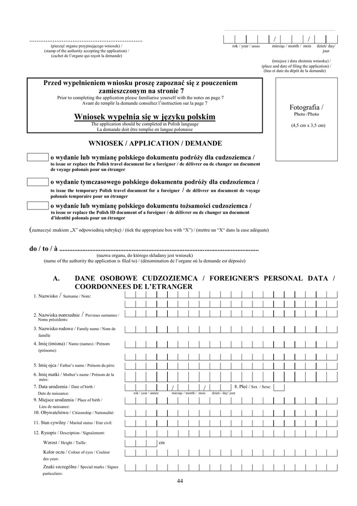 .................................................................................................................................................... ............................................................... / (pieczęć organu przyjmującego wniosek) / (stamp of the authority accepting the application) / (cachet de l’organe qui reçoit la demande) / miesiąc / month / mois rok / year / année dzień/ day/ jour (miejsce i data złożenia wniosku) / (place and date of filing the application) / (lieu et date du dépôt de la demande) Przed wypełnieniem wniosku proszę zapoznać się z pouczeniem zamieszczonym na stronie 7 Prior to completing the application please familiarise yourself with the notes on page 7 Avant de remplir la demande consultez l’instruction sur la page 7 Fotografia / Wniosek wypełnia się w języku polskim Photo /Photo The application should be completed in Polish language La demande doit être remplie en langue polonaise (4,5 cm x 3,5 cm) WNIOSEK / APPLICATION / DEMANDE o wydanie lub wymianę polskiego dokumentu podróży dla cudzoziemca / to issue or replace the Polish travel document for a foreigner / de délivrer ou de changer un document de voyage polonais pour un étranger o wydanie tymczasowego polskiego dokumentu podróży dla cudzoziemca / to issue the temporary Polish travel document for a foreigner / de délivrer un document de voyage polonais temporaire pour un étranger o wydanie lub wymianę polskiego dokumentu tożsamości cudzoziemca / to issue or replace the Polish ID document of a foreigner / de délivrer ou de changer un document d’identité polonais pour un étranger (zaznaczyć znakiem „X” odpowiednią rubrykę) / (tick the appropriate box with “X”) / (mettre un “X“ dans la case adéquate) do / to / à ......................................................................................................................... (nazwa organu, do którego składany jest wniosek) (name of the authority the application is filed to) / (dénomination de l’organe où la demande est déposée) A. 1. Nazwisko DANE OSOBOWE CUDZOZIEMCA / FOREIGNER'S PERSONAL DATA / COORDONNEES DE L’ETRANGER / Surname / Nom: 2. Nazwiska poprzednie Noms précédents: / Previous surnames / 3. Nazwisko rodowe / Family name / Nom de famille 4. Imię (imiona) / Name (names) / Prénom (prénoms): 5. Imię ojca / Father’s name / Prénom du père: 6. Imię matki / Mother’s name / Prénom de la mère: 7. Data urodzenia / Date of birth / Date de naissance: / rok / year / année / miesiąc / month / mois 9. Miejsce urodzenia / Place of birth / Lieu de naissance: 10. Obywatelstwo / Citizenship / Nationalité: 11. Stan cywilny / Marital status / Etat civil: 12. Rysopis / Description / Signalement: Wzrost / Height / Taille: cm Kolor oczu / Colour of eyes / Couleur des yeux: Znaki szczególne / Special marks / Signes particuliers: 44 8. Płeć / Sex / Sexe: dzień / day/ jour TOWARZYSZĄCE CUDZOZIEMCOWI JEGO DZIECI LUB INNI MAŁOLETNI ZNAJDUJĄCY SIĘ POD JEGO OPIEKĄ / CHILDREN AND OTHER INDIVIDUALS ENTERED INTO APPLICANT'S TRAVEL DOCUMENT INCLUDED UNDER THE APPLICATION / ENFANTS ET AUTRES PERSONNES MINEURES QUI ACCOMPAGNENT L’ETRANGER ET SE TROUVENT SOUS SA PROTECTION B. Imię i nazwisko / Name (names) and surname / Prénom (prénoms) et nom Płeć / Sex / Sexe Data i miejsce urodzenia / Year of birth / Date et lieu de naissance Stopień pokrewieństwa / Degree of kin / Degré de parenté 1. 2. 3. 4. 5. 6. 7. ADRES ZAMELDOWANIA NA POBYT STAŁY LUB POBYT CZASOWY TRWAJĄCY PONAD 2 MIESIĄCE / PERMANENT PLACE OF RESIDENCE OR TEMPORARY RESIDENCE LASTING OVER 2 MONTHS / DOMICILE IMMATRICULE POUR UN SEJOUR FIXE OU UN SEJOUR TEMPORAIRE DE PLUS DE 2 MOIS C. 1. Województwo / Province / Voïvodie: 2. Gmina / Municipality / Commune: 3. Miejscowość / Town / Localité: 4. Ulica / Street / Rue: 5. Numer domu / House Number / 6. Numer mieszkania / N° du bâtiment: Apartament Number / N° d’appartement: 7. Kod pocztowy / Postal code / Code postal: D. - RODZAJ DOKUMENTU / TYPE OF DOKUMENT / TYPE DE DOCUMENT Proszę o wydanie / I request to issue / Je demande de me délivrer: (zaznaczyć znakiem „X” odpowiednią rubrykę) / (tick the appropriate box with “X”) / (mettre un “X” dans la case adéquate) polskiego dokumentu podróży dla cudzoziemca / a) Polish travel document for a foreigner / un document de voyage polonais pour un étranger Oświadczam, że uzyskanie przeze mnie innego dokumentu podróży nie jest możliwe. I declare that it not possible for me to acquire another travel document. / Je déclare que l’obtention d’un autre document de voyage est pour moi impossible. Posiadam zezwolenie na osiedlenie się wydane przez / I have the settlement permit issued by / Je suis titulaire d’une autorisation d’établissement délivrée par: (nazwa organu) / (name of the authority) / dénomination de l’organe Data wydania / Date of issue / Délivré le: rok / year / année /miesiąc / month / mois/ dzień / day/ jour Karta pobytu / Residency card / Carte de séjour: Seria / Series Numer / Number / / Série: Numéro: Data wydania/ Date of issue / Délivré le: rok / year / année / / miesiąc / month / mois Data upływu ważności dzień / day / jour Organ wydający / Issuing authority / Délivré par: 45 / Expiry date / Expire le: rok / year / année / / miesiąc / month / mois dzień / day/ jour tymczasowego polskiego dokumentu podróży dla cudzoziemca / b) temporary Polish travel document for a foreigner / un document de voyage polonais temporaire pour un étranger w kraju / in Poland / en Pologne za granicą / abroad / à l’étranger Tak / Yes / Oui Nie / No / Non Posiadam zezwolenie na osiedlenie się wydane przez / I have the settlement permit issued by / Je suis titulaire d’une autorisation d’établissement délivrée par: (nazwa organu) / (name of the authority) / dénomination de l’organe Data wydania / Date of issue / Délivré le: rok 