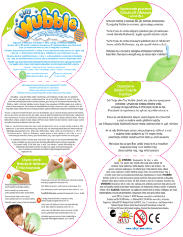 Spuszczanie powietrza Vyfouknutí/ Vyfúknutie Leeresztés Umieścić słomkę w zaworze tak, jak podczas pompowania. Ściśnij piłkę Wubble do momentu ujścia całego powietrza. 6+ bawisz sie ja nka, ao bublina, hrakj piłka! eš s i n k ba jak ím ja a ja ypadábublina, hráš sa s nou a ko V ko k lad u a g B b o ré k n a k t u n o l a b o s lopt s míc y rá da! ou! em W ze ! Vy Ban kopił ka Dziękujemy za zakup piłki Tiny Wubble ®! Mamy nadzieję, że uwielbiasz tę zabawkę tak samo jak my! Oto porady i wskazówki, które pomogą Ci rozpocząć zabawę, wraz z informacją o tym, jak bezpiecznie bawić się i dbać o swoją piłkę Tiny Wubble. Děkujeme, že jste si koupili Bublinomíč, a věříme, že se do něj zblázníte stejně jako my. Zde najdete rady a triky, jak si s Bublinomíčem začít hrát, jak si hrát bezpečně a jak o Bublinomíč pečovat. Ďakujeme, že ste si kúpili Bublinoloptu, a veríme, že sa do nej zbláznite rovnako ako my.Tu nájdete rady a triky, ako sa s Bublinoloptou začať hrať, ako sa hrať bezpečne a ako sa o Bublinoloptu starať. Vložte trysku do ventilu stejným způsobem jako při nafukování. Jemně stiskněte Bublinomíč, abyste vypustili všechen vzduch. Vložte trysku do ventilu rovnakým spôsobom ako pri nafukovaní. Jemne zatlačte Bublinoloptu, aby ste vypustili všetok vzduch. Helyezze be a fúvókát a szelepbe a felfújáskor leírtakhoz hasonlóan. Nyomja ki a levegőt amíg az összes kijön a labdából. Köszöjük, hogy az Apró Bubi Labdát választottad. Reméljük sok örömöd less benne, ugyanúgy, mint nekünk! Íme tippeket adunk, hogyan tudod legbiztonságosabban használni ügyelve Apró Bubi Labdádra. Zawartość: 1 Piłka Tiny Wubble, 1 słomka do pompowania Obsah: 1 Bublinomíč, 1 tryska / Obsah: 1 Bublinolopta, 1 tryska / Tartalma: 1 Apró Bubi Labda Piłka Tiny Wubble/ Bublinomíč Bublinolopta/ Apró Bubi Labda Słomka do pompowania Tryska/ Fúvóka Należy postępować zgodnie z instrukcją podczas napełniania Piłki Tiny Wubble. Nafoukněte správně Bublinomíč podle instrukcí. Nafúknite správne Bublinoloptu podľa inštrukcií. Felfújáshoz kövesd az útmutatót hogyan lehet rendesen felfújni az Apró Bubi Labdád. Jeśli zadbasz o swoją piłkę Wubble, będzie Ci służyć długo. Jeśli nie będziesz o nią dbał, może ulec uszkodzeniu! Ostry przedmiot, jak gałęzie drzewa i szorstkie powierzchnie, takie jak żwir, MOGĄ rozerwać lub uszkodzić Twoją piłkę Wubble! Nie zostawiaj swej piłki Wubble na zewnątrz wystawioną, przez dłuższy czas, na działanie promieni słonecznych. Piłki Wubble są miękkie i wytrzymałe! Jednakże, promienie słoneczne mogą spowodować, że Wubble rozgrzeje się za bardzo i jej powierzchnia stanie się krucha. Jeśli nie bawisz się swoją piłką Wubble schowaj ją w bezpiecznym miejscu, najlepiej w domu. Jeśli Twoja Wubble zostanie przebita (mały otwór) to można ją tymczasowo naprawić kawałkiem taśmy izolacyjnej lub innej mocnej taśmy klejącej. Pokud se o svůj Bublinomíč budete dobře starat, vydrží vám skutečně dlouho. Když se o něj starat nebudete, poškodí se. Ostré předměty, jako jsou větve stromů, nebo drsné povrchny, jako je štěrk, mohou váš Bublinomíč poškodit nebo zničit. Nenechávejte svůj Bublinomíč venku na přímém slunci po dlouhou dobu. Bublinomíč je měkký a silný, ale sluneční záření ho zahřeje a Bublinomíč zkřehne. Pokud si s Bublinomíčem nehrajete, bezpečně ho uložte, nejlépe uvnitř. Pokud se vám v Bublinomíči objeví malá dírka, můžete ho opravit kouskem lepicí pásky. Doporučujeme voděodolnou silnou lepící pásku. Pokiaľ sa o svoju Bublinoloptu budete dobre starať, vydrží vám skutočne dlho. Keď sa o ňu starať nebudete, poškodí sa. Ostré predmety, ako sú vetvy stromov, alebo drsné povrchy, ako je štrk, môžu vašu Bublinoloptu poškodiť alebo zničiť. Nenechávajte svoju Bublinoloptu vonku na priamom slnku dlhšiu dobu. Bublinolopta je mäkká a silná, ale slnečné žiarenie ju zahreje a Bublinolopta skrehne. Pokiaľ sa s Bublinoloptou nehráte, bezpečne ju uložte, najlepšie vo vnútri. Pokiaľ sa vám v Bublinolopte objaví malá dierka, môžete ju opraviť kúskom lepiacej pásky. Doporučujeme vodeodolnú silnú lepiacu pásku. Ha megfelelően használod a Bubidat igazán hosszan kitart majd, viszont, ha nem könnyen tönkreteheted! Éles tárgyak, mint faágak vagy dúrva kavicsos talaj tönkreteheti a Bubidat! Ne hagyd kint közvetlen napsütéskor a forró napokon sokáig. A Bubi labda puha, de erős! Ennek ellenére a napsütés felforrósíthatja és felrobbanthatja a Bubi labdát! Amennyiben nem játszol vele, legjobb, ha beviszed biztonságosabb helyre. Ha esetleg kis lyuk keletkezne a Bubi labdádon ragasztószalaggal beragaszthatod ideiglenesen vele. Użycie słomki Nafouknutí/ Nafúknutie Fúvóka használata 2 1 Przytrzymując mocno zawór piłki Wubble należy umieścić w nim słomkę, wciskając ją na głębokość mniej więcej 4-5cm. Nałożyć porcję wazeliny na bawełniany wacik (wacik i wazelina nie są częścią zestawu). Držte Bublinomíč za ventil a vsuňte trysku do ventilu zhruba 4 - 5 cm. Držte Bublinoloptu za ventil a vsuňte trysku do ventilu priblizne 4 - 5 cm. Pomocí vatové tyčinky naneste vazelínu (vatová tyčinka a vazelína nejsou součástí balení). Pomocou vatovej tyčinky naneste vazelínu (vatová tyčinka a vazelína nie sú súčasťou balenia). Használjon vazelint és tampon (ezek nem tartozékok). Tartsa BUBI labdát stabilan a szelepnél és helyezze bele 4-5 cm-re fúvókát. 3 Trzymając jedną dłonią Wubble, a drugą dyszę, należy nadmuchać piłkę aż osiągnie średnicę 30,5 cm. Jednou rukou držte Bublinomíč, druhou rukou trysku a foukejte dovnitř, dokud Bublinomíč nedosáhne průměru 30,5 cm. Jednou rukou držte Bublinoloptu, druhou rukou trysku a fúk