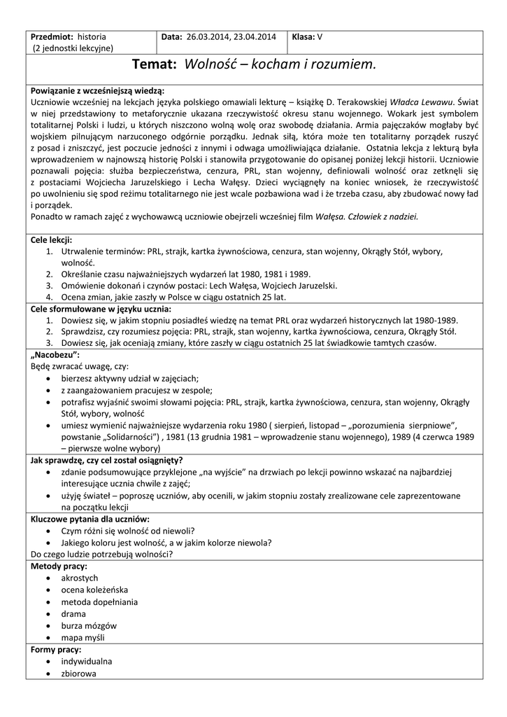 Przedmiot: historia (2 jednostki lekcyjne) Data: 26.03.2014, 23.04.2014 Klasa: V Temat: Wolność – kocham i rozumiem. Powiązanie z wcześniejszą wiedzą: Uczniowie wcześniej na lekcjach języka polskiego omawiali lekturę – książkę D. Terakowskiej Władca Lewawu. Świat w niej przedstawiony to metaforycznie ukazana rzeczywistość okresu stanu wojennego. Wokark jest symbolem totalitarnej Polski i ludzi, u których niszczono wolną wolę oraz swobodę działania. Armia pajęczaków mogłaby być wojskiem pilnującym narzuconego odgórnie porządku. Jednak siłą, która może ten totalitarny porządek ruszyć z posad i zniszczyć, jest poczucie jedności z innymi i odwaga umożliwiająca działanie. Ostatnia lekcja z lekturą była wprowadzeniem w najnowszą historię Polski i stanowiła przygotowanie do opisanej poniżej lekcji historii. Uczniowie poznawali pojęcia: służba bezpieczeństwa, cenzura, PRL, stan wojenny, definiowali wolność oraz zetknęli się z postaciami Wojciecha Jaruzelskiego i Lecha Wałęsy. Dzieci wyciągnęły na koniec wniosek, że rzeczywistość po uwolnieniu się spod reżimu totalitarnego nie jest wcale pozbawiona wad i że trzeba czasu, aby zbudować nowy ład i porządek. Ponadto w ramach zajęć z wychowawcą uczniowie obejrzeli wcześniej film Wałęsa. Człowiek z nadziei. Cele lekcji: 1. Utrwalenie terminów: PRL, strajk, kartka żywnościowa, cenzura, stan wojenny, Okrągły Stół, wybory, wolność. 2. Określanie czasu najważniejszych wydarzeń lat 1980, 1981 i 1989. 3. Omówienie dokonań i czynów postaci: Lech Wałęsa, Wojciech Jaruzelski. 4. Ocena zmian, jakie zaszły w Polsce w ciągu ostatnich 25 lat. Cele sformułowane w języku ucznia: 1. Dowiesz się, w jakim stopniu posiadłeś wiedzę na temat PRL oraz wydarzeń historycznych lat 1980-1989. 2. Sprawdzisz, czy rozumiesz pojęcia: PRL, strajk, stan wojenny, kartka żywnościowa, cenzura, Okrągły Stół. 3. Dowiesz się, jak oceniają zmiany, które zaszły w ciągu ostatnich 25 lat świadkowie tamtych czasów. „Nacobezu”: Będę zwracać uwagę, czy: bierzesz aktywny udział w zajęciach; z zaangażowaniem pracujesz w zespole; potrafisz wyjaśnić swoimi słowami pojęcia: PRL, strajk, kartka żywnościowa, cenzura, stan wojenny, Okrągły Stół, wybory, wolność umiesz wymienić najważniejsze wydarzenia roku 1980 ( sierpień, listopad – „porozumienia sierpniowe”, powstanie „Solidarności”) , 1981 (13 grudnia 1981 – wprowadzenie stanu wojennego), 1989 (4 czerwca 1989 – pierwsze wolne wybory) Jak sprawdzę, czy cel został osiągnięty? zdanie podsumowujące przyklejone „na wyjście” na drzwiach po lekcji powinno wskazać na najbardziej interesujące ucznia chwile z zajęć; użyję świateł – poproszę uczniów, aby ocenili, w jakim stopniu zostały zrealizowane cele zaprezentowane na początku lekcji Kluczowe pytania dla uczniów: Czym różni się wolność od niewoli? Jakiego koloru jest wolność, a w jakim kolorze niewola? Do czego ludzie potrzebują wolności? Metody pracy: akrostych ocena koleżeńska metoda dopełniania drama burza mózgów mapa myśli Formy pracy: indywidualna zbiorowa w zespołach Materiały i pomoce dydaktyczne: metodniki, patyczki z imionami uczniów, piosenka zespołu Chłopcy z Placu Broni Kocham Wolność, materiały edukacyjne uzyskane z Kancelarii Prezydenta RP , film fabularny „Wałęsa. Człowiek z nadziei” (2013) reż. Andrzej Wajda, podręcznik Wiesława Surdyk-Fertsch, Bogumiła Olszewska „My i historia. Historia i społeczeństwo 6” Demart, Warszawa 2006 (lub inne dostępne podręczniki opisujące podaną tematykę), interaktywna krzyżówka przygotowana w aplikacji LearningApps, iMindMap6 mobilna pracownia komputerowa, tablica multimedialna, kartki samoprzylepne w trzech kolorach (każdy kolor odpowiada innemu zdaniu podsumowującemu), arkusze szarego papieru, markery, schemat oceny koleżeńskiej. Notatki i dodatkowe ćwiczenia: notatkę stanowią wklejki z akrostychem, definicja wolności, wydruki mapy pamięci przygotowanych w programie iMindMap6, zapisy z metody dopełniania. Przebieg lekcji (metody, aktywności): (1. jednostka lekcyjna) 1. Powitanie. 2. Wysłuchanie piosenki zespołu Chłopcy z Placu Broni Kocham Wolność. 3. Swobodne wypowiedzi uczniów – refleksje po wysłuchaniu utworu. (nauczyciel szczególną uwagę uczniów zwraca na refren piosenki) 4. Akrostych. Uczniowie otrzymują kartki z napisanym pionowo słowem wolność (załącznik nr 1). Samodzielnie dopisują na nich swoje skojarzenia. Nauczyciel losuje patyczki z imionami uczniów. Wylosowane osoby odczytują swoje skojarzenia. Powtarzające się wyrazy nauczyciel zapisuje na tablicy. Na podstawie widocznych na tablicy słów uczniowie układają definicję wolności. 5. Zapisanie tematu lekcji. 6. Podanie celów zajęć w języku ucznia oraz „nacobezu” do lekcji. 7. Podział na grupy. Nauczyciel dzieli klasę na mniejsze grupy (uczniowie literują słowo W-O-L-N-O-Ś-Ć) 8. Praca w grupach. Uczniowie w zespołach pracują z wykorzystaniem mobilnej pracowni komputerowej. Na laptopach rozwiązują krzyżówkę, której hasłem końcowym jest stan wojenny. Nauczyciel sprawdza prawidłowość wykonania krzyżówki – losuje patyczki z imionami uczniów, którzy podchodzą do tablicy multimedialnej i wpisują kolejne słowa w krzyżówce. Po krótkim przypomnieniu podstawowych informacji o stanie wojennym uczniowie pracują z tekstem źródłowym w podręczniku, sprawdzając wzajemnie według rozdanego przez nauczyciela schematu oceny koleżeńskiej (załącznik nr 2) rozumienie pojęć: PRL, stan wojenny, kartki żywnościowe, cenzura, strajk, Solidarność, Okrągły Stół. Na laptopach wykonują w programie iMindMap6 mapę pamięci, na której wyszczególniają informacje wyselekcjonowane z tekstu. 9. Zadanie i zapisanie pracy domowej. Przygotujcie w grupach scenki przedstawiające rzeczywistość/codzienność PRL. 
