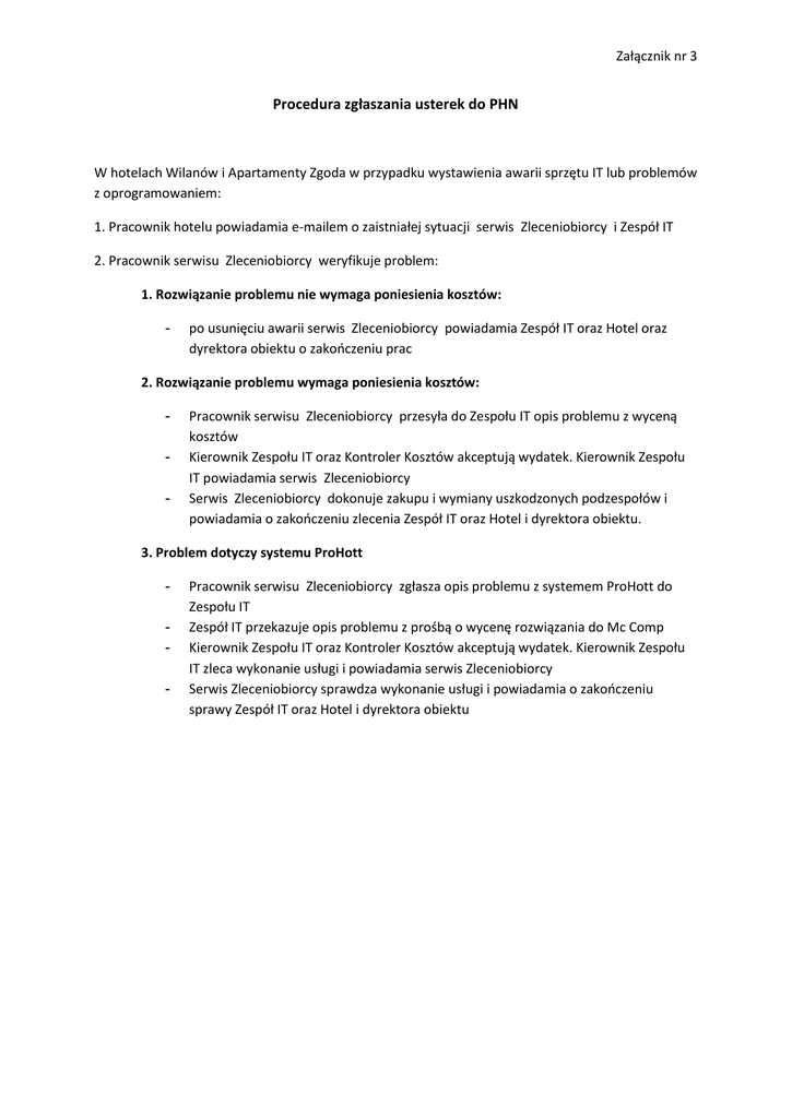 Załącznik nr 3 Procedura zgłaszania usterek do PHN W hotelach Wilanów i Apartamenty Zgoda w przypadku wystawienia awarii sprzętu IT lub problemów z oprogramowaniem: 1. Pracownik hotelu powiadamia e-mailem o zaistniałej sytuacji serwis Zleceniobiorcy i Zespół IT 2. Pracownik serwisu Zleceniobiorcy weryfikuje problem: 1. Rozwiązanie problemu nie wymaga poniesienia kosztów: - po usunięciu awarii serwis Zleceniobiorcy powiadamia Zespół IT oraz Hotel oraz dyrektora obiektu o zakończeniu prac 2. Rozwiązanie problemu wymaga poniesienia kosztów: - Pracownik serwisu Zleceniobiorcy przesyła do Zespołu IT opis problemu z wyceną kosztów Kierownik Zespołu IT oraz Kontroler Kosztów akceptują wydatek. Kierownik Zespołu IT powiadamia serwis Zleceniobiorcy Serwis Zleceniobiorcy dokonuje zakupu i wymiany uszkodzonych podzespołów i powiadamia o zakończeniu zlecenia Zespół IT oraz Hotel i dyrektora obiektu. 3. Problem dotyczy systemu ProHott - Pracownik serwisu Zleceniobiorcy zgłasza opis problemu z systemem ProHott do Zespołu IT Zespół IT przekazuje opis problemu z prośbą o wycenę rozwiązania do Mc Comp Kierownik Zespołu IT oraz Kontroler Kosztów akceptują wydatek. Kierownik Zespołu IT zleca wykonanie usługi i powiadamia serwis Zleceniobiorcy Serwis Zleceniobiorcy sprawdza wykonanie usługi i powiadamia o zakończeniu sprawy Zespół IT oraz Hotel i dyrektora obiektu