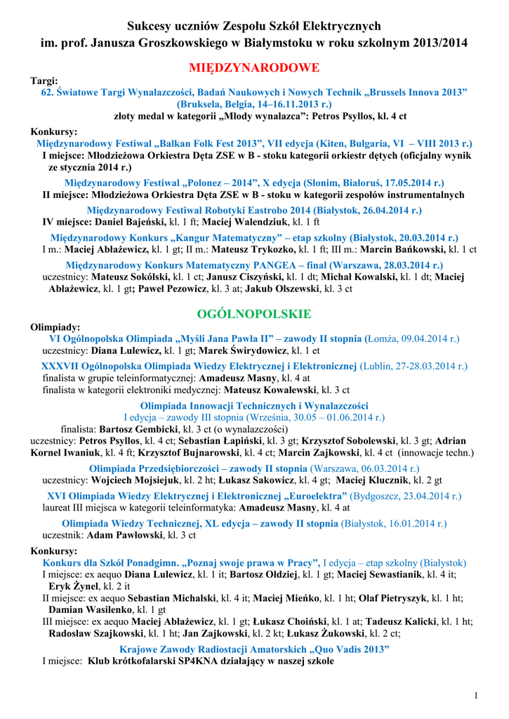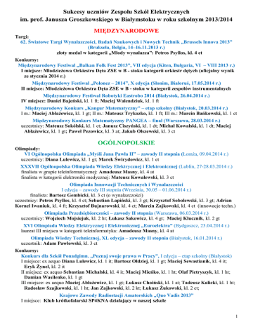 Sukcesy uczniów Zespołu Szkół Elektrycznych im. prof. Janusza Groszkowskiego w Białymstoku w roku szkolnym 2013/2014 MIĘDZYNARODOWE Targi: 62. Światowe Targi Wynalazczości, Badań Naukowych i Nowych Technik „Brussels Innova 2013” (Bruksela, Belgia, 14–16.11.2013 r.) złoty medal w kategorii „Młody wynalazca”: Petros Psyllos, kl. 4 ct Konkursy: Międzynarodowy Festiwal „Balkan Folk Fest 2013”, VII edycja (Kiten, Bułgaria, VI – VIII 2013 r.) I miejsce: Młodzieżowa Orkiestra Dęta ZSE w B - stoku kategorii orkiestr dętych (oficjalny wynik ze stycznia 2014 r.) Międzynarodowy Festiwal „Polonez – 2014”, X edycja (Słonim, Białoruś, 17.05.2014 r.) II miejsce: Młodzieżowa Orkiestra Dęta ZSE w B - stoku w kategorii zespołów instrumentalnych Międzynarodowy Festiwal Robotyki Eastrobo 2014 (Białystok, 26.04.2014 r.) IV miejsce: Daniel Bajeński, kl. 1 ft; Maciej Walendziuk, kl. 1 ft Międzynarodowy Konkurs „Kangur Matematyczny” – etap szkolny (Białystok, 20.03.2014 r.) I m.: Maciej Abłażewicz, kl. 1 gt; II m.: Mateusz Trykozko, kl. 1 ft; III m.: Marcin Bańkowski, kl. 1 ct Międzynarodowy Konkurs Matematyczny PANGEA – finał (Warszawa, 28.03.2014 r.) uczestnicy: Mateusz Sokólski, kl. 1 ct; Janusz Ciszyński, kl. 1 dt; Michał Kowalski, kl. 1 dt; Maciej Abłażewicz, kl. 1 gt; Paweł Pezowicz, kl. 3 at; Jakub Olszewski, kl. 3 ct OGÓLNOPOLSKIE Olimpiady: VI Ogólnopolska Olimpiada „Myśli Jana Pawła II” – zawody II stopnia (Łomża, 09.04.2014 r.) uczestnicy: Diana Lulewicz, kl. 1 gt; Marek Świrydowicz, kl. 1 et XXXVII Ogólnopolska Olimpiada Wiedzy Elektrycznej i Elektronicznej (Lublin, 27-28.03.2014 r.) finalista w grupie teleinformatycznej: Amadeusz Masny, kl. 4 at finalista w kategorii elektroniki medycznej: Mateusz Kowalewski, kl. 3 ct Olimpiada Innowacji Technicznych i Wynalazczości I edycja – zawody III stopnia (Września, 30.05 – 01.06.2014 r.) finalista: Bartosz Gembicki, kl. 3 ct (o wynalazczości) uczestnicy: Petros Psyllos, kl. 4 ct; Sebastian Łapiński, kl. 3 gt; Krzysztof Sobolewski, kl. 3 gt; Adrian Kornel Iwaniuk, kl. 4 ft; Krzysztof Bujnarowski, kl. 4 ct; Marcin Zajkowski, kl. 4 ct (innowacje techn.) Olimpiada Przedsiębiorczości – zawody II stopnia (Warszawa, 06.03.2014 r.) uczestnicy: Wojciech Mojsiejuk, kl. 2 ht; Łukasz Sakowicz, kl. 4 gt; Maciej Klucznik, kl. 2 gt XVI Olimpiada Wiedzy Elektrycznej i Elektronicznej „Euroelektra” (Bydgoszcz, 23.04.2014 r.) laureat III miejsca w kategorii teleinformatyka: Amadeusz Masny, kl. 4 at Olimpiada Wiedzy Technicznej, XL edycja – zawody II stopnia (Białystok, 16.01.2014 r.) uczestnik: Adam Pawłowski, kl. 3 ct Konkursy: Konkurs dla Szkół Ponadgimn. „Poznaj swoje prawa w Pracy”, I edycja – etap szkolny (Białystok) I miejsce: ex aequo Diana Lulewicz, kl. 1 it; Bartosz Ołdziej, kl. 1 gt; Maciej Sewastianik, kl. 4 it; Eryk Żynel, kl. 2 it II miejsce: ex aequo Sebastian Michalski, kl. 4 it; Maciej Mieńko, kl. 1 ht; Olaf Pietryszyk, kl. 1 ht; Damian Wasilenko, kl. 1 gt III miejsce: ex aequo Maciej Abłażewicz, kl. 1 gt; Łukasz Choiński, kl. 1 at; Tadeusz Kalicki, kl. 1 ht; Radosław Szajkowski, kl. 1 ht; Jan Zajkowski, kl. 2 kt; Łukasz Żukowski, kl. 2 ct; Krajowe Zawody Radiostacji Amatorskich „Quo Vadis 2013” I miejsce: Klub krótkofalarski SP4KNA działający w naszej szkole 1 Ogólnopolski Konkurs Historyczny KRĄG PLUS – etap szkolny (Białystok, 26.03.2014 r.) I m.: Andrzej Tatarczuk, kl. 1 bt; II m.: Dawid Badalian, kl. 1 gt; III m.: Artur Dobek, kl. 1 ct Ogólnopolski Konkurs Wiedzy Biblijnej, XVIII edycja – etap diecezjalny (Białystok, 09.04.2014 r.) uczestnicy: Marek Kucbor, kl. 1 kt; Michał Jurczak, kl. 1 bt; Jacek Bukojemski, kl. 3 gt WOJEWÓDZKIE Konkursy: Konkurs „Moje pasje, moje stypendium”, II edycja (Białystok, 06.12.2014 r.) uczestnicy: Michał Kononiuk, kl. 4 ct; Dawid Masłowski, kl. 4 gt; Tomasz Małachowski, kl. 2 jt; Krystian Nowik, kl. 2 it; Marta Onopa, kl. 4 it Konkurs Wiedzy Młodego Przedsiębiorcy, VI edycja – etap szkolny (Białystok, 10.12.2013 r.) I m.: Tomasz Małachowski, kl. 2 jt.II m.: Szymon Korotkiewicz, kl. 2 jt III m.e: Marcin Dowejko, kl. 1 ct Konkurs Wiedzy o Rodzinie, V edycja (Białystok, 07.04.2014 r.) IX miejsce: Łukasz Żukowski, kl. 2 ct Międzyszkolny konkurs czytelniczy pt. „Czy znasz twórczość Andrzeja Pilipiuka?” – etap międzyszkolny (Białystok, 13.11.2013 r.) wyróżnienie: Kamil Kropiewnicki, kl. 4 ht; Daniel Samuel Polak, kl. 1 kt Międzyszkolny konkurs plastyczny pt. „Czy znasz twórczość Andrzeja Pilipiuka?” – etap szkolny (Białystok, 22.10.2013 r.) I miejsce: Joanna Grzegorczyk, kl. 3 gt Wojewódzki Konkurs Przedmiotowy z Matematyki „Matematyka Pasją Technika”, III edycja (Suwałki, 07.03.2014 r.) I m.: Mateusz Stankiewicz, kl. 4 gt; III m.: Amadeusz Masny, kl. 4 at; IV m.: Paweł Pezowicz, kl. 3 at Wojewódzki Konkurs z cyklu Białostocczyzna znana i nieznana „Białostocczyzna wielu kultur” w kategorii szkoła ponadgimnazjalna – prezentacja multimedialna, IV edycja (Białystok, 29.05.2014 r.) I miejsce i tytuł laureata: Patryk Malinowski, kl. 1 et; Marcin Koc, kl. 1 et II miejsce: Piotr Owsiejko, kl. 2 et; Marek Dziakowski, kl. 2 et MIEJSKIE Konkursy: Konkurs o Przedsiębiorczości dla szkół ponadgimnazjalnych (Białystok, 21.03.2014 r.) I m.: Wojciech Mojsiejuk, kl. 2 ht; II m.: Maciej Klucznik, kl. 2 gt; III m.: Adam Gil, kl. 2 it Konkurs Recytatorski im. Adama Mickiewicza „Między dawnymi i młodszymi laty”, III edycja (Białystok,03.03.2014 r.) II miejsce: Bartosz Zawadzki, kl. 3 ht wyróżnienie: Adrian Ziemniewicz z kl. 2 jt Międzyszkolny Konkurs Historyczny na najlepszą prezentację multimedialną lub film pt. „Polskie powstania narodowe w XIX wieku”, V edycja (Białystok, 01.10 – 22.11.2013 r.) I miejsce: Piotr Sękara, kl. 4 ht II miejsce: Patryk Malinowski, 1 et III miejsce: Marcin Koc, kl. 1 et wyróżnienie: Piotr Ows