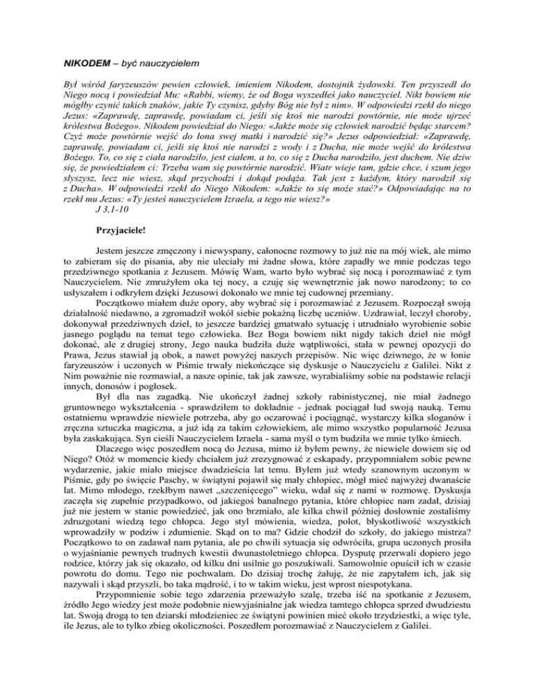 NIKODEM – być nauczycielem Był wśród faryzeuszów pewien człowiek, imieniem Nikodem, dostojnik żydowski. Ten przyszedł do Niego nocą i powiedział Mu: «Rabbi, wiemy, że od Boga wyszedłeś jako nauczyciel. Nikt bowiem nie mógłby czynić takich znaków, jakie Ty czynisz, gdyby Bóg nie był z nim». W odpowiedzi rzekł do niego Jezus: «Zaprawdę, zaprawdę, powiadam ci, jeśli się ktoś nie narodzi powtórnie, nie może ujrzeć królestwa Bożego». Nikodem powiedział do Niego: «Jakże może się człowiek narodzić będąc starcem? Czyż może powtórnie wejść do łona swej matki i narodzić się?» Jezus odpowiedział: «Zaprawdę, zaprawdę, powiadam ci, jeśli się ktoś nie narodzi z wody i z Ducha, nie może wejść do królestwa Bożego. To, co się z ciała narodziło, jest ciałem, a to, co się z Ducha narodziło, jest duchem. Nie dziw się, że powiedziałem ci: Trzeba wam się powtórnie narodzić. Wiatr wieje tam, gdzie chce, i szum jego słyszysz, lecz nie wiesz, skąd przychodzi i dokąd podąża. Tak jest z każdym, który narodził się z Ducha». W odpowiedzi rzekł do Niego Nikodem: «Jakże to się może stać?» Odpowiadając na to rzekł mu Jezus: «Ty jesteś nauczycielem Izraela, a tego nie wiesz?» J 3,1-10 Przyjaciele! Jestem jeszcze zmęczony i niewyspany, całonocne rozmowy to już nie na mój wiek, ale mimo to zabieram się do pisania, aby nie uleciały mi żadne słowa, które zapadły we mnie podczas tego przedziwnego spotkania z Jezusem. Mówię Wam, warto było wybrać się nocą i porozmawiać z tym Nauczycielem. Nie zmrużyłem oka tej nocy, a czuję się wewnętrznie jak nowo narodzony; to co usłyszałem i odkryłem dzięki Jezusowi dokonało we mnie tej cudownej przemiany. Początkowo miałem duże opory, aby wybrać się i porozmawiać z Jezusem. Rozpoczął swoją działalność niedawno, a zgromadził wokół siebie pokaźną liczbę uczniów. Uzdrawiał, leczył choroby, dokonywał przedziwnych dzieł, to jeszcze bardziej gmatwało sytuację i utrudniało wyrobienie sobie jasnego poglądu na temat tego człowieka. Bez Boga bowiem nikt nigdy takich dzieł nie mógł dokonać, ale z drugiej strony, Jego nauka budziła duże wątpliwości, stała w pewnej opozycji do Prawa, Jezus stawiał ją obok, a nawet powyżej naszych przepisów. Nic więc dziwnego, że w łonie faryzeuszów i uczonych w Piśmie trwały niekończące się dyskusje o Nauczycielu z Galilei. Nikt z Nim poważnie nie rozmawiał, a nasze opinie, tak jak zawsze, wyrabialiśmy sobie na podstawie relacji innych, donosów i pogłosek. Był dla nas zagadką. Nie ukończył żadnej szkoły rabinistycznej, nie miał żadnego gruntownego wykształcenia - sprawdziłem to dokładnie - jednak pociągał lud swoją nauką. Temu ostatniemu wprawdzie niewiele potrzeba, aby go oczarować i pociągnąć, wystarczy kilka sloganów i zręczna sztuczka magiczna, a już idą za takim człowiekiem, ale mimo wszystko popularność Jezusa była zaskakująca. Syn cieśli Nauczycielem Izraela - sama myśl o tym budziła we mnie tylko śmiech. Dlaczego więc poszedłem nocą do Jezusa, mimo iż byłem pewny, że niewiele dowiem się od Niego? Otóż w momencie kiedy chciałem już zrezygnować z eskapady, przypomniałem sobie pewne wydarzenie, jakie miało miejsce dwadzieścia lat temu. Byłem już wtedy szanownym uczonym w Piśmie, gdy po święcie Paschy, w świątyni pojawił się mały chłopiec, mógł mieć najwyżej dwanaście lat. Mimo młodego, rzekłbym nawet „szczenięcego” wieku, wdał się z nami w rozmowę. Dyskusja zaczęła się zupełnie przypadkowo, od jakiegoś banalnego pytania, które chłopiec nam zadał, dzisiaj już nie jestem w stanie powiedzieć, jak ono brzmiało, ale kilka chwil później dosłownie zostaliśmy zdruzgotani wiedzą tego chłopca. Jego styl mówienia, wiedza, polot, błyskotliwość wszystkich wprowadziły w podziw i zdumienie. Skąd on to ma? Gdzie chodził do szkoły, do jakiego mistrza? Początkowo to on zadawał nam pytania, ale po chwili sytuacja się odwróciła, grupa uczonych prosiła o wyjaśnianie pewnych trudnych kwestii dwunastoletniego chłopca. Dysputę przerwali dopiero jego rodzice, którzy jak się okazało, od kilku dni usilnie go poszukiwali. Samowolnie opuścił ich w czasie powrotu do domu. Tego nie pochwalam. Do dzisiaj trochę żałuję, że nie zapytałem ich, jak się nazywali i skąd przyszli, bo taka mądrość, i to w takim wieku, jest wprost niespotykana. Przypomnienie sobie tego zdarzenia przeważyło szalę, trzeba iść na spotkanie z Jezusem, źródło Jego wiedzy jest może podobnie niewyjaśnialne jak wiedza tamtego chłopca sprzed dwudziestu lat. Swoją drogą to ten dziarski młodzieniec ze świątyni powinien mieć około trzydziestki, a więc tyle, ile Jezus, ale to tylko zbieg okoliczności. Poszedłem porozmawiać z Nauczycielem z Galilei. Całą noc spędziliśmy na rozmowie, a przeszła ona moje najśmielsze oczekiwania. Takiej rewolucji w moim życiu, i to na stare lata, nigdy bym się nie spodziewał, wyszedłem nowo narodzony, inny, napełniony Bogiem. Jezus mówił o wielu rzeczach: o nowym narodzeniu, o Synu Człowieczym, który będzie wywyższony jak wąż na pustyni, o przedziwnej i niepojętej miłości Boga, który daje nam Swojego Syna. To, co zapadło do mojego serca pozwoli rozmyślać o Bogu przez długie lata. Spotkanie trwało całą noc, ale moje dotychczasowe życie zostało oświetlone jakimś nowym, przedziwnym światłem. Jedno zdanie, z wszystkiego co powiedział mi Jezus, utkwiło we mnie szczególnie mocno, a nawet rozdarło mnie od wewnątrz zadając wielki ból: „Ty jesteś nauczycielem Izraela, a tego nie wiesz?” Tak, dotychczas uważałem się za nauczyciela, uczonego w Piśmie. Nie ukrywam tego, byłem dumny z posiadanej przez siebie wiedzy, ile lat pracy mnie to kosztowało, ile nieprzespanych nocy, wiele godzin ślęczenia nad manuskryptami. A tu nagle jakiś nieuk w