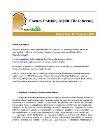 Informacje ogólne: Wszystkim czynnym uczestnikom konferencji Organizatorzy zapewniają zakwaterowanie oraz 3-dniowy pobyt w mieszkaniach Kolegium Nauczycielskiego w Bielsku Białej (http://kn.edu.pl/). Proszę o wskazanie ilości noclegów do 17 września na adres mailowy: [email protected] (w temacie ilość noclegów) Organizatorzy gwarantują również posiłek wieczorny w restauracji BLU, wieńczący I dzień konferencji (http://www.restauracja-blu.pl/). Podczas trwania pierwszego dnia będzie również możliwość zakupienia książek partne rów wydarzenia (m.in. KRONOS, Studia z Filozofii Polskiej oraz Teologia Polityczna). Więcej informacji o targach książek, zamówieniach i możliwościach promocji własnych dzieł, udziela współorganizator wydarzenia - Mateusz Firlej ([email protected]). I. Wybrane założenia programowe konferencji Tematyka planowanej konferencji koncentruje się na dokonaniach rodzimej filozofii w kontekście badań ogólnoświatowych. Adresowana jest zarówno do pracowników naukowych prowadzących badania na temat polskiej myśli filozoficznej, jak również do młodego pokolenia badaczy, w szczególności doktorantów i studentów. Konferencja zgromadzi znane autorytety w tej dziedzinie, które podzielą się swymi dokonaniami i uwagami, w formie referatu, dyskusji i udziału w warsztatach, z młodszymi adeptami nauki. Warsztaty są planowane także z udziałem młodzieży licealnej, której nie są obce problemy filozoficzne. Głównym celem konferencji jest ukazanie wielości podejmowanych działań przez filozofów: dzielenie się własnymi rezultatami badań, poszukiwanie odpowiedzi na stawiane pytania, analizowanie tekstów źródłowych, uczestniczenie w debatach filozoficznych. Różnorodność proponowanych form pracy/spotkań ma doprowadzić do maksymalnie efektywnego i filozoficznie płodnego spożytkowania czasu. II. Program Forum Polskiej Myśli Filozoficznej Dzień Konferencji – 18.09. (miejsce: Aula im. J. Piłsudzkiego w I Liceum Ogólnokształcącym w Bielsku-Białej, ul. Listopadowa 70). Godz. 9:00. 1. Uroczyste otwarcie oraz przywitania uczestników konferencji (9:10 – 10:00). Organizatora i Przedstawiciela PTF (dr hab. Krzysztof Śleziński, prof. UŚ) Organizatora i Przedstawiciela Collegium Invisibile Dyrektora I Liceum im. Mikołaja Kopernika (Bogusław Głąbek) 2. Inauguracyjna mowa - prof. dr hab. Jan Woleński (UJ) 3. I Sesja Plenarna (11:00 – 13:00) – w kręgu filozofii społecznej. Temat przewodni - 25 lat transformacji Polski w kontekście filozoficzno-socjologicznym. W szczególności: Prof. dr hab. Jadwiga Staniszkis (PAN), Filozofia: klucz do sekretnej mapy Europy Prof. dr hab. Karol Tarnowski (UPJPII), Józef Tischner – niezastąpiony filozof polskiej nadziei Dr hab. Wojciech Załuski, prof. UJ, Tischner o wolności Michał Lewandowski (Teologia, Instytut Teologiczny im. Św. Jana Kantego, BB), Aktualność wątków filozofii społecznej w pismach ks. prof. Józefa Tischnera Maciej Krogel (Prawo UWr), Solidarność w koncepcjach Józefa Tischnera i Richarda Rorty’ego a współczesna demokracja liberalna Anna Gabriela Peszkowska (MISH UW), Filozoficzna analiza zagadnienia modernizacji społeczno-gospodarczej Mgr Miłosz Puczydłowski (Filozofia UJ), Czy w Polsce miała/ma miejsce sekularyzacja? 4. Wykład na temat wyzwań w nauce i edukacji w Polsce – Piotr Czekierda (CEO w Collegium Wratislaviense) (13:00-13:30) 5. Przerwa kawowa (13:30 – 14:00) 6. II Sesja Plenarna (14:00 – 16:00) – w kręgu filozofii nauki. Temat przewodni – Refleksja filozoficzna wobec wyzwań współczesnej nauki. W szczególności proponujemy zwrócenie uwagi na: Prof. dr hab. Adam Grobler (Uniwersytet Opolski), TBA Dr hab. Krzysztof Śleziński, prof. UŚ, Filozofia a nauka w kontekście naukowej metafizyki Dr hab. Wiesław Wójcik, prof. PAN, Projekt budowy nauki polskiej twórców polskiej szkoły matematycznej Kacper Kondrakiewicz (MISH UW, Collegium Invisibile), Stary język, nowe problemy. Spór „geny czy środowisko” we współczesnej biologii. Marta Marciniak (MISH UW), Moralne aspekty powoływania do życia „designer babies” Grzegorz Lisowski (Filozofia, kognitywistyka UW), Wątpliwa niepowątpiewalność qualiów. 7. Przerwa kawowa (16:00 – 16:15) 8. III Sesja Plenarna (16:15 – 18:15) – w kręgu klasyków polskiej nowoczesności. Temat przewodni – niedokończone projekty polskiej myśli filozoficznej 1791-1968. W ramach panelu proponujemy szczególną refleksję na następujące tematy: Dr hab. Andrzej Gniazdowski, prof. PAN, TBA Dr Jan Tokarski (Kultura Liberalna), Kołakowski – filozof czy historyk idei? Dr Adam Górniak (UW) Schematy pojęciowe kultury europejskiej według Krzysztofa Pomiana Dr Mateusz Falkowski (Fundacja na Rzecz Myślenia im. Barbary Skargi), Złudzenie i złudzenia. Spór z transcendentalizmem od Skargi do Poręby Dr hab. Andrzej Kasperek (UŚ), Nowoczesność a tradycja Cieszkowskiego ezoteryczna. Przypadek historiozofii Stanisław Maria Starnawski (Prawo, filozofia, astronomia UW), Problemy z nowoczesnością Jacek Woźniak (Filozofia UW), Rozważania etyczna Antoniego Kępińskiego Augusta 9. Zakończenie konferencji. Uroczysta kolacja w restauracji BLU. Dzień Warsztatów – 19.09. (miejsce: sale multimedialne w I Liceum Ogólnokształcącym w Bielsku-Białej, ul. Listopadowa 70). Godz. 9:00. Lista prowadzących: 1. 2. 3. 4. 5. 6. 7. 8. Natalia Janoszek, TBA Mateusz Firlej, Zastosowanie filozofii w praktyce Michał Leszczyński, TBA Dr Adam Górniak, Ironiczna mityzacja rzeczywistości Anna Prus-Mścisz, Od świata jako tekstu do świata jako performansu Mgr Maciej Juzaszek, Sprawiedliwość w praktyce Mgr Miłosz Puczydłowski, Między odczarowaniem i zaczarowaniem świata Artur Kołodziejczyk, Solidarność, to znaczy jeden i dugi (?). O fenomenie solidarności w filozofii dramatu Józefa Tischnera. 9. Michał Bąk, O mieście w Dwumieście. 10. Mgr Jarosław Hess, T