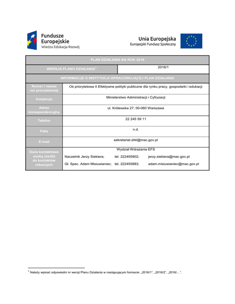 PLAN DZIAŁANIA NA ROK 2016 WERSJA PLANU DZIAŁANIA1