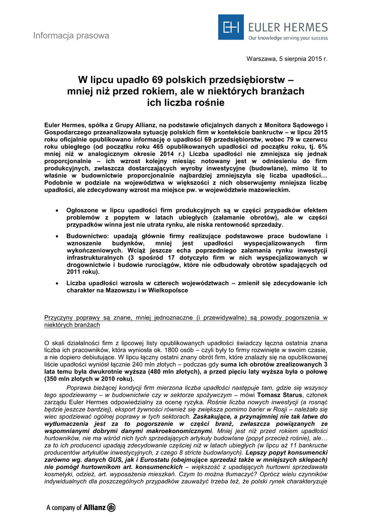 Informacja prasowa Warszawa, 5 sierpnia 2015 r. W lipcu upadło 69 polskich przedsiębiorstw – mniej niż przed rokiem, ale w niektórych branżach ich liczba rośnie Euler Hermes, spółka z Grupy Allianz, na podstawie oficjalnych danych z Monitora Sądowego i Gospodarczego przeanalizowała sytuację polskich firm w kontekście bankructw – w lipcu 2015 roku oficjalnie opublikowano informację o upadłości 69 przedsiębiorstw, wobec 79 w czerwcu roku ubiegłego (od początku roku 465 opublikowanych upadłości od początku roku, tj. 6% mniej niż w analogicznym okresie 2014 r.) Liczba upadłości nie zmniejsza się jednak proporcjonalnie – ich wzrost kolejny miesiąc notowany jest w odniesieniu do firm produkcyjnych, zwłaszcza dostarczających wyroby inwestycyjne (budowlane), mimo iż to właśnie w budownictwie proporcjonalnie najbardziej zmniejszyła się liczba upadłości… Podobnie w podziale na województwa w większości z nich obserwujemy mniejsza liczbę upadłości, ale zdecydowany wzrost ma miejsce pw. w województwie mazowieckim. Ogłoszone w lipcu upadłości firm produkcyjnych są w części przypadków efektem problemów z popytem w latach ubiegłych (załamanie obrotów), ale w części przypadków winna jest nie utrata rynku, ale niska rentowność sprzedaży. Budownictwo: upadają głównie firmy realizujące podstawowe prace budowlane i wznoszenie budynków, mniej jest upadłości wyspecjalizowanych firm wykończeniowych. Wciąż jeszcze echa poprzedniego załamania rynku inwestycji infrastrukturalnych (3 spośród 17 dotyczyło firm w nich wyspecjalizowanych w drogownictwie i budowie rurociągów, które nie odbudowały obrotów spadających od 2011 roku). Liczba upadłości wzrosła w czterech województwach – zmienił się zdecydowanie ich charakter na Mazowszu i w Wielkopolsce Przyczyny poprawy są znane, mniej jednoznaczne (i przewidywalne) są powody pogorszenia w niektórych branżach O skali działalności firm z lipcowej listy opublikowanych upadłości świadczy łączna ostatnia znana liczba ich pracowników, która wyniosła ok. 1800 osób – czyli były to firmy rozwinięte w swoim czasie, a nie dopiero debiutujące. W lipcu łączny ostatni znany obrót firm, które znalazły się na opublikowanej liście upadłości wyniósł łącznie 240 mln złotych – podczas gdy suma ich obrotów zrealizowanych 3 lata temu była dwukrotnie wyższa (480 mln złotych), a przed pięciu laty wyższa była o połowę (350 mln złotych w 2010 roku). Poprawa bieżącej kondycji firm mierzona liczba upadłości następuje tam, gdzie się wszyscy tego spodziewamy – w budownictwie czy w sektorze spożywczym – mówi Tomasz Starus, członek zarządu Euler Hermes odpowiedzialny za ocenę ryzyka. Rośnie liczba nowych inwestycji (a rosnąć będzie jeszcze bardziej), eksport żywności również się zwiększa pomimo barier w Rosji – należało się wiec spodziewać ogólnej poprawy w tych sektorach. Zaskakujące, a przynajmniej nie tak łatwe do wytłumaczenia jest za to pogorszenie w części branż, zwłaszcza powiązanych ze wspomnianymi dobrymi danymi makroekonomicznymi. Mniej jest niż przed rokiem upadłości hurtowników, nie ma wśród nich tych sprzedających artykuły budowlane (popyt przecież rośnie), ale… za to ich producenci upadają zdecydowanie częściej niż w latach ubiegłych (w lipcu aż 11 bankructw producentów artykułów inwestycyjnych, z czego 8 stricte budowlanych). Lepszy popyt konsumencki zarówno wg. danych GUS, jak i Eurostatu (obejmujące sprzedaż także w mniejszych sklepach) nie pomógł hurtownikom art. konsumenckich – większość z upadających hurtowni sprzedawała kosmetyki, odzież, art. wyposażenia mieszkań. Czym to można tłumaczyć? Oprócz wielu czynników indywidualnych dla poszczególnych przypadków zauważyć trzeba też, że polski rynek charakteryzuje się zdecydowanie większym poziomem konkurencji pomiędzy przedsiębiorstwami niż w innych krajach europejskich. W efekcie w Polsce niższe są nie tylko płace, ale też rentowność wielu przedsiębiorstw, a z drugiej strony wymagane są często wyższe nakłady inwestycyjne (większa jest presja na innowacje m.in. w sposobie dystrybucji towarów). Źródło: Monitor Sądowy i Gospodarczy, dane przeanalizowane przez Euler Hermes z grupy Allianz Budownictwo – rosną inwestycje, ale nie ich ceny (i rentowność) Wzrosty produkcji budowlanej jest faktem, ale ich największe nasilenie jest jeszcze przed nami, także z powodu opóźnień proceduralnych w ich rozpoczęciu – mówi Michał Modrzejewski, dyrektor analiz Branżowych w Euler Hermes. Mniejszy od oczekiwań wzrost rynku wpływa na konkurowanie głównie ceną – nie ma miejsca na jej wzrost. W efekcie mimo, iż rentowność firm budowlanych poprawiła się w stosunku do ostatnich lat, nadal nie jest tak dobra jak przed 2012 rokiem. To jest przyczyną największej grupy upadłości firm budowlanych – realizujących podstawowe prace budowlane i wznoszących budynki (10 upadłości w lipcu). Oprócz tego miały miejsce 4 upadłości firm realizujących prace wykończeniowe (tynkarskie, wodno-kanalizacyjne) oraz 3 bankructwa firm obsługujących inwestycje drogowe i przesyłowe (te nie na skutek bieżącej koniunktury, ale jako efekt problemów, które zaczęły się w 2011 roku). Źródło: Monitor Sądowy i Gospodarczy, dane przeanalizowane przez Euler Hermes z grupy Allianz Firmy usługowe – trochę lepiej w sektorze usług biznesowych, ale wciąż jest to sektor borykający się z licznymi problemami Liczba upadłości firm usługowych mim, iż wciąż jedna z wyższych zmniejszyła się o 1/3 w stosunku do tej z lipca ubiegłego roku. W tak licznej grupie zróżnicowanie jest spore, natomiast zauważyć można spadek liczby upadłości firm świadczących usługi na rzecz biznesu (mniej jest wśród nich tak licznych niedawno firm obsługujących procesy inwestycyjne), mniej jest też ba