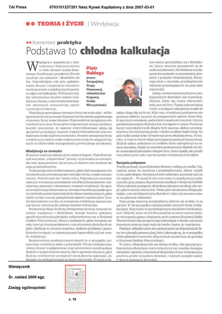 TAI Press 0703101237201 Nasz Rynek Kapitałowy z dnia 2007-03-01 TEORIA l ŻYCIE l Windykacja •• Komentarz praktyka Podstawa to chłodna kalkulacja •T TT yspółpraca gospodarcza z kon\/\ł trafieniami i klientami zawiera T T w sobie element ryzyka finansowego. Parafrazując przysłowie: Kto nic ryzykuje, ten sukcesów i dłużników nie prezes ma. Najważniejszą rolę przy podejmoEuropejskiej waniu decyzji o rozpoczęciu outsourco Grupy wania procesów windykacyjnychpowinFinansowej, na odgrywać kalkulacja. Wybieramy mięadministrator dzy utrzymaniem kosztów stałych (winKrajowej dykacja własna), a wprowadzeniem koszGiełdy tów zmiennych (outsourcing oparty Wierzytelności o prowizję od sukcesu). Windykacja prowadzona wewnątrz firmy ma wiele zalet - od bieżącej kontroli nad procesami finansowymi do szeroko pojmowanego wizerunku firmy wobec klientów. Wyprowadzenie zarządzania wierzytelnościami poza firmę oprócz wspomnianej zmiany struktury kosztów gwarantuje, że naszymi wierzytelnościami zajmą się specjaliści posiadający znacznie większe doświadczenie oraz rozbudowane środki kadrowo-techniczne. Ponadto zewnętrzna firma windykacyjna będzie miała większą motywację do osiągania lepszych wyników (efekt wynagrodzenia prowizyjnego od sukcesu). Windykacja na zewnątrz Światowa tendencja skłania się ku outsourcingowi. Wiele firm niemal wszystkie „niepotrzebne" procesy wyprowadza na zewnątrz, aby móc skoncentrować się na tym, co stanowi córę business danego przedsiębiorstwa. Funkcjonują także modele mieszane, gdzie część zarządzania wierzytelnościami prowadzona jest wewnątrz firmy, a część outsourcowana. Podział może być bardzo różny Najprostszym rozwiązaniem jest wewnętrzne prowadzenie weryfikacji kontrahentów i monitoringu płatności z elementami wstępnej windykacji. Do agencji zewnętrznej przekazywane są wówczas wszystkie pozostałe sprawy (od krótko przeterminowanych do niemal przedawnionych, gdzie należy szybko wszcząć postępowanie sądowe i egzekucyjne). Z moich doświadczeń wynika, że zewnętrzna windykacja stanowi czasem tarczę ochronną dla dobrego imienia wierzyciela. Przekazanie długu do firmy zewnętrznej nie musi oznaczać zerwania współpracy z dłużnikiem. Istnieje bowiem pokojowy sposób odzyskiwania pieniędzy, wykorzystywany np. w Krajowej Giełdzie Wierzytelności. Mowa o mediacjach, gdzie stosujemy zasadę rozwiązywania problemów, a nie zmuszania dłużnika do zapłaty. Mediacje to otwarta rozmowa, badanie problemu i poszukiwanie rozwiązali, co czasem przynosi lepsze efekty niż tzw. twarda windykacja. Bezpieczeństwo przekazywanych danych to w przypadku outsourcingu windykacji jeden z priorytetów. Firma windykacyjna, z którą chcemy współpracować, musi prezentować wysoki poziom dbałości o bezpieczeństwo danych. Ma to ogromne znaczenie, gdyż dłużnicy wielokrotnie wymigiwali się od płacenia należności, zasłaniąjąc się niedopatrzeniami ze strony wierzyciela. W naszej prak- Miesięcznik Śr. nakład 2000 egz. Zasięg ogólnopolski s. 18 tyce nieraz spotykaliśmy się z dłużnikami, którzy otwarcie przyznawali się do unikania płatności. Ich działanie to połączenie bezczelności ze znajomością przepisów i praktyki windykacyjnej. Korzystają także z niewiedzy przedsiębiorców odnośnie przysługujących im praw jako wierzycieli. Jedną z metod stosowanych przez profesjonalnych dłużników jest typowanie. Dłużnik, który ma trzech wierzycieli, bada stan ich firm. Typuje najmocniejszą z nich, a następnie zabezpiecza środki do spłaty długu dla tej firmy. Mija czas, windykacja polubowna nie przynosi efektów, zaczyna się postępowanie sądowe, które dzięki sprytnym wnioskom, podważaniu zasadności roszczeń i innym pseudoargumentom dłużnika jest rozciągane w czasie. Ponieważ kwoty wszystkich trzech długów były znaczne, słabsze przedsiębiorstwa nie wytrzymują presji i z braku środków bankrutują. Na polu walki zostaje tylko wytypowana przez dłużnika firma. Po wyroku, w trakcie równie długo przeciąganej egzekucji komorniczej, dłużnik spłaca zadłużenie ze środków, które zabezpieczył na samym początku. Dzięki tej metodzie profesjonalny dłużnik nic tylko zaoszczędził pieniądze z długów firm, które upadły, ale przede wszystkim przez cały czas korzystał z wyłudzonych środków. Naczynia połączone Trzeba przyznać, że profesjonalni dłużnicy trafiają się rzadko. Najczęściej mamy do czynienia z przedsiębiorcami, którzy wpadli w tzw. pętlę długów. Nie płacą swoich należności, ponieważ inni im nie zapłacili... W naszej firmie nazywamy to zasadą naczyń połączonych i przy pomocy departamentu mediacji w Krajowej Giełdzie Wierzytelności pomagamy dłużnikom odzyskać ich długi, aby mogli spłacić swoich wierzycieli. Ważne jest udrożnienie obiegu pieniądza, a nie utrudnianie życia dłużnikowi, który nie ma nawet szansy na spłacenie należności. Dużą grupę stanowią przedsiębiorcy, którym się wydaje, że są sprytni. W ich przypadku najlepiej działa autorytet firmy windykacyjnej . Nazywamy to psychologicznym naciskiem windykacyjnym. Dłużnik, który nie chciał rozmawiać ze swoim wierzycielem, po otrzymaniu pisma o dopisaniu go do systemu Krajowej Giełdy Wierzytelności albo przejęciu jego zobowiązań w drodze cesji przez kancelarię prawną nagle staje się bardzo chętny do współpracy Podobne oddziaływanie ma umieszczanie na dokumentach firmy tzw. pieczątki prewencyjnej, która informuje np., że w przypadku braku płatności w terminie, dług zostanie wystawiony na sprzedaż w Krajowej Giełdzie Wierzytelności. W walce z dłużnikami nie ma złotego środka. Aby sprostać profesjonalnym dłużnikom warto wykorzystywać wszelkie dostępne narzędzia i sposoby, natomiast profesjonalna firma windykacyjna powinna przede wszystkim doradzać, z których narzędzi należy w danym momenc