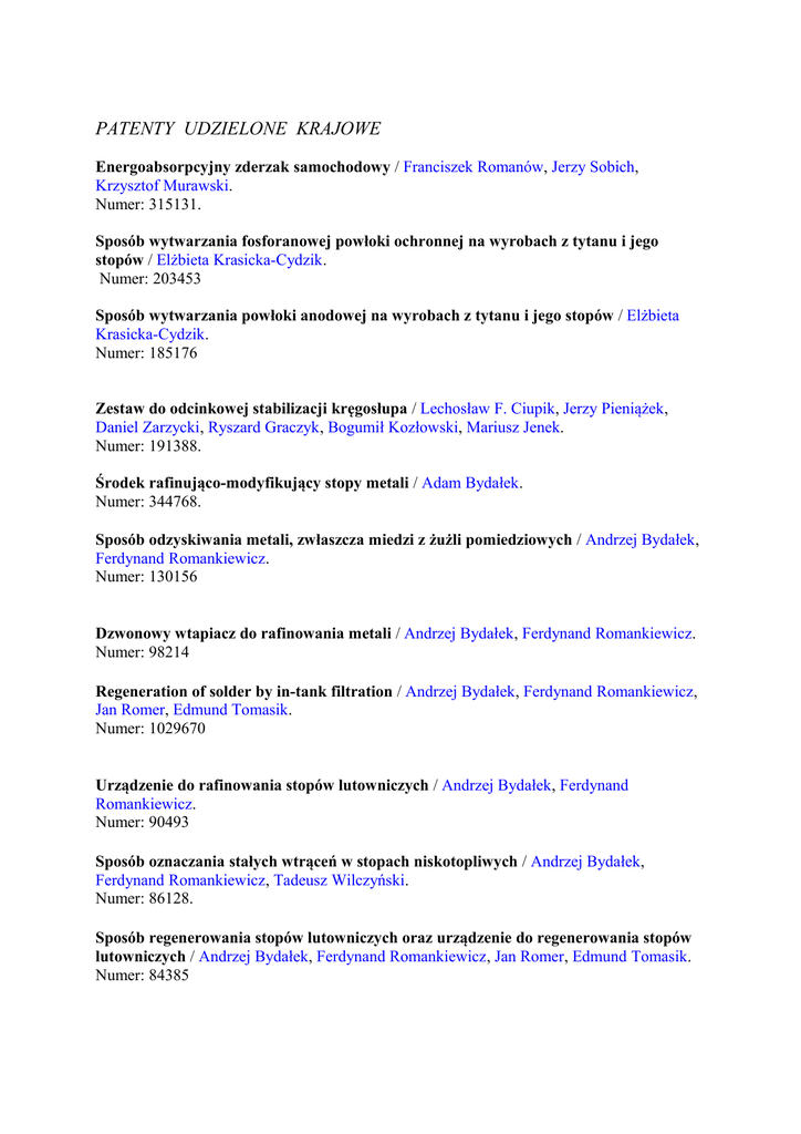 PATENTY UDZIELONE KRAJOWE Energoabsorpcyjny zderzak samochodowy / Franciszek Romanów, Jerzy Sobich, Krzysztof Murawski. Numer: 315131. Sposób wytwarzania fosforanowej powłoki ochronnej na wyrobach z tytanu i jego stopów / Elżbieta Krasicka-Cydzik. Numer: 203453 Sposób wytwarzania powłoki anodowej na wyrobach z tytanu i jego stopów / Elżbieta Krasicka-Cydzik. Numer: 185176 Zestaw do odcinkowej stabilizacji kręgosłupa / Lechosław F. Ciupik, Jerzy Pieniążek, Daniel Zarzycki, Ryszard Graczyk, Bogumił Kozłowski, Mariusz Jenek. Numer: 191388. Środek rafinująco-modyfikujący stopy metali / Adam Bydałek. Numer: 344768. Sposób odzyskiwania metali, zwłaszcza miedzi z żużli pomiedziowych / Andrzej Bydałek, Ferdynand Romankiewicz. Numer: 130156 Dzwonowy wtapiacz do rafinowania metali / Andrzej Bydałek, Ferdynand Romankiewicz. Numer: 98214 Regeneration of solder by in-tank filtration / Andrzej Bydałek, Ferdynand Romankiewicz, Jan Romer, Edmund Tomasik. Numer: 1029670 Urządzenie do rafinowania stopów lutowniczych / Andrzej Bydałek, Ferdynand Romankiewicz. Numer: 90493 Sposób oznaczania stałych wtrąceń w stopach niskotopliwych / Andrzej Bydałek, Ferdynand Romankiewicz, Tadeusz Wilczyński. Numer: 86128. Sposób regenerowania stopów lutowniczych oraz urządzenie do regenerowania stopów lutowniczych / Andrzej Bydałek, Ferdynand Romankiewicz, Jan Romer, Edmund Tomasik. Numer: 84385 Urządzenie sterujące rozlewaniem metali / Andrzej Bydałek, Tadeusz Patycki, Ferdynand Romankiewicz. Numer: 76435 Urządzenie do topienia i rafinowania stopów niskotopliwych w próżni / Andrzej Bydałek, Ferdynand Romankiewicz. Numer: 73206 Środek ochronno-rafinacyjny do topienia stopów miedzi / Ferdynand Romankiewicz, Zygmunt Jocz. Numer: 162221. Sposób modyfikacji mosiądzów krzemowych / Ferdynand Romankiewicz. Numer: 157752 Dwuskładnikowy modyfikator miedzi i jej stopów / Ferdynand Romankiewicz, Izabela Głazowska. Numer: 120051 Modyfikator miedzi i jej stopów / Ferdynand Romankiewicz, Stanisław Zochniak. Numer: 111335 Dwuskładnikowy modyfikator brązów, zwłaszcza aluminiowych / Ferdynand Romankiewicz, Jerzy Mutwil. Numer: 108588 Topnik ochronno-rafinujący dla miedzi i jej stopów / Ferdynand Romankiewicz. Numer: 108479 Sposób wytwarzania wstępnego stopu miedź-bor / Ferdynand Romankiewicz. Numer: 101252 Stop do metalizowania elementów przed lutowaniem / Ferdynand Romankiewicz. Numer: 102667 Dwuskładnikowy modyfikator brązów zwłaszcza cynowo-cynkowo-ołowiowych / Ferdynand Romankiewicz. Numer: 99963 Sposób rafinowania miedzi i jej stopów / Ferdynand Romankiewicz. Numer: 99209 Stop lutowniczy / Ferdynand Romankiewicz, Janusz Wasielewski. Numer: 98011 Sposób wytwarzania zaprawy miedź-cyrkon i urządzenie do wytwarzania zaprawy miedź-cyrkon / Zygmunt Jocz, Ferdynand Romankiewicz. Numer: 93093 Kręgosłupowy przyrząd mocująco-stabilizujący / Lechosław F. Ciupik, Daniel Zarzycki, Agnieszka Kierzkowska. Numer: 202523 Element kotwicząco-mocujący stabilizatora potyliczno-kręgosłupowego / Lechosław F. Ciupik, Agnieszka Kierzkowska, Daniel Zarzycki, Maciej Tęsiorowski, Jerzy Pieniążek, Wiesław Skowroński. Numer: 193719. Narzędzie obierające / Bolesław Porankiewicz, Waldemar Szymański, Jan Staniszewski, Henryk Wróblewski, Damian Borzyszkowski, Jan Borus. Numer: 147973 Narzędzie do obróbki wiórowej / Bolesław Kortylewski, Jan Staniszewski, Bolesław Porankiewicz . Numer: 108645 Strugarka wyrówniarka / Bolesław Kortylewski, Jan Staniszewski, Bolesław Porankiewicz. Numer: 105010 Przyrząd do pomiaru chropowatości powierzchni / Bolesław Porankiewicz, Alina Staniszewska, Jan Staniszewski, Wacław Witkowski. Numer: 103123 Piła tarczowa / Jan Staniszewski, Bolesław Porankiewicz, Stanisław Syrek. Numer: 95462 Narzędzie do obróbki drewna / Jan Staniszewski, Bolesław Porankiewicz. Numer: 92749 Sposób frezowania drewna / Jan Staniszewski, Bolesław Porankiewicz. Numer: 89224 Sposób frezowania drewna / Jan Staniszewski, Bolesław Porankiewicz. Numer: 89224 Sposób strugania obrotowego drewna / Jan Staniszewski, Bolesław Kortylewski, Bolesław Porankiewicz. Numer: 78840 Piła tarczowa / Wojciech Kien, Bolesław Porankiewicz, Jan Staniszewski, Stanisław Syrek. Numer: 85675 Sposób i urządzenie do pomiaru struktury geometrycznej powierzchni / Jan Staniszewski, Alina Staniszewska, Bolesław Porankiewicz, Wacław Witkowski. Numer: 87467 Sposób wzdłużnego cięcia drewna i urządzenie do stosowania tego sposobu / Jan Staniszewski, Bolesław Porankiewicz. Numer: 84470. Przelotowa głowica czyszcząca z przyspieszaczem talerzowym / Zygmunt Kotwicki, Roman Kielec. Numer: 205832 Mechanizm otwierania zamykania drzwi pojazdu, zwłaszcza autobusu / Wojciech Babirecki, Małgorzata Bieniaszewska. Numer: 380237 Złącze przewodu pneumatycznego / Wojciech Babirecki, Małgorzata Bieniaszewska. Numer: 382193 Sposób wykonywania części maszyn, zwłaszcza kół zębatych z termoplastycznych tworzyw sztucznych / Karol Bielefeldt. Numer: 130868 Sposób wykonania i regeneracji siłowników hydraulicznych i pneumatycznych, zwłaszcza rozpieraczy hamulcowych / Karol Bielefeldt, Bogdan Mucha. Nume : 135403 ZGŁOSZENIA PATENTOWE W UP RP Sposób utylizacji osadów ściekowych / Andrzej Bydałek, Adam Bydałek, Edward Kowal, Piotr Aulich. Numer: 365498 Wał rozprężny / Grzegorz Maniarski, Sebastian Szaflik. Numer: 118732 Obrotnica do obróbki, zwłaszcza spawania kontenerów ładunkowych / Dariusz Tomkiewicz, Mateusz Nagórny, Piotr Kuryło, Edward Tertel. Numer: P 396440. Sposób wytwarzania ukształtowanego paliwa stałego z materiałów odpadowych / Grzegorz Depta, Roman Kielec, Barbara Tora, Wiesław A. Żmuda, Stanisław Budzyń. Numer: 394987 Uchwyt przewodów / Roman Kielec. Numer: 387465 Przelotowa głowica czyszcząca z przyspieszaczem talerzowym / Zygmunt Kotwicki, Roman Kielec. Numer: 374132 Brama z przęsłem opuszczanym w zagłębieniu w podłożu / Wojcie