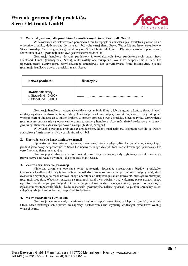 Warunki gwarancji dla produktów Steca Elektronik GmbH Warunki gwarancji dla produktów fotowoltaicznych Steca Elektronik GmbH W nawiązaniu do ustawowych przepisów Unii Europejskiej udzielana jest dwuletnia gwarancja na wszystkie produkty dedykowane do instalacji fotowoltaicznej firmy Steca. Wszystkie produkty zakupione w Steca posiadają 2-letnią gwarancję handlową od Steca Elektronik GmbH. Dla sterowników i przetwornic fotowoltaicznych, gwarancja handlowa jest rozszerzona do 5 lat. Gwarancja handlowa dotyczy produktów fotowoltaicznych Steca produkowanych przez Steca Elektronik GmbH (zwanej dalej Steca), o ile zostały one zakupione jako nowe bezpośrednio z Steca lub upoważnionego dystrybutora, certyfikowanego sprzedawcy lub certyfikowaną firmę instalacyjną. 5-letnia gwarancja handlowa dotyczy produktu marki Steca: 1. Nazwa produktu Inwerter sieciowy □ StecaGrid 10 000+ □ StecaGrid 8 000+ Nr seryjny …………............................................................. Gwarancja handlowa zaczyna się od daty wystawienia faktury lub paragonu, a kończy się po 5 latach od daty wystawienia dokumentu sprzedaży. Gwarancja handlowa dotyczy produktów, które zostały zakupione w obrębie kraju UE, a także w innych krajach, w których sprzedaje swoje produkty Steca na rynku. Uprawnienia gwarancyjne prawne nie są ograniczone przez gwarancję handlową. Aby móc złożyć reklamację w ramach gwarancji klient musi dostarczyć dowód zakupu (faktura, paragon). W sytuacji powstania problemu z urządzeniem, klient musi najpierw skontaktować się ze swoim sprzedawcą / instalatorem lub Steca Elektronik GmbH. Upoważnienie do korzystania z gwarancji Upoważnienie korzystania z gwarancji handlowej Steca wydaje tylko dla operatorów, którzy kupili produkt jako nowy bezpośrednio ze Steca lub upoważnionego dystrybutora, certyfikowanego sprzedawcy lub certyfikowaną firmę instalacyjną. Gwarancja jest udzielana na podstawie dostarczonego paragonu, a dystrybutorzy produktu nie mają prawa nabyć autoryzacji gwarancji dla produktu marki Staca. 2. Zakres i czas trwania gwarancji Niniejsza gwarancja obejmuje tylko roszczenia dotyczące sprostowania błędów produktów. Gwarancja handlowa dotyczy tylko istotnych upośledzeń funkcjonowania urządzenia oraz dotyczy wad, które ewidentnie występują na rzecz uprawnionego operatora od daty zakupu aż do końca 60. miesiąca komercyjnej gwarancji produktu. Wszelkie roszczenia z gwarancji handlowej powinny być wykonane przez uprawnionego operatora handlowego gwarancji do Steca w ciągu czternastu dni roboczych następujących po pierwszym zgłoszeniu występowania błędu. Takie roszczenia gwarancyjne należy zgłaszać do punktu sprzedaży (sieci sklepów) lub, jeśli to konieczne, bezpośrednio do Steca. 3. Wady materiałowe i wykonania Gwarancja obejmuje wady materiałowe i wykonania pod warunkiem, że ich przyczyna leży po stronie Steca. Steca zastrzega sobie prawo do naprawy, dostosowania lub wymiany wadliwych produktów według własnej oceny. 4. Str. 1 Steca Elektronik GmbH I Mammostrasse 1 I 87700 Memmingen I Niemcy I www.steca.com Tel +49 (0) 8331 8558-0 I Fax +49 (0) 8331 8558-132 Warunki gwarancji dla produktów Steca Elektronik GmbH Wyłączenia gwarancyjne Przedstawiona w punkcie 1 gwarancja na produkty Steca Elektronik GmbH nie obowiązuje, jeżeli usterka jest spowodowana przez: specyfikacje, projekt, akcesoria lub komponenty, które zostały dodane do produktu przez klienta lub na jego życzenie, bądź specjalne instrukcje klienta w odniesieniu do wykonania produktu, połączenie (produktów Steca) z innymi produktami bez wyraźnego zezwolenia Steca Elektronik GmbH; modyfikacje lub dopasowanie produktu przez klienta lub inne przyczyny leżące po stronie klienta; nieprzepisowe umiejscowienie lub montaż, nieprawidłowe lub niedbałe obchodzenie się, wypadek, transport, przepięcie, składowanie lub uszkodzenie przez klienta lub osoby trzecie; nieuchronny wypadek, pożar, eksplozję, budowę lub nową budowę jakiegokolwiek typu w otoczeniu, w którym umiejscowiony jest produkt, zjawiska natury takie jak trzęsienie ziemi, powódź lub nawałnica lub przez przyczynę, na którą Steca Elektronik GmbH nie ma żadnego wpływu; jakąkolwiek przyczynę, której nie da się przewidzieć lub której nie da się zapobiec z użyciem technologii zastosowanych przy składaniu produktu; w razie manipulacji lub zamazania numeru seryjnego i/lub numeru typu; zastosowaniach produktów solarnych w ruchomym obiekcie, na przykład na statku, w przyczepie kempingowej, itp. nieprzestrzeganie czynności pielęgnacyjnych i konserwacyjnych dla produktu, które są zalecane przez Steca w instrukcji obsługi. uszkodzenie, zabrudzenie lub zamalowanie obudowy uniemożliwiające wyczyszczenie lub naprawę. Wymieniona w niniejszej instrukcji obsługi gwarancja obowiązuje wyłącznie dla konsumentów, którzy są klientami Steca Elektronik GmbH lub którzy są autoryzowanymi przedstawicielami Steca Elektronik GmbH. Gwarancja nie przenosi się na osoby trzecie. Klient nie może przenieść w jakikolwiek sposób przysługujących mu praw lub obowiązków bez uzyskania uprzednio pisemnej zgody Steca Elektronik GmbH. Ponadto Steca Elektronik GmbH nie odpowiada w żadnym przypadku za szkody pośrednie lub utracone zyski. Z zastrzeżeniem ewentualnie obowiązujących przepisów prawnych Steca Elektronik GmbH nie odpowiada również za pozostałe szkody, których odpowiedzialność Steca Elektronik GmbH wyraźnie nie obejmuje. 5. Wykluczenie odpowiedzialności Producent nie ma możliwości nadzoru nad przestrzeganiem niniejszej instrukcji, jak również warunków i metod instalacji, użytkowania, zastosowania i konserwacji falownika. Nieprawidłowo przeprowadzona instalacja może skutkować szkodami rzeczowymi i stanowić zagrożenie dla osób. Z tego względu nie ponosimy odpowiedzialności za straty, szkody lub koszty będące wynikiem nieprawidłowe