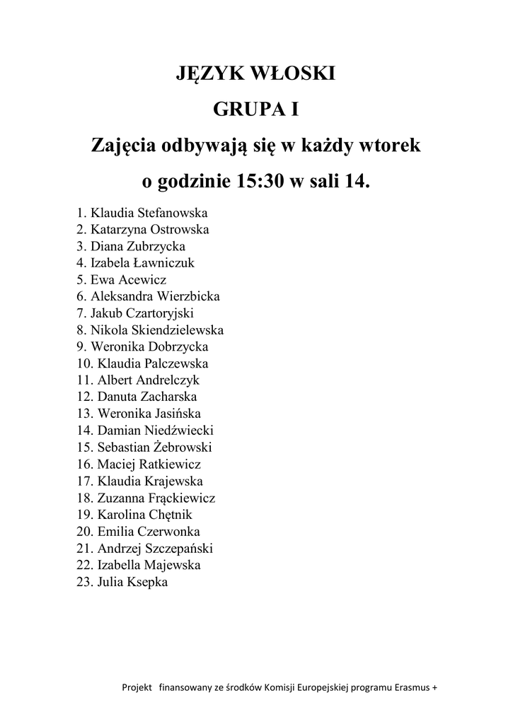 JĘZYK WŁOSKI GRUPA I Zajęcia odbywają się w każdy wtorek o godzinie 15:30 w sali 14. 1. Klaudia Stefanowska 2. Katarzyna Ostrowska 3. Diana Zubrzycka 4. Izabela Ławniczuk 5. Ewa Acewicz 6. Aleksandra Wierzbicka 7. Jakub Czartoryjski 8. Nikola Skiendzielewska 9. Weronika Dobrzycka 10. Klaudia Palczewska 11. Albert Andrelczyk 12. Danuta Zacharska 13. Weronika Jasińska 14. Damian Niedźwiecki 15. Sebastian Żebrowski 16. Maciej Ratkiewicz 17. Klaudia Krajewska 18. Zuzanna Frąckiewicz 19. Karolina Chętnik 20. Emilia Czerwonka 21. Andrzej Szczepański 22. Izabella Majewska 23. Julia Ksepka Projekt finansowany ze środków Komisji Europejskiej programu Erasmus + JĘZYK WŁOSKI GRUPA II Zajęcia odbywają się w każdą środę o godzinie 15:30 w sali 14. 1. Weronika Łoniewska 2. Daria Kmicińska 3. Aleksandra Kropiwnicka 4. Julita Kmicińska 5. Paweł Andziak 6. Paulina Dąbrowska 7. Sebastian Budziński 8. Dawid Dyczewski 9. Wiktoria Pieńkowska 10. Jakub Oliwier Plesiewicz 11. Krzysztof Wasilewski 12. Igor Płażewski 13. Daria Samosik 14. Angelika Samosienko 15. Maja Maciorowska 16. Paulina Pawlukowska 17. Patryk Gutowski 18. Ewelina Torba 19. Mateusz Buda 20. Anita Kędzierska 21. Alicja Forsow 22. Anita Szawarska 23. Dominika Bankiewicz Projekt finansowany ze środków Komisji Europejskiej programu Erasmus + JĘZYK WŁOSKI GRUPA III Zajęcia odbywają się w każdy czwartek o godzinie 15:30 w sali 14. 1. Faustyna Mosiej 2. Paulina Kiersztyn 3. Aleksandra Pilutkiewicz 4. Agata Smuga 5. Ola Wesołowska 6. Paulina Kosakowska 7. Sylwia Natalia Bakun 8. Aleksandra Kozikowska 9. Natalia Ziemkiewicz 10. Krzysztof Michalski 11. Karolina Bielecka 12. Maciej Rafał Folejewski 13. Łukasz Lewandowski 14. Katarzyna Sikorska 15. Katarzyna Dzierżyk 16. Anna Bujnowska 17. Anna Pietrewicz 18. Aleksandra Dębińska 19. Patrycja Szafranowska 20. Monika Kisielewska 21. Joanna Frylich 22. Ewa Tumiel 23. Julita Prusinowska Projekt finansowany ze środków Komisji Europejskiej programu Erasmus +