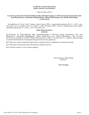 UCHWAŁA NR XLVII/1135/14 RADY MIASTA KATOWICE z dnia 26 marca 2014 r. w sprawie przekazania do Wojewódzkiego Sądu Administracyjnego w Gliwicach skargi mieszkańców ulic: Jana Baranowicza, Aleksandra Baumgardtena, Albina Siekierskiego oraz Alfreda Szklarskiego w Katowicach Na podstawie art. 18 ust. 2 pkt 15 ustawy z dnia 8 marca 1990 r. o samorządzie gminnym (Dz. U. z 2013 r., poz. 594 z późn. zm.) w związku z art. 54 § 2 ustawy z dnia 30 sierpnia 2002 r. Prawo o postępowaniu przed sądami administracyjnymi (Dz. U. z 2012 r., poz. 270 z późn. zm.) Rada Miasta Katowice uchwala: § 1. Przekazać do Wojewódzkiego Sądu Administracyjnego w Gliwicach skargę mieszkańców ulic: Jana Baranowicza, Aleksandra Baumgardtena, Albina Siekierskiego oraz Alfreda Szklarskiego z dnia 18 marca 2014 roku na uchwałę nr XL/925/13 Rady Miasta Katowice z dnia 11 września 2013 r. w sprawie zaliczenia dróg na terenie miasta Katowice do kategorii dróg powiatowych oraz gminnych. § 2. Faktyczne i prawne argumenty odpowiedzi na skargę zawiera uzasadnienie do niniejszej uchwały. § 3. Wykonanie uchwały powierzyć Prezydentowi Miasta Katowice. § 4. Uchwała wchodzi w życie z dniem podjęcia. Przewodniczący Rady Miasta Katowice Jerzy Forajter Id: DC1EB011-6327-4F17-BAE1-08644AEA8A44. Podpisany Strona 1 Uzasadnienie Pismem z dnia 18 marca 2014 r. skierowanym do organu skarżący złożyli skargę na uchwałę nr XL/925/13 Rady Miasta Katowice z dnia 11 września 2013 r. w sprawie zaliczenia dróg na terenie miasta Katowice do kategorii dróg powiatowych oraz gminnych, wnosząc o stwierdzenie nieważności zaskarżonej uchwały w części dotyczącej pozbawienia ulic: Jana Baranowicza, Aleksandra Baumgardtena, Albina Siekierskiego oraz Alfreda Szklarskiego statusu drogi gminnej (pkt. nr 1, 2, 5 i 7 Załącznika nr 3 do uchwały). Skarżący zarzucili uchwale naruszenie: - art. 10 ust. 3 ustawy z dnia 21 marca 1985 roku o drogach publicznych (Dz. U. z 2013 roku poz. 260 z późn. zm., dalej zwana: ustawą o drogach publicznych) poprzez pozbawienie statusu dróg gminnych dróg oznaczonych jako ulice Jana Baranowicza, Aleksandra Baumgardtena, Albina Siekierskiego oraz Alfreda Szklarskiego, bez jednoczesnego zaliczenia tych dróg do innej kategorii, - art 2a ustawy z dnia 21 marca 1985 roku o drogach publicznych w związku z treścią art. 10 ustawy z dnia 29 kwietnia 1985 roku o gospodarce gruntami i wywłaszczaniu nieruchomości (Dz. U. z 1991 roku, nr 30, poz. 127 t.j.), obowiązującej na dzień wydania decyzji podziałowej, tj. w dniu 18 grudnia 1995 roku, poprzez pozbawienie statusu dróg gminnych dróg oznaczonych jako ulice Jana Baranowicza, Aleksandra Baumgardtena, Albina Siekierskiego oraz Alfreda Szklarskiego pomimo braku prawnej możliwości z uwagi na przysługujące prawo własności tych nieruchomości miastu Katowice jako jednostce samorządu terytorialnego. Skarga nie zasługuje na uwzględnienie. Skarżący podnieśli, że pozbawienie ww. ulic statusu dróg gminnych narusza art. 10 ust. 3 ustawy o drogach publicznych w brzmieniu "Pozbawienie drogi dotychczasowej kategorii, z wyjątkiem przypadku wyłączenia drogi z użytkowania, jest możliwe jedynie w sytuacji jednoczesnego zaliczenia tej drogi do nowej kategorii". Wskazali oni, iż „ stan techniczny przedmiotowych dróg, jak również fakt, iż stanowią one dojazd do nieruchomości zabudowanych domami jednorodzinnymi położonych przy wskazanych wyżej ulicach, absolutnie nie uzasadnia wyłączenia ich z użytkowania". Kwestia stosowania tego przepisu znajduje potwierdzenie w orzecznictwie sądów administracyjnych (wyrok NSA z 20 lutego 2013 roku, sygn. akt I OSK 1185/2012 oraz wyrok WSA w Olsztynie z dnia 7 maja 2009 roku, sygn akt. II SA/OI 165/2009) oraz rozstrzygnięciach nadzorczych wojewodów (Rozstrzygnięcie Nadzorcze Wojewody Podlaskiego z dnia 17 stycznia 2008 roku, sygn. akt NK.II.dj.0911-3/08). Drogi te zostały zaliczone do dróg gminnych na mocy uchwały nr XXVII/366/00 Rady Miejskiej Katowic z dnia 25 września 2000 roku w sprawie zaliczenia dróg publicznych na terenie miasta Katowice do kategorii dróg powiatowych oraz gminnych. Powodem pozbawienia ww. dróg statusu dróg publicznych był ich stan własnościowy - w chwili podejmowania uchwały z dnia 25 września 2000 roku stanowiły one własność prywatną, który to stan jest sprzeczny z art. 2a ust. 2 ustawy o drogach publicznych w brzmieniu „Drogi wojewódzkie, powiatowe i gminne stanowią własność właściwego samorządu województwa, powiatu lub gminy ”. Ponadto ulice te nie posiadały atrybutu publicznego dostępu do nich z uwagi na istnienie przy wjazdach szlabanów. Wolą uchwałodawcy było więc wyeliminowanie z uchwały zapisów sprzecznych z zapisami ustawy o drogach publicznych, a w szczególności z zapisem art. 2a ust. 2 tej ustawy. Należy bowiem zaznaczyć, że drogi te w obecnym stanie własnościowym, który potwierdzają wpisy właścicielskie w księdze wieczystej nr KA1K/00001025/0, nie mogą być drogami gminnymi (publicznymi), gdyż stan taki pozostawałby w sprzeczności ww. artykułem. Pogląd taki - poza zapisami ustawy - znajduje potwierdzenie w orzecznictwie sądów administracyjnych (wyrok NSA z dnia 28 maja 2009 roku, sygn. akt I OSK 148/19) oraz rozstrzygnięciach nadzorczych wojewodów (Rozstrzygnięcia Nadzorcze Wojewody Śląskiego z dnia 19 października 2009 roku, sygn. akt. NP/II/0911/239/307/09 oraz z dnia 7 października 2011 roku, sygn. akt NP/II/0911/355/11,T Rozstrzygnięcie Nadzorcze Wojewody Warmińsko-Mazurskiego z dnia 22 grudnia 2009 roku, sygn. akt PN 0911-391/09), gdzie wskazuje się, iż aby zaliczyć drogę do dróg gminnych teren, przez który ona przebiega, musi stanowić wyłączną własność gminy. W niniejszym przypadku teren był własnością osób prywatnych w związku z czym brak było możliwości zaliczenia przedmiotowych ulic do dróg publicznych. Powyższe uzasadniało podjęcie uch
