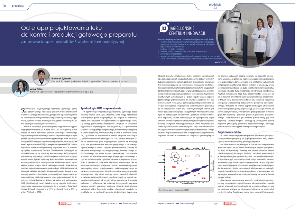 30 | 31 Od etapu projektowania leku do kontroli produkcji gotowego preparatu zastosowania spektroskopii NMR w chemii farmaceutycznej Badania wykonywane w Laboratorium Spektroskopii NMR: • określenie struktury związków chemicznych (wyznaczenie sposobu połączenia atomów budujących związek chemiczny, określenie jego budowy przestrzennej) • badanie czystości związków • badanie profilu zanieczyszczeń substancji chemicznych • produktów ich degradacji • pomoc na etapie przygotowania i projektowania badań w celu rozwiązania konkretnych problemów, jak i interpretacji otrzymanych wyników www.jci.pl dr Marek Żylewski Kierownik Pracowni Spektroskopii NMR, Jagiellońskie Centrum Innowacji Sp. z o.o. Anna Zając Kierownik Laboratoriów, Jagiellońskie Centrum Innowacji Sp. z o.o S Spektroskopia NMR – wprowadzenie pektroskopia magnetycznego rezonansu jądrowego (NMR) jest obecnie jedną z najbardziej istotnych metod analitycznych w chemii. Zakres jej zastosowania, początkowo ograniczony jedynie do analizy strukturalnej niewielkich cząsteczek organicznych, ciągle rośnie, zarówno w ilości możliwych do uzyskania informacji na temat badanych układów, jak i ich wielkości. Pierwsze obserwacje zjawiska magnetycznego rezonansu jądrowego przeprowadzono już w 1945 roku. Lata 50 przyniosły rozwój wiedzy na temat zależności zjawiska przesunięcia chemicznego i sprzężenia spinowo-spinowego od struktury chemicznej badanych próbek, co umożliwiło zastosowanie spektroskopii NMR do ustalania i potwierdzania struktury chemicznej związków. W latach 70. XX wieku wprowadzono do użycia magnesy nadprzewodzące i zastosowano w pomiarach eksperymenty impulsowe, wraz z procedurą szybkiej transformacji Fouriera. Dla chemików używających tej techniki badawczej był to milowy krok w rozwoju, który w sposób zdecydowany poprawił jej czułość i zwiększył rozdzielczość otrzymywanych widm. Był też podstawą, która umożliwiła wprowadzenie w następnej dekadzie eksperymentów wieloimpulsowych, metod akwizycji widm kolejno dwu i wielowymiarowych, dzięki którym możliwe stało się zastosowanie spektroskopii NMR do badania tak złożonych układów, jak białka i kwasy nukleinowe. Rozwój w stosowanej aparaturze i metodyce pomiarowej trwa nieprzerwanie po dzień dzisiejszy, otwierając coraz to nowe pola zastosowań dla tej potężnej techniki badawczej. O tym, jak ważna jest spektroskopia NMR dla dzisiejszej nauki, świadczą cztery nagrody Nobla otrzymane przez naukowców zajmujących się tą metodą – Felix Bloch i Edward Purcell otrzymali je w 1952 r., Richard Ernst w 1991 r. a Kurt Wuthrich w 2002 r. W spektroskopii magnetycznego rezonansu jądrowego badać możemy jedynie takie jądra atomowe, które mogą oddziaływać z zewnętrznym polem magnetycznym. Na szczęście dla chemików, wśród tych możliwych do wykorzystania w spektroskopii NMR, są izotopy pierwiastków powszechnie spotykane w związkach organicznych. Najważniejsze z nich to jądra 1H, 13C – podstawowe składniki każdego związku organicznego, bardzo ważny, szczególnie w chemii medycznej, farmaceutycznej, a także w biochemii izotop 15 N, czy istotne w metabolomice, chemii związków naturalnych i badaniu metabolitów leków jądra 19F i 31P. Umieszczenie tych jąder w zewnętrznym polu magnetycznym, pozwala na absorpcję przez nie promieniowania elektromagnetycznego o charakterystycznej energii (a zatem i częstości promieniowania), zależnej od natężenia zewnętrznego pola magnetycznego, budowy samego jądra atomowego i co wielce istotne z perspektywy zastosowania w chemii, od otoczenia chemicznego danego jądra atomowego – czyli od rozmieszczenia sąsiednich atomów w cząsteczce, ich rodzaju i sposobu ich połączenia wiązaniami chemicznymi. Na tej podstawie możliwe jest powiązanie częstości absorbowanego przez poszczególne atomy promieniowania elektromagnetycznego ze strukturą chemiczną cząsteczki umieszczonej w zewnętrznym polu magnetycznym. Idąc dalej, możemy zatem stwierdzić obecność w badanym związku różnorakich grup funkcyjnych czy różnych elementów strukturalnych jak np.: pierścienie aromatyczne, fragmenty olefinowe czy alifatyczne. Na podstawie intensywności sygnałów możemy również wyznaczyć wzajemne stosunki ilości atomów budujących różne fragmenty struktury chemicznej molekuły, co przekłada się na możliwość poznania wielkości tych fragmentów 2/2014 e-wydanie do pobrania na: www.farmacom.com.pl (długość łańcucha alifatycznego, liczbę pierścieni aromatycznych itp.). W bardzo licznych przypadkach, szczególnie dotyczy to niezbyt dużych i nieskomplikowanych cząsteczek organicznych, powiązanie tych informacji pozwala na jednoznaczne rozwiązanie, czy też potwierdzenie struktury chemicznej badanej molekuły. W przypadkach bardziej skomplikowanych, gdzie w grę wchodzą zjawiska izomerii, wzrost wielkości cząsteczki, zwiększenie różnorodności fragmentów strukturalnych ją budujących, a proste reguły wiążące częstość pochłanianego promieniowania ze strukturą cząsteczki nie dają jednoznacznych rozwiązań, z pomocą przychodzą wspomniane już w rysie historycznym eksperymenty wieloimpulsowe, pozwalające na otrzymywanie widm dwu-i wielowymiarowych. Użycie tych metod dostarcza wielkiej ilości szczegółowych informacji strukturalnych np. wskazujących na wzajemne sąsiedztwo atomów w strukturze cząsteczki, czy też pozwalających na wyodrębnianie całych układów atomów w przypadku modułowej budowy struktury molekularnej. Szczególnie interesujący dla badań chemii medycznej i biochemii był rozwój metod pozwalających na uzyskanie informacji dotyczących sąsiedztwa atomów w przestrzeni, niezależnie od samego szkieletu wiązań chemicznych. Dało to wgląd w strukturę chemiczną cząsteczki nie tylko w odniesieniu do kolejności i sposobu połącze- nia atomów budujących badaną molekuł