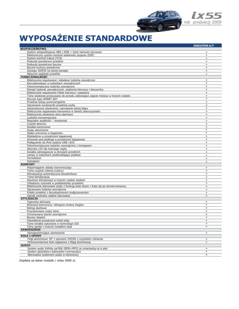 rok produkcji 2009 WYPOSAŻENIE STANDARDOWE BEZPIECZEŃSTWO System antypoślizgowy ABS z EDB + tylne hamulce tarczowe Elektroniczny system kontroli stabilności pojazdu (ESP) System kontroli trakcji (TCS) Poduszki powietrzne przednie Poduszki powietrzne boczne Boczne kurtyny powietrzne Zaczepy ISOFIX na tylnej kanapie Aktywne zagłówki przednie FUNKCJONALNOŚĆ Elektrycznie regulowane i składane lusterka zewnętrzne Kierunkowskazy w lusterkach zewnętrznych Fotochromatyczne lusterka zewnętrzne Pamięć lusterek zewnętrznych, siedzenia kierowcy i kierownicy Elektrycznie regulowane fotele kierowcy i pasażera Tylne siedzenie przesuwane do przodu ułatwiające zajęcie miejsca w trzecim rzędzie Kluczyk typu SMART KEY Przednie lampy przeciwmgielne Ogrzewane wycieraczki przedniej szyby Automatyczne otwieranie i zamykanie tylnej klapy Elektrycznie regulowana kierownica w dwóch płaszczyznach Elektrycznie otwierane okno dachowe Lusterko konwersacyjne Regulator prędkości – tempomat Czujnik deszczu Światła ksenonowe Szyby atermiczne Siatka ochronna w bagażniku Wykładzina w przestrzeni bagażowej Schowek pod podłogą w przestrzeni bagażowej Podłączenie do iPod wejście USB i AUX Fotochromatyczne lusterko wewnętrzne z kompasem Wtyczka 12V dla trzeciego rzędu Światła ostrzegawcze w drzwiach przednich Lampy w lusterkach podświetlające podłoże Immobilizer Autoalarm KOMFORT Wspomaganie układu kierowniczego Tylne czujniki cofania (cztery) Klimatyzacja automatyczna dwustrefowa Tylna klimatyzacja Nawiewy klimatyzacji w trzecim rzędzie siedzeń Chłodzony schowek w podłokietniku przednim Elektrycznie sterowane szyby z funkcją Auto Down / Auto Up po stronie kierowcy Ogrzewane lusterka zewnętrzne Fotele przednie z dwustopniowym podgrzewaniem Zamek centralny zdalnie sterowany STYLIZACJA Tapicerka skórzana Skórzana kierownica i dźwignia zmiany biegów Relingi dachowe Przyciemniane szyby tylne Chromowane klamki zewnętrzne Boczny stopień Oświetlenie przestrzeni wokół stóp Tylne światła wykonane w technologii LED Tylny spoiler z trzecim światłem stop ZAWIESZENIE Samopoziomujące zawieszenie KOŁA I OPONY Felgi aluminiowe 18" z oponami 245/60 z czujnikiem ciśnienia Pełnowymiarowe koło zapasowe z felgą aluminiową AUDIO System audio Infinity pa760r (RDS+MP3) ze zmieniarką na 6 płyt Siedem głośników+subwoofer+wzmacniacz Sterowanie systemem audio w kierownicy Dopłata za lakier metalik / mika 3000 zł. EXECUTIVE A/T + + + + + + + + + + + + + + + + + + + + + + + + + + + + + + + + + + + + + + + + + + + + + + + + + + + + + + + + + + + +