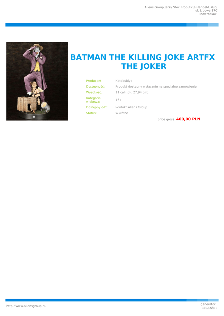 Aliens Group Jerzy Stec Produkcja-Handel-Usługi ul. Lipowa 17C Inowrocław BATMAN THE KILLING JOKE ARTFX THE JOKER Producent: Kotobukiya Dostępność: Produkt dostępny wyłącznie na specjalne zamówienie Wysokość: 11 cali (ok. 27,94 cm) Kategoria wiekowa: 16+ Dostępny od*: kontakt Aliens Group Status: Wkrótce price gross: http://www.aliensgroup.eu 460,00 PLN generator: aptusshop