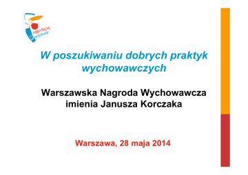 W poszukiwaniu dobrych praktyk wychowawczych Warszawska Nagroda Wychowawcza imienia Janusza Korczaka Warszawa, 28 maja 2014 Ogólne informacje o Warszawskiej Nagrodzie Wychowawczej • Patronem Nagrody jest prekursor walki o prawa dziecka, twórca nowoczesnego, antyautorytarnego systemu wychowania, lekarz z wykształcenia i zawodu, pisarz z talentu, a przede wszystkim wychowawca i pedagog z powołania i wyboru. • Nagroda jako wyróżnieniem dla warszawskich przedszkoli, szkół i placówek, poszukujących własnych, innowacyjnych i skutecznych rozwiązań w kluczowych obszarach wychowania. • Ustanowienie Warszawskiej Nagrody Wychowawczej imienia Janusza Korczaka jest jednym z elementów realizacji założeń Programu rozwoju edukacji w Warszawie w latach 2013-2020. Obszar - Podmiotowość Opis działań wychowawczych ukierunkowanych na indywidualne traktowanie uczniów, opartych na zaufaniu, partnerstwie, szacunku i dialogu, mających na celu przestrzeganie podstawowych praw dziecka, pokazujących wpływ uczniów na życie szkoły. Obszar - Samorządność Opis działań wychowawczych kształtujących postawy obywatelskie, opartych na partycypacji uczniów, aktywizujących rodziców w proces wychowawczy i życie szkoły, pobudzających zaangażowanie społeczne. Obszar - Uzdolnienia Działania wychowawcze i edukacyjne diagnozujące uzdolnienia uczniów, rozwijające postawy twórcze; kreatywna pedagogika mająca na celu wszechstronny rozwój dziecka. Obszar - Prawa dziecka Praktyczne działania wychowawcze mające na celu przedstawienie praw oraz ich respektowanie w duchu idei korczakowskiej. Obszar - Postawa nauczyciela Ukierunkowanie na potrzeby uczniów, charakteryzujące się: wrażliwością i skutecznością pedagogiczną, otwartością, odpowiedzialnością, twórczym samokrytycyzmem. Przystąpienie do konkursu • Warunkiem uczestnictwa w konkursie jest wypełnienie odpowiedniego formularza - Karty zgłoszenia do Konkursu. Formularz jest dostępny na stronie internetowej www.edukacja.warszawa.pl • Opis danego obszaru powinien być zawarty do 1800 znaków. • Placówka przystępująca do konkursu dokumentuje spełnienie założeń konkursowych przedkładając własny program wychowawczy oraz sprawozdanie z jego realizacji wraz z wynikami ewaluacji. Uczestnicy konkursu • W konkursie mogą brać udział wszystkie szkoły, przedszkola, placówki oświatowe oraz inne placówki z programem wychowawczym (np. świetlice) zlokalizowane w Warszawie (publiczne i niepubliczne) zwane dalej uczestnikami konkursu. • Konkurs jest prowadzony w pięciu kategoriach: • przedszkola, • szkoły podstawowe, • gimnazja, • szkoły ponadgimnazjalne, • inne placówki. Czas trwania oraz zasięg konkursu • Konkurs jest organizowany corocznie. • • • Konkurs będzie ogłaszany na początku roku szkolnego. I edycja Konkursu w roku szkolnym 2013/2014 Wniosek o przystąpienie do konkursu będzie można składać po zakończeniu zajęć edukacyjnych do 31 lipca 2014 r. • Działania opisywane w projekcie, za które będzie przyznana Nagroda, dotyczą całego ostatniego roku szkolnego. • Konkurs jest organizowany na terenie m.st. Warszawy. Realizacja konkursu • • • Kapituła konkursu wybierze laureatów konkursu w każdej kategorii konkursowej. W jednej kategorii może być wyłoniony więcej niż jeden laureat. Reprezentanci szkół biorących udział w konkursie zostaną zaproszeni na uroczystość wręczenia nagród - Galę Warszawskiej Nagrody Wychowawczej imienia Janusza Korczaka, Uroczystość wręczenia nagród odbędzie się 8 października 2014 r. w Ośrodku Dokumentacji i Badań „Korczakianum” – Oddziału Muzeum Historycznego m.st. Warszawy. Lista laureatów zostanie opublikowana na stronie internetowej www.edukacja.warszawa.pl Nagroda • Warszawska Nagroda Wychowawcza imienia Janusza Korczaka ma charakter honorowego wyróżnienia. • Przyznanie tytułu laureata nagrody ma charakter prestiżowy i podkreśla skuteczną działalność wychowawczą placówek. • Laureat nagrody otrzymuje statuetkę Warszawskiej Nagrody Wychowawczej imienia Janusza Korczaka oraz list gratulacyjny od Prezydenta m.st. Warszawy w uznaniu zasług w sferze wychowania. • Nagrodzone projekty będą zamieszczone na stronie Biura Edukacji i Warszawskiego Centrum Innowacji EdukacyjnoSpołecznych i Szkoleń jako przykłady dobrych praktyk wychowawczych. Warszawa, zabierając głos w jakiejkolwiek sprawie, przemawiać musi jak stolica – pod tym, co mówi, pulsować musi to, co najnowsze, najmniej odgadnione, najbardziej przyszłościowe… JANUSZ KORCZAK