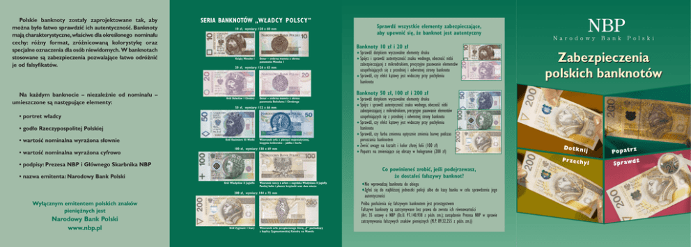 Polskie banknoty zosta∏y zaprojektowane tak, aby mo˝na by∏o ∏atwo sprawdziç ich autentycznoÊç. Banknoty majà charakterystyczne,w∏aÊciwe dla okreÊlonego nomina∏u cechy: ró˝ny format, zró˝nicowanà kolorystyk´ oraz specjalne oznaczenia dla osób niewidomych. W banknotach stosowane sà zabezpieczenia pozwalajàce ∏atwo odró˝niç je od falsyfikatów. Na ka˝dym banknocie – niezale˝nie od nomina∏u – umieszczone sà nast´pujàce elementy: SERIA BANKNOTÓW „W¸ADCY POLSCY” 10 z∏, wymiary: 120 x 60 mm Banknoty 10 z∏ i 20 z∏ Ksià˝´ Mieszko I Denar – srebrna moneta z okresu panowania Mieszka I 20 z∏, wymiary: 126 x 63 mm Denar – srebrna moneta z okresu panowania Boles∏awa I Chrobrego • portret w∏adcy • god∏o Rzeczypospolitej Polskiej • wartoÊç nominalna wyra˝ona cyfrowo Król Kazimierz III Wielki Wizerunek or∏a z piecz´ci majestatycznej, insygnia królewskie - jab∏ko i ber∏o 100 z∏, wymiary: 138 x 69 mm • podpisy: Prezesa NBP i G∏ównego Skarbnika NBP zabezpieczajàcej z mikrodrukiem, precyzyjne pasowanie elementów uzupe∏niajàcych si´ z przedniej i odwrotnej strony banknotu • Sprawdê, czy efekt kàtowy jest widoczny przy pochyleniu banknotu Zabezpieczenia polskich banknotów • Sprawdê dotykiem wyczuwalne elementy druku • Spójrz i sprawdê autentycznoÊç znaku wodnego, obecnoÊç nitki zabezpieczajàcej z mikrodrukiem, precyzyjne pasowanie elementów uzupe∏niajàcych si´ z przedniej i odwrotnej strony banknotu • Sprawdê, czy efekt kàtowy jest widoczny przy pochyleniu banknotu • Sprawdê, czy farba zmienna optycznie zmienia barw´ podczas poruszania banknotem • Zwróç uwag´ na kszta∏t i kolor z∏otej folii (100 z∏) • Popatrz na zmieniajàce si´ obrazy w hologramie (200 z∏) Co powinieneÊ zrobiç, jeÊli podejrzewasz, ˝e dosta∏eÊ fa∏szywy banknot? • nazwa emitenta: Narodowy Bank Polski Król W∏adys∏aw II Jagie∏∏o Wizerunek tarczy z or∏em z nagrobka W∏adys∏awa II Jagie∏∏y. Poni˝ej he∏m i p∏aszcz krzy˝acki oraz dwa miecze 200 z∏, wymiary: 144 x 72 mm Wy∏àcznym emitentem polskich znaków pieni´˝nych jest Narodowy Bank Polski www.nbp.pl • Sprawdê dotykiem wyczuwalne elementy druku • Spójrz i sprawdê autentycznoÊç znaku wodnego, obecnoÊç nitki Banknoty 50 z∏, 100 z∏ i 200 z∏ Król Boles∏aw I Chrobry 50 z∏, wymiary: 132 x 66 mm • wartoÊç nominalna wyra˝ona s∏ownie Sprawdê wszystkie elementy zabezpieczajàce, aby upewniç si´, ˝e banknot jest autentyczny Król Zygmunt I Stary Wizerunek or∏a przeplecionego literà „S” pochodzàcy z kaplicy Zygmuntowskiej Katedry na Wawelu ➧ Nie wprowadzaj banknotu do obiegu ➧ Zg∏oÊ si´ do najbli˝szej jednostki policji albo do kasy banku w celu sprawdzenia jego autentycznoÊci Próba pos∏u˝enia si´ fa∏szywym banknotem jest przest´pstwem Fa∏szywe banknoty sà zatrzymywane bez prawa do zwrotu ich równowartoÊci (Art. 35 ustawy o NBP (Dz.U. 97.140.938 z póên. zm.); zarzàdzenie Prezesa NBP w sprawie zatrzymywania fa∏szywych znaków pieni´˝nych (M.P. 89.32.255 z póên. zm.)) Dotknij P o p at r z P r ze c hy S p r aw d l ê Dotknij Popatrz Elementy wykonane specjalnà technikà druku sà w charakterystyczny sposób wyczuwalne dotykiem. • Du˝e cyfrowe oznaczenie nomina∏u • Nazwa emitenta • Portret w∏adcy Przechyl Oglàdajàc banknot pod Êwiat∏o, zwróç uwag´ na: Znak wodny • Znak wodny na banknocie odpowiada wizerunkowi w∏adcy z przedniej strony banknotu Nitk´ zabezpieczajàcà • W papierze banknotu znajduje si´ nitka zabezpieczajàca • Z obu stron banknotu widoczny jest na nitce napis zawierajàcy cyfrowe oznaczenie nomina∏u i skrót „Z¸” Banknoty majà oznaczenia dla osób niewidomych, u∏atwiajàce rozpoznanie ich wartoÊci. Recto-verso • Oglàdane pod Êwiat∏o korony w owalach uzupe∏niajà si´ i tworzà pe∏ny obraz • Korony znajdujà si´ na obu stronach ka˝dego banknotu i sà otoczone cyfrowym oznaczeniem nomina∏u Sprawdê Farba zmienna optycznie • Ozdobne elementy graficzne przy pochyleniu banknotu w kierunku Êwiat∏a wyraênie zmieniajà barw´ z ró˝owo-fioletowej na oliwkowo-zielonà Z∏otà foli´ • Z∏ota folia umieszczona jest wy∏àcznie na banknocie 100 z∏ • Nale˝y zwróciç uwag´ na jej wielkoÊç, kszta∏t, kolor i po∏ysk Efekt kàtowy (jeden obraz) • Przy pochyleniu banknotu w p∏aszczyênie poziomej w zale˝noÊci od kàta patrzenia widoczne sà jasne lub ciemne cyfry nomina∏u (banknoty 10 i 20 z∏) Mikrodruki • Mikrodruki to napisy wykonane bardzo ma∏ymi literami, umieszczone na przedniej i odwrotnej stronie wszystkich banknotów • Najmniejszy tekst na banknocie powinien byç czytelny i wyraêny w powi´kszeniu Efekt kàtowy (dwa obrazy) • Przy pochyleniu banknotu w p∏aszczyênie poziomej w zale˝noÊci od kàta patrzenia widoczne sà cyfry nomina∏u bàdê korona (banknoty 50, 100 i 200 z∏) Hologram • Hologram wykonany jest z folii i umieszczony tylko na banknocie 200 z∏ • Podczas oglàdania hologramu pod ró˝nym kàtem widoczna jest zmiana barwy i rysunku Farba metalizowana • Na banknotach 10 i 20 z∏ farba metalizowana umieszczona jest po lewej stronie portretu w∏adcy • Przy pochyleniu banknotu widoczny jest metaliczny po∏ysk powierzchni • Na banknotach 50, 100 i 200 z∏ farba metalizowana umieszczona jest po prawej stronie portretu w∏adcy • Przy pochyleniu banknotu widoczny jest metaliczny po∏ysk powierzchni Banknot w Êwietle UV • Elementy Êwiecàce w Êwietle ultrafioletowym: - kwadrat z wartoÊcià nominalnà, - numeracja po prawej stronie portretu w∏adcy, - elementy wykonane farbà metalizowanà. Dotknij Popatrz Elementy wykonane specjalnà technikà druku sà w charakterystyczny sposób wyczuwalne dotykiem. • Du˝e cyfrowe oznaczenie nomina∏u • Nazwa emitenta • Portret w∏adcy Przechyl Oglàdajàc banknot pod Êwia