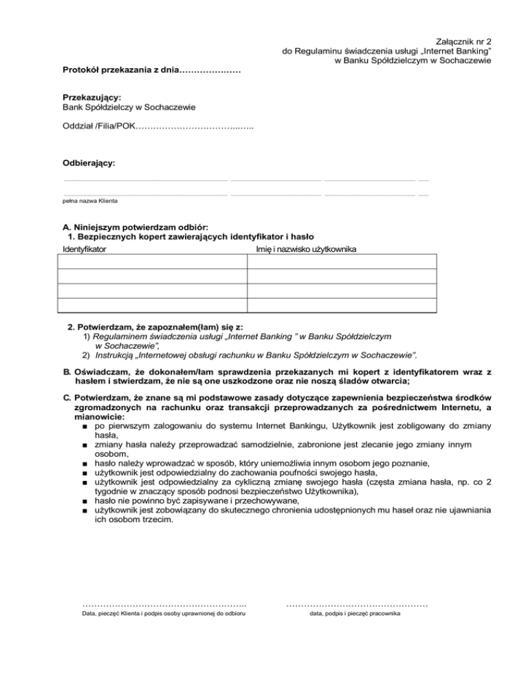 Załącznik nr 2 do Regulaminu świadczenia usługi „Internet Banking” w Banku Spółdzielczym w Sochaczewie Protokół przekazania z dnia………………… Przekazujący: Bank Spółdzielczy w Sochaczewie Oddział /Filia/POK……………………………...….. Odbierający: .............................................................................................................. ............................................................. ............................................................. ....... .............................................................................................................. ............................................................. ............................................................. ....... pełna nazwa Klienta A. Niniejszym potwierdzam odbiór: 1. Bezpiecznych kopert zawierających identyfikator i hasło Identyfikator Imię i nazwisko użytkownika 2. Potwierdzam, że zapoznałem(łam) się z: 1) Regulaminem świadczenia usługi „Internet Banking ” w Banku Spółdzielczym w Sochaczewie”, 2) Instrukcją „Internetowej obsługi rachunku w Banku Spółdzielczym w Sochaczewie”. B. Oświadczam, że dokonałem/łam sprawdzenia przekazanych mi kopert z identyfikatorem wraz z hasłem i stwierdzam, że nie są one uszkodzone oraz nie noszą śladów otwarcia; C. Potwierdzam, że znane są mi podstawowe zasady dotyczące zapewnienia bezpieczeństwa środków zgromadzonych na rachunku oraz transakcji przeprowadzanych za pośrednictwem Internetu, a mianowicie: ■ po pierwszym zalogowaniu do systemu Internet Bankingu, Użytkownik jest zobligowany do zmiany hasła, ■ zmiany hasła należy przeprowadzać samodzielnie, zabronione jest zlecanie jego zmiany innym osobom, ■ hasło należy wprowadzać w sposób, który uniemożliwia innym osobom jego poznanie, ■ użytkownik jest odpowiedzialny do zachowania poufności swojego hasła, ■ użytkownik jest odpowiedzialny za cykliczną zmianę swojego hasła (częsta zmiana hasła, np. co 2 tygodnie w znaczący sposób podnosi bezpieczeństwo Użytkownika), ■ hasło nie powinno być zapisywane i przechowywane, ■ użytkownik jest zobowiązany do skutecznego chronienia udostępnionych mu haseł oraz nie ujawniania ich osobom trzecim. ……………………………………………….. Data, pieczęć Klienta i podpis osoby uprawnionej do odbioru ………………………………………… data, podpis i pieczęć pracownika