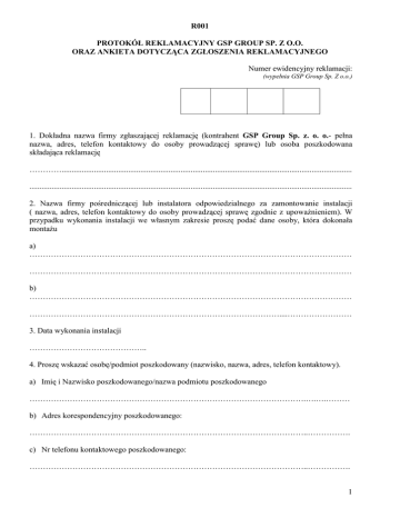 R001 PROTOKÓŁ REKLAMACYJNY GSP GROUP SP. Z O.O. ORAZ ANKIETA DOTYCZĄCA ZGŁOSZENIA REKLAMACYJNEGO Numer ewidencyjny reklamacji: (wypełnia GSP Group Sp. Z o.o.) 1. Dokładna nazwa firmy zgłaszającej reklamację (kontrahent GSP Group Sp. z. o. o.- pełna nazwa, adres, telefon kontaktowy do osoby prowadzącej sprawę) lub osoba poszkodowana składająca reklamację …………................................................................................................................................................ ................................................................................................................................................................ 2. Nazwa firmy pośredniczącej lub instalatora odpowiedzialnego za zamontowanie instalacji ( nazwa, adres, telefon kontaktowy do osoby prowadzącej sprawę zgodnie z upoważnieniem). W przypadku wykonania instalacji we własnym zakresie proszę podać dane osoby, która dokonała montażu a) ………………………………………………………………………………………………………… ………………………………………………………………………………………………………… b) ………………………………………………………………………………………………………… …………………………………………………………………………………....…………………… 3. Data wykonania instalacji …………………………………….. 4. Proszę wskazać osobę/podmiot poszkodowany (nazwisko, nazwa, adres, telefon kontaktowy). a) Imię i Nazwisko poszkodowanego/nazwa podmiotu poszkodowanego ………………………………………………………………………………………….….….……… b) Adres korespondencyjny poszkodowanego: …………………………………………………………………………………………..……………. c) Nr telefonu kontaktowego poszkodowanego: …………………………………………………………………………………………..……………. 1 R001 PROTOKÓŁ REKLAMACYJNY GSP GROUP SP. Z O.O. ORAZ ANKIETA DOTYCZĄCA ZGŁOSZENIA REKLAMACYJNEGO d) Adres e-mail: …………………………………………………………………………………………..……………. 5. Data powstania szkody. ……………………………………………………………….. 6. Adres powstania szkody …………………………………………………………………………………………………..…….. 7. Proszę przedstawić kopie dokumentów zakupowych z danymi firmy sprzedającej (numery faktur zakupu oraz daty ich wystawienia). ………………………………………………………………………………………………………… ………………………………………………………………………………………………………… 8. Przedmiot reklamacji (prawidłowe zakreśl). a) [ b) [ c) [ ] produkty instalacji sanitarnych – rury i kształtki pp ] produkty instalacji sanitarnych – rury i kształtki pex ] inne Dokładny opis produktu: …………………………………………………………………………….………….……………… …………………………………………………………………………………………………….… 9. Proszę podać z czego wykonana i poprowadzona jest instalacja (prawidłowe zaznacz). a) [ ] PP b) [ ] PVC c) [ ] CPVC d) [ ] PEX e) [ ] ALU-PEX 10. Rodzaj uszkodzonej instalacji: a) [ ] centralne ogrzewanie b) [ ] ciepła woda użytkowa c) [ ] zimna woda użytkowa 11. Kiedy i w jakich okolicznościach została stwierdzona awaria: ................................................................................................................................................................ 2 R001 PROTOKÓŁ REKLAMACYJNY GSP GROUP SP. Z O.O. ORAZ ANKIETA DOTYCZĄCA ZGŁOSZENIA REKLAMACYJNEGO 12. Czy poszkodowany dysponuje projektami instalacji z tworzyw sztucznych (prawidłowe zakreśl). a) [ ] centralne ogrzewania b) [ ] ciepła woda użytkowa c) [ ] zimna woda użytkowa d) [ ] ogrzewanie podłogowe Czy zamontowana instalacja została wykonana zgodnie z projektami? a) [ ] tak b) [ ] nie 13. Czy montażu instalacji dokonywała wyspecjalizowana firma instalatorska? Jeśli tak to jaka? Proszę podać dokładne dane Wykonawcy. ................................................................................................................................................................ 14. Opis sposobu poprowadzenia instalacji. ………………………………………………………………………………………………………… ………………………………………………………………………………………………………… 15. Opis powstałej szkody. ………………………………………………………………………………………………………… ………………………………………………………………………………………………………… 16. Wykaz pomieszczeń, w których doszło do awarii (prawidłowe zaznacz). a) [ ] pokoje b) [ ] łazienki c) [ ] wc d) [ ] kuchnia e) [ ] przedpokój/hol f) [ ] garaż g) [ ] strych h) [ ] poddasze i) [ ] kotłownia j) [ ] pomieszczenia gospodarcze k) [ ] inne Dokładny opis pomieszczeń: ................................................................................................................................................................ ................................................................................................................................................................ 3 R001 PROTOKÓŁ REKLAMACYJNY GSP GROUP SP. Z O.O. ORAZ ANKIETA DOTYCZĄCA ZGŁOSZENIA REKLAMACYJNEGO 17. Opis strat spowodowanych awarią. ...................