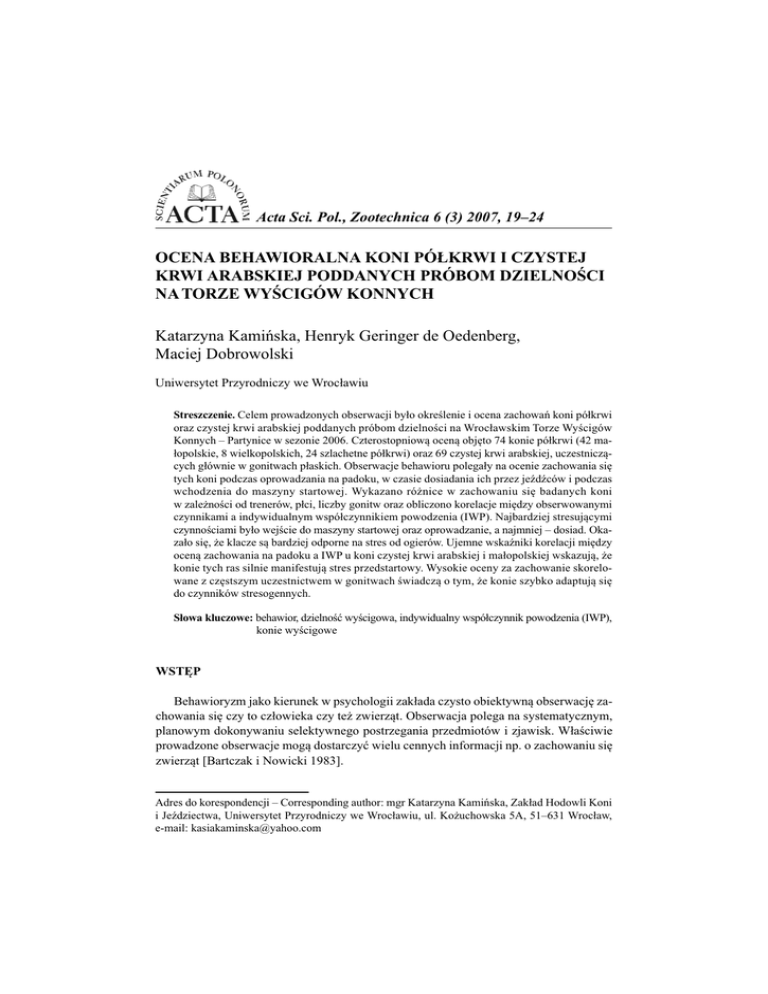 Acta Sci. Pol., Zootechnica 6 (3) 2007, 19–24 OCENA BEHAWIORALNA KONI PÓŁKRWI I CZYSTEJ KRWI ARABSKIEJ PODDANYCH PRÓBOM DZIELNOŚCI NA TORZE WYŚCIGÓW KONNYCH Katarzyna Kamińska, Henryk Geringer de Oedenberg, Maciej Dobrowolski Uniwersytet Przyrodniczy we Wrocławiu Streszczenie. Celem prowadzonych obserwacji było określenie i ocena zachowań koni półkrwi oraz czystej krwi arabskiej poddanych próbom dzielności na Wrocławskim Torze Wyścigów Konnych – Partynice w sezonie 2006. Czterostopniową oceną objęto 74 konie półkrwi (42 małopolskie, 8 wielkopolskich, 24 szlachetne półkrwi) oraz 69 czystej krwi arabskiej, uczestniczących głównie w gonitwach płaskich. Obserwacje behawioru polegały na ocenie zachowania się tych koni podczas oprowadzania na padoku, w czasie dosiadania ich przez jeźdźców i podczas wchodzenia do maszyny startowej. Wykazano różnice w zachowaniu się badanych koni w zależności od trenerów, płci, liczby gonitw oraz obliczono korelacje między obserwowanymi czynnikami a indywidualnym współczynnikiem powodzenia (IWP). Najbardziej stresującymi czynnościami było wejście do maszyny startowej oraz oprowadzanie, a najmniej – dosiad. Okazało się, że klacze są bardziej odporne na stres od ogierów. Ujemne wskaźniki korelacji między oceną zachowania na padoku a IWP u koni czystej krwi arabskiej i małopolskiej wskazują, że konie tych ras silnie manifestują stres przedstartowy. Wysokie oceny za zachowanie skorelowane z częstszym uczestnictwem w gonitwach świadczą o tym, że konie szybko adaptują się do czynników stresogennych. Słowa kluczowe: behawior, dzielność wyścigowa, indywidualny współczynnik powodzenia (IWP), konie wyścigowe WSTĘP Behawioryzm jako kierunek w psychologii zakłada czysto obiektywną obserwację zachowania się czy to człowieka czy też zwierząt. Obserwacja polega na systematycznym, planowym dokonywaniu selektywnego postrzegania przedmiotów i zjawisk. Właściwie prowadzone obserwacje mogą dostarczyć wielu cennych informacji np. o zachowaniu się zwierząt [Bartczak i Nowicki 1983]. Adres do korespondencji – Corresponding author: mgr Katarzyna Kamińska, Zakład Hodowli Koni i Jeździectwa, Uniwersytet Przyrodniczy we Wrocławiu, ul. Kożuchowska 5A, 51–631 Wrocław, e-mail: [email protected] 20 K. Kamińska i in. Rozwój tego kierunku na przestrzeni lat doprowadził do zdumiewających odkryć. Poszukiwania w literaturze fachowej dowodzą jednak, że konie nie należą do faworyzowanych zwierząt w badaniach naukowych dotyczących etologii. Najczęściej naukowcy są zainteresowani specyficznym, powtarzającym się modelem zachowania osobników danego gatunku [Neumann-Cosel-Nebe 1997, Krupa 2003]. Właściwości psychiczne koni są szczególnie ważne dla jeźdźców i powożących. W sporcie wyczynowym istotne są takie cechy jak wysoki poziom inteligencji, równowaga nerwowa, umiejętność skupienia uwagi, pamięć, odwaga i chęć współpracy z człowiekiem. Dobry trener powinien należycie oceniać takie osobniki, które odznaczają się wymienionymi cechami, a także je rozwijać i utrwalać [Mickunas 1998, Fitko 1999, Jezierski i in. 2006]. Jedną z wielu metod zweryfikowania wartości użytkowej są próby dzielności, a wśród nich gonitwy wyścigowe. Umożliwiają one właściwe wyselekcjonowanie koni najdzielniejszych, celem dalszego użycia ich do hodowli i użytkowania. Wyścigi mają też zapewnić właściwe przeprowadzenie ostatniego stadium wychowu [Sosnowski 1966, Byszewski 1999, Budzyński i in. 2001, Budzyński i in. 2003]. W ostatnim okresie coraz więcej uwagi przywiązuje się do uwarunkowań dzielności wyścigowej cechami psychiki danego osobnika. Zrównoważenie nerwowe szczególnie istotne jest u koni, których większość form wykorzystania sprowadza się do bezpośredniego kontaktu z człowiekiem. Dlatego też zastosowanie łatwo mierzalnych wskaźników, mogących wyrażać stan psychiczny i jego zmiany, ma znaczną przydatność praktyczną [Kamieniak i in. 1999, Kosiniak-Kamysz 1999, Sapuła i in. 2006]. Stopień wytrenowania konia wyścigowego ocenianego wizualnie przekłada się na wielkości różnych wskaźników fizjologicznych takich jak: tętno, puls i zawartość różnych metabolitów w płynach ustrojowych (mocz, krew) [Geringer i in. 2001, Kaproń 2003, Kaproń i Janczarek 2004]. Odpowiednie właściwości układu nerwowego są podstawowym atrybutem wysokiej wartości konia sportowego, użytkowanego czy to w zakresie cech wierzchowych czy też zaprzęgowych [Kamieniak 1999]. Znajomość behawioru koni oraz właściwe z nimi postępowanie gwarantuje bezpieczeństwo człowieka, efektywne użytkowanie, satysfakcję dla właściciela i hodowcy oraz dobrostan zwierząt [Geringer i in. 2001, Jezierski i in. 2006]. Celem prowadzonych obserwacji było określenie i ocena zachowań koni półkrwi oraz czystej krwi arabskiej poddanych próbom dzielności na Wrocławskim Torze Wyścigów Konnych (WTWK) – Partynice w sezonie 2006. Temat podjętych w pracy badań jest niezwykle istotny. Głębsze poznanie uwarunkowań psychicznych umożliwia wybór i pozostawienie do dalszej hodowli osobników najlepszych. MATERIAŁ I METODY Badaniami objęto 74 konie półkrwi (42 małopolskich, 8 wielkopolskich, 24 szlachetne półkrwi) oraz 69 czystej krwi arabskiej poddanych próbom wyścigowym na Wrocławskim Torze Wyścigów Konnych – Partynice we Wrocławiu w sezonie wyścigowym 2006. Obserwacje polegały na ocenie zachowania się tych koni podczas oprowadzania na padoku, w czasie dosiadania ich przez jeźdźców i podczas wchodzenia do maszyny starActa Sci. Pol. Ocena behawioralna koni półkrwi i czystej krwi arabskiej... 21 towej. Przy ocenie poszczególnych koni zastosowano następującą punktację: 1. Oprowadzanie: – (1 pkt.) ocena mierna: „stawanie dęba”, kopanie, nerwowe kręcenie się wokół prowadzącego, wyrywanie się; – (2 pkt.) ocena d