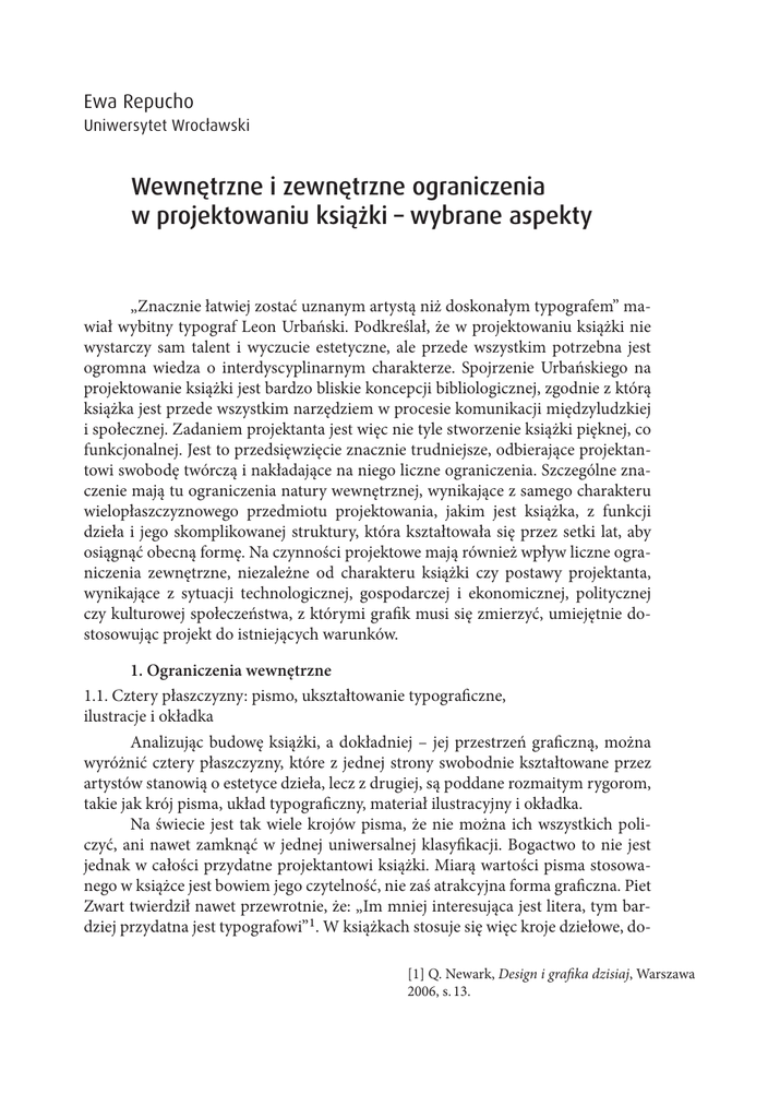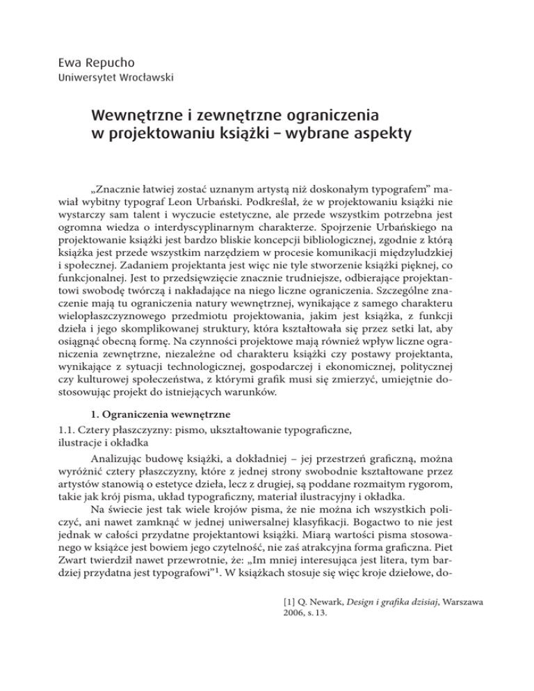 Ewa Repucho Uniwersytet Wrocławski Wewnętrzne i zewnętrzne ograniczenia w projektowaniu książki – wybrane aspekty „Znacznie łatwiej zostać uznanym artystą niż doskonałym typografem” mawiał wybitny typograf Leon Urbański. Podkreślał, że w projektowaniu książki nie wystarczy sam talent i wyczucie estetyczne, ale przede wszystkim potrzebna jest ogromna wiedza o interdyscyplinarnym charakterze. Spojrzenie Urbańskiego na projektowanie książki jest bardzo bliskie koncepcji bibliologicznej, zgodnie z którą książka jest przede wszystkim narzędziem w procesie komunikacji międzyludzkiej i społecznej. Zadaniem projektanta jest więc nie tyle stworzenie książki pięknej, co funkcjonalnej. Jest to przedsięwzięcie znacznie trudniejsze, odbierające projektantowi swobodę twórczą i nakładające na niego liczne ograniczenia. Szczególne znaczenie mają tu ograniczenia natury wewnętrznej, wynikające z samego charakteru wielopłaszczyznowego przedmiotu projektowania, jakim jest książka, z funkcji dzieła i jego skomplikowanej struktury, która kształtowała się przez setki lat, aby osiągnąć obecną formę. Na czynności projektowe mają również wpływ liczne ograniczenia zewnętrzne, niezależne od charakteru książki czy postawy projektanta, wynikające z sytuacji technologicznej, gospodarczej i ekonomicznej, politycznej czy kulturowej społeczeństwa, z którymi grafik musi się zmierzyć, umiejętnie dostosowując projekt do istniejących warunków. 1. Ograniczenia wewnętrzne 1.1. Cztery płaszczyzny: pismo, ukształtowanie typograficzne, ilustracje i okładka Analizując budowę książki, a dokładniej – jej przestrzeń graficzną, można wyróżnić cztery płaszczyzny, które z jednej strony swobodnie kształtowane przez artystów stanowią o estetyce dzieła, lecz z drugiej, są poddane rozmaitym rygorom, takie jak krój pisma, układ typograficzny, materiał ilustracyjny i okładka. Na świecie jest tak wiele krojów pisma, że nie można ich wszystkich policzyć, ani nawet zamknąć w jednej uniwersalnej klasyfikacji. Bogactwo to nie jest jednak w całości przydatne projektantowi książki. Miarą wartości pisma stosowanego w książce jest bowiem jego czytelność, nie zaś atrakcyjna forma graficzna. Piet Zwart twierdził nawet przewrotnie, że: „Im mniej interesująca jest litera, tym bardziej przydatna jest typografowi”1. W książkach stosuje się więc kroje dziełowe, do[1] Q. Newark, Design i grafika dzisiaj, Warszawa 2006, s. 13. 36 EWA REPUCHO stosowane do składania długich tekstów, o odpowiedniej budowie liter, która wpływa na komfort i higienę czytania. Dobre pismo to takie, które ułatwia jak największym kręgom czytelników odbieranie treści z optymalną szybkością i z najmniejszym wysiłkiem 2. Adrian Frutiger uważa, że powstawanie optymalnych kształtów czytelnego pisma można porównać do procesu krystalizacji – wybitne kroje pisma formowano w ciągu stuleci ich używania 3. Już w renesansie powstały kroje, które dziś nie tylko stanowią przykład mistrzowskiego projektowania, lecz także są z powodzeniem wykorzystywane przez współczesnych wydawców. Wciąż popularne są w składzie dziełowym m.in. antykwa renesansowa Garamond, barokowe Baskerville czy Caslon, a także klasycystyczne antykwy Bodoni, Walbaum i podobne. Do XVIII wieku zasób pism był bardzo ograniczony. Składając książkę, stosowano zazwyczaj jeden krój pisma w trzech odmianach: podstawowej, pochyłej i półgrubej. Niewielki był też dostępny zestaw znaków. Drukarz miał do dyspozycji zazwyczaj duże i małe litery, znaki akcentowe, ligatury, znaki interpunkcyjne i cyfry. Adrian Frutiger uważa jednak, że w tym ograniczeniu środków wyrazu leży istota piękna, które wywiera na nas tak silne wrażenie podczas oglądania starych ksiąg 4. Podobne rozważania prowadzą do pytania, czy w takim razie, istnieje jeszcze potrzeba projektowania nowych krojów pism dziełowych. Czy nie wystarczą nam pisma, które ukształtowała 500-letnia tradycja drukarska? A może wystarczyłby jeden wzorzec pisma do składania długich tekstów? Okazuje się, że nie, że i ta poddana wielu rygorom dziedzina projektowania wymaga jednak pewnej różnorodności i dostosowania do potrzeb współczesności. Według Frutigera unifikacja środków graficznego wyrazu jest powszechnie odbierana jako istotne zaburzenie formy przekazu, a więc oprócz jakości pisma znaczenie ma także jego estetyka i styl odpowiadający duchowi czasu 5. Projektowanie pism dziełowych jest więc ważną i wymagającą gałęzią grafiki użytkowej. Na świecie rozwija się bardzo prężnie. Natomiast na polskim rynku wciąż istnieje niedosyt pism naszych literników. Projektowanie pisma niestety nie było nigdy traktowane priorytetowo przez polskie Akademie Sztuk Pięknych, ale powoli się to zmienia. W ostatnich latach na szczęście pojawił się w Polsce twórczy ferment w tej dziedzinie [il. 1]. Ukształtowanie typograficzne książki było i jest tematem wielu rozważań teoretycznych. Dominuje myśl o kongenialności/totalności dzieła oraz jedności treści, formy i funkcji 6. Teoretycy są niemal zgodni w tym, że projektowanie książki jest sztuką komunikacji, a więc głównym celem jest „graficzna interpretacja drukowanej informacji” czy „znalezienie odpowiedniej formy dla przekazania konkretnej treści” 7. Mimo tej zgodności teoretycznej w praktyce wciąż zbyt wielu projektantów i odbiorców informacji uważa, że celem typografii jest nadanie publikacji ciekawej [2] A. Frutiger, Człowiek i jego znaki, Warszawa 2003, s. 150. [3] Tamże, s. 164. [4] Tamże, s. 147. [5] Tamże, s. 163. [6] A.Tomaszewski, O jedności treści, formy i funkcji (książki), [w:] Zapiski książkoroba, Warszawa 2006, s. 18–20. [7] A.Tomaszewski, Leksykon pism drukarskich, Warszawa 1996, s. 232. WEWNĘTRZNE I ZEWNĘTRZNE OGRANICZENIA W PROJEKTOWANIU KSIĄŻK