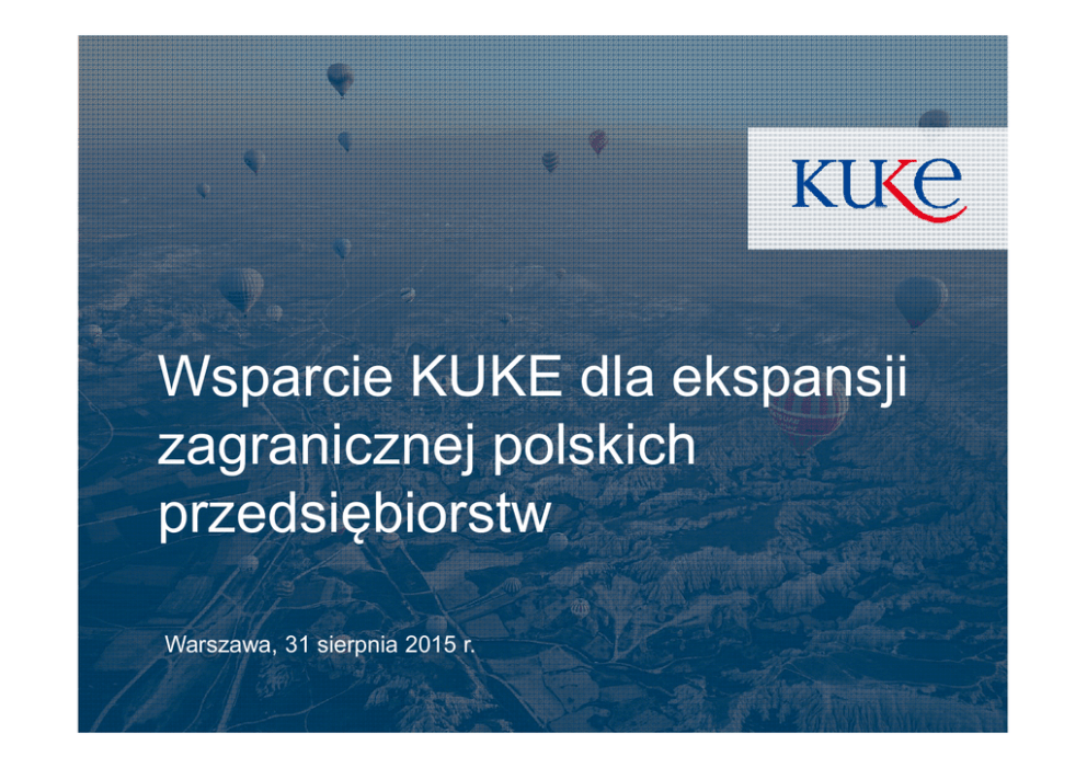 Wsparcie KUKE dla ekspansji zagranicznej polskich przedsiębiorstw Warszawa, 31 sierpnia 2015 r. Korporacja Ubezpieczeń Kredytów Eksportowych Spółka Akcyjna 1 Kim jesteśmy? • Jesteśmy specjalistą w ubezpieczaniu transakcji eksportowych i krajowych realizowanych na warunkach kredytowych. • Posiadamy ustawowy mandat na prowadzenie ubezpieczeń eksportowych gwarantowanych przez Skarb Państwa. • Jesteśmy polskim ubezpieczycielem należności z przeważającym udziałem Skarbu Państwa. • Wspieramy polskich przedsiębiorców od blisko 25 lat. 2 Rola KUKE 1 Wspieranie proeksportowych działań przedsiębiorców poprzez przeniesienie ryzyka transakcji eksportowych z przedsiębiorcy na wyspecjalizowaną instytucję ubezpieczeniową. 2 Oferowanie instrumentów ubezpieczeniowych, którymi nie dysponują prywatni ubezpieczyciele lub dysponują w ograniczonym zakresie. 3 Umożliwienie przedsiębiorcom dostępu do źródeł finansowania. 3 Narzędzia w ofercie KUKE wspierające działalność eksportową Ubezpieczenia należności Gwarancje Ubezpieczenia inwestycji bezpośrednich Faktoring 4 Obszary ryzyka w transakcjach eksportowych Kredyt kupiecki Transport Partner handlowy Towar i jego cena Kraj partnera handlowego Dokumenty i przepisy Ryzyko kursowe Własność intelektualna 5 Adresaci ubezpieczeń eksportowych gwarantowanych przez Skarb Państwa Przedsiębiorcy mający miejsce zamieszkania lub siedzibę na terytorium Rzeczypospolitej Polskiej, którzy: realizują eksport na warunkach kredytowych, realizują eksport krajowych towarów lub usług, dokonują inwestycji za granicą. Jednostki finansujące kontrakty eksportowe, realizowane przez przedsiębiorców, którzy spełniają warunki określone powyżej. 6 Wymóg krajowości eksportowanego produktu • Ustawa z dnia 7 lipca 1994 r. o gwarantowanych przez Skarb Państwa ubezpieczeniach eksportowych (Dz. U. z 2001 r. Nr 59, poz. 609, z późn. zmianami) art. 6a – 6e ustawy dotyczą warunków, jakie muszą spełniać produkty lub usługi eksportowane w ramach kontraktu eksportowego, aby można je było uznać za krajowe. • Rozporządzenie Ministra Gospodarki z dnia 19 grudnia 2015 r. (Dz. U. z 2014 r. poz. 1978) określa maksymalny procentowy udział składników pochodzenia zagranicznego w przychodzie netto z realizacji kontraktu eksportowego oraz rodzaje dowodów, na podstawie których ustala się pochodzenie produktu lub usługi. 7 Program rządowy Finansowe Wspieranie Eksportu • Cel: ułatwienie zagranicznym oraz polskim przedsiębiorcom dostępu do kredytów finansujących eksport polskich towarów i usług. • Przyjęty przez Radę Ministrów 30 lipca 2009 r. • Oferowany przez BGK przy współpracy z KUKE. • Skierowany do wszystkich przedsiębiorców bez względu na branżę i wielkość. • Preferencyjne warunki finansowania. • Finansowanie dotyczy eksportu polskich towarów i usług. 8 Iran Kontrakty z terminem płatności do 2 lat • Zaangażowanie KUKE: 2,8 mln zł (kwota czynnych limitów kredytowych). • Eksporterzy z branży spożywczej. Kontrakty z terminem płatności 2 i więcej lat • Od 2010 r. Iran jest czasowo wyłączony z pokrycia ubezpieczeniowego. 9 Zapraszamy do współpracy www.kuke.com.pl (22) 356 80 00 [email protected] ul. Sienna 38, 00-121 Warszawa 10