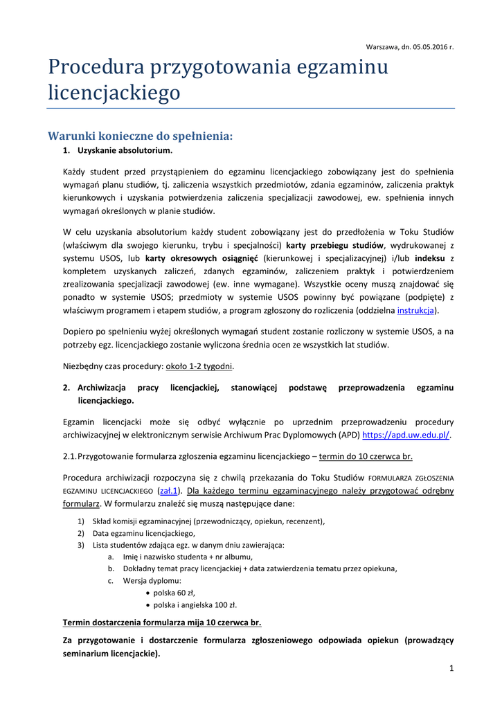 Warszawa, dn. 05.05.2016 r. Procedura przygotowania egzaminu licencjackiego Warunki konieczne do spełnienia: 1. Uzyskanie absolutorium. Każdy student przed przystąpieniem do egzaminu licencjackiego zobowiązany jest do spełnienia wymagań planu studiów, tj. zaliczenia wszystkich przedmiotów, zdania egzaminów, zaliczenia praktyk kierunkowych i uzyskania potwierdzenia zaliczenia specjalizacji zawodowej, ew. spełnienia innych wymagań określonych w planie studiów. W celu uzyskania absolutorium każdy student zobowiązany jest do przedłożenia w Toku Studiów (właściwym dla swojego kierunku, trybu i specjalności) karty przebiegu studiów, wydrukowanej z systemu USOS, lub karty okresowych osiągnięć (kierunkowej i specjalizacyjnej) i/lub indeksu z kompletem uzyskanych zaliczeń, zdanych egzaminów, zaliczeniem praktyk i potwierdzeniem zrealizowania specjalizacji zawodowej (ew. inne wymagane). Wszystkie oceny muszą znajdować się ponadto w systemie USOS; przedmioty w systemie USOS powinny być powiązane (podpięte) z właściwym programem i etapem studiów, a program zgłoszony do rozliczenia (oddzielna instrukcja). Dopiero po spełnieniu wyżej określonych wymagań student zostanie rozliczony w systemie USOS, a na potrzeby egz. licencjackiego zostanie wyliczona średnia ocen ze wszystkich lat studiów. Niezbędny czas procedury: około 1-2 tygodni. 2. Archiwizacja pracy licencjackiego. licencjackiej, stanowiącej podstawę przeprowadzenia egzaminu Egzamin licencjacki może się odbyć wyłącznie po uprzednim przeprowadzeniu procedury archiwizacyjnej w elektronicznym serwisie Archiwum Prac Dyplomowych (APD) https://apd.uw.edu.pl/. 2.1. Przygotowanie formularza zgłoszenia egzaminu licencjackiego – termin do 10 czerwca br. Procedura archiwizacji rozpoczyna się z chwilą przekazania do Toku Studiów FORMULARZA ZGŁOSZENIA EGZAMINU LICENCJACKIEGO (zał.1). Dla każdego terminu egzaminacyjnego należy przygotować odrębny formularz. W formularzu znaleźć się muszą następujące dane: 1) Skład komisji egzaminacyjnej (przewodniczący, opiekun, recenzent), 2) Data egzaminu licencjackiego, 3) Lista studentów zdająca egz. w danym dniu zawierająca: a. Imię i nazwisko studenta + nr albumu, b. Dokładny temat pracy licencjackiej + data zatwierdzenia tematu przez opiekuna, c. Wersja dyplomu: polska 60 zł, polska i angielska 100 zł. Termin dostarczenia formularza mija 10 czerwca br. Za przygotowanie i dostarczenie formularza zgłoszeniowego odpowiada opiekun (prowadzący seminarium licencjackie). 1 Po dostarczeniu formularza zgłoszeniowego (w wersji papierowej i elektronicznej) administracja (w kolejności zgłoszeń) wprowadza otrzymane dane do systemu USOS. Po tej procedurze następuje otwarcie procesu archiwizacji po stronie serwisu APD dla studenta, opiekuna i recenzenta. 2.2. Proces archiwizacji w APD Archiwizacja przeprowadzana jest kolejno przez studenta, opiekuna i recenzenta. Student zobowiązany jest do: a. wprowadzenia do APD streszczenia, słów kluczowych i tematu pracy w języku angielskim, b. przesłania do APD pliku z pracą licencjacką w formacie [pdf]; nazwa pliku wg schematu: 3000-LIC-FP-indywidualny nr PESEL studenta (przykład: 3000-LIC-FP-83092500036.pdf) Opiekun zobowiązany jest do: a. sprawdzenia i potwierdzenia poprawności wpisanych danych przez studenta, b. sprawdzenia pracy programem antyplagiatowym (dostępny w APD) c. napisania i wprowadzenia do APD recenzji przed egzaminem licencjackim. Recenzent zobowiązany jest do napisania i wprowadzenia do APD recenzji przed egzaminem licencjackim. 3. Przygotowanie wersji papierowej pracy licencjackiej Student przygotowuje papierowy egzemplarz pracy licencjackiej do akt studenckich. Praca powinna być wydrukowana dwustronnie i zbindowana. Egzemplarz pracy przeznaczony do akt student zobowiązany jest przynieść na egzamin licencjacki. 4. Egzamin licencjacki Egzamin licencjacki może się odbyć wyłącznie po uprzednim wypełnieniu czynności z punku 1, 2 i 3. Student zobowiązany jest dostarczyć na egzamin licencjacki: a. egzemplarz pracy, b. dokumenty do dyplomu (tj. potwierdzenie opłaty i zdjęcia do dyplomu 4 szt. + 1 do wersji ang. – 4,5 x 6,5 cm). Komisja egzaminacyjna zobowiązana jest do umieszczenia w dokumentacji studenckiej podpisanych recenzji, raportu z programu antyplagiatowego, pracy licencjackiej oraz dostarczonych przez studenta dokumentów do dyplomu (tj. potwierdzenie opłaty i zdjęcia). 2