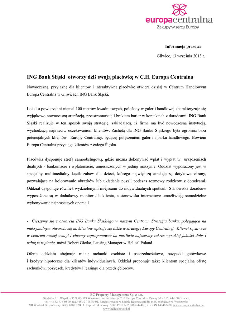 Informacja prasowa Gliwice, 13 września 2013 r. ING Bank Śląski otworzy dziś swoją placówkę w C.H. Europa Centralna Nowoczesną, przyjazną dla klientów i interaktywną placówkę otwiera dzisiaj w Centrum Handlowym Europa Centralna w Gliwicach ING Bank Śląski. Lokal o powierzchni niemal 100 metrów kwadratowych, położony w galerii handlowej charakteryzuje się wyjątkowo nowoczesną aranżacją, przestronnością i brakiem barier w kontaktach z doradcami. ING Bank Śląski realizuje w ten sposób swoją strategię, zakładającą, iż firma ma być nowoczesną instytucją, wychodzącą naprzeciw oczekiwaniom klientów. Zachętą dla ING Banku Śląskiego była ogromna baza potencjalnych klientów Europy Centralnej, będącej połączeniem galerii i parku handlowego. Bowiem Europa Centralna przyciąga klientów z całego Śląska. Placówka dysponuje strefą samoobsługową, gdzie można dokonywać wpłat i wypłat w urządzeniach dualnych - bankomacie i wpłatomacie, umieszczonych w jednej maszynie. Oddział wyposażony jest w specjalny multimedialny kącik zabaw dla dzieci, którego największą atrakcją są dotykowe ekrany, pozwalające na kolorowanie obrazków lub układanie puzzli podczas rozmowy rodziców z doradcami. Oddział dysponuje również wydzielonymi miejscami do indywidualnych spotkań. Stanowiska doradców wyposażone są w dodatkowy monitor dla klienta, a stanowiska internetowe umożliwiają samodzielne wykonywanie najprostszych operacji. - Cieszymy się z otwarcia ING Banku Śląskiego w naszym Centrum. Strategia banku, polegająca na maksymalnym otwarciu się na klientów wpisuje się także w strategię Europy Centralnej. Klienci są zawsze w centrum naszej uwagi i chcemy zaproponować im możliwie najszerszy zakres wysokiej jakości dóbr i usług w regionie, mówi Robert Gietko, Leasing Manager w Helical Poland. Oferta oddziału obejmuje m.in.: rachunki osobiste i oszczędnościowe, pożyczki gotówkowe i kredyty hipoteczne dla klientów indywidualnych. Oddział proponuje także klientom specjalną ofertę rachunków, pożyczek, kredytów i leasingu dla przedsiębiorców. EC Property Management Sp. z o.o. Siedziba: Ul. Wspólna 35/9, 00-519 Warszawa. Administracja C.H. Europa Centralna: Pszczyńska 315, 44-100 Gliwice, tel. +48 32 778 50 00, fax.+48 32 778 50 01. Zarejestrowana w Sądzie Rejonowym dla m.st. Warszawy w Warszawie, XII Wydział Gospodarczy, KRS:0000359411. Kapitał zakładowy: 5000 PLN, NIP:7010244486, REGON:142467400. www.europacentralna.eu, www.helicalpoland.pl W pierwszym tygodniu funkcjonowania oddziału tj.w dniach 14 - 21 września bank przygotował promocję „Konto z prezentem”. Każda osoba, która założy internetowe konto Direct, otrzyma bezprzewodowy internet. Centrum Handlowe Europa Centralna o powierzchni 67 tys. metrów kwadratowych jest jednym z największych tego typu obiektów komercyjnych w Polsce. Unikalny koncept galerii, oferuje klientom możliwość zrobienia wszystkich niezbędnych zakupów od artykułów spożywczych, przez materiały do budowy domu, po ubrania z najnowszych kolekcji. Położenie obiektu, przy jednym z największych węzłów autostradowych w Polsce (Gliwice-Sośnica), gdzie łączą się autostrady A1 i A4 i droga krajowa nr 44 oraz na obszarze gęsto zaludnionego Górnośląskiego Okręgu Przemysłowego, sprawia, że niemal 5 mln osób może w ciągu godziny dojechać tu na zakupy. Na miejscu skorzystać można z wypożyczalni parasoli, pomieszczeń dla rodziców z dziećmi, 600 miejsc siedzących dla klientów piętra restauracyjnego, paczkomatu, bezpłatnego wi-fi dostępnego na terenie całego Centrum oraz wielu bankomatów i punktów usługowych. Klienci mogą zostawić swój samochód na dużym, liczącym 2,3 tys. miejsc parkingu, a niezmotoryzowani dojadą na zakupy bezpłatnymi liniami autobusowymi. Wśród najemców są takie firmy jak: Saturn, Castorama, Tesco Extra, Jula, Ski Team, Sports Direct, Jysk, SMYK Megastore, RTV Euro AGD, New Yorker, Reserved, H&M, Cubus, Lindex, CCC, Bershka, Solar, Monnari, Clooud, Apart, TUI, Home and You, Super Pharm, Neckermann, Deichmann, City Sport, Mohito, Promod, Cortland Apple Premium Reseller, Stradivarius, Rossmann, TAKKO Fashion, Douglas, a dla najmłodszych - Kinderplaneta. Kontakt dla dziennikarzy: www.europacentralna.eu Helical Poland Sp. z o.o. ul. Wspólna 35/9 00-519 Warszawa Więcej informacji: Marta Chodkowska Tel. 601 244 127 [email protected] Marketing Director C. H .Europa Centralna Katarzyna Skalska Tel. 501 699 261 [email protected] Leasing:: Robert Gietko Tel. 605 451 060 [email protected] Marta Gołębiowska Tel. 663 918 160 [email protected] Cook Communications Tomasz Rożek Tel. 663 171 033 [email protected] Agencja Preria Magdalena Łońska Tel. 605 560 074 [email protected] EC Property Management Sp. z o.o. Siedziba: Ul. Wspólna 35/9, 00-519 Warszawa. Administracja C.H. Europa Centralna: Pszczyńska 315, 44-100 Gliwice, tel. +48 32 778 50 00, fax.+48 32 778 50 01. Zarejestrowana w Sądzie Rejonowym dla m.st. Warszawy w Warszawie, XII Wydział Gospodarczy, KRS:0000359411. Kapitał zakładowy: 5000 PLN, NIP:7010244486, REGON:142467400. www.europacentralna.eu, www.helicalpoland.pl