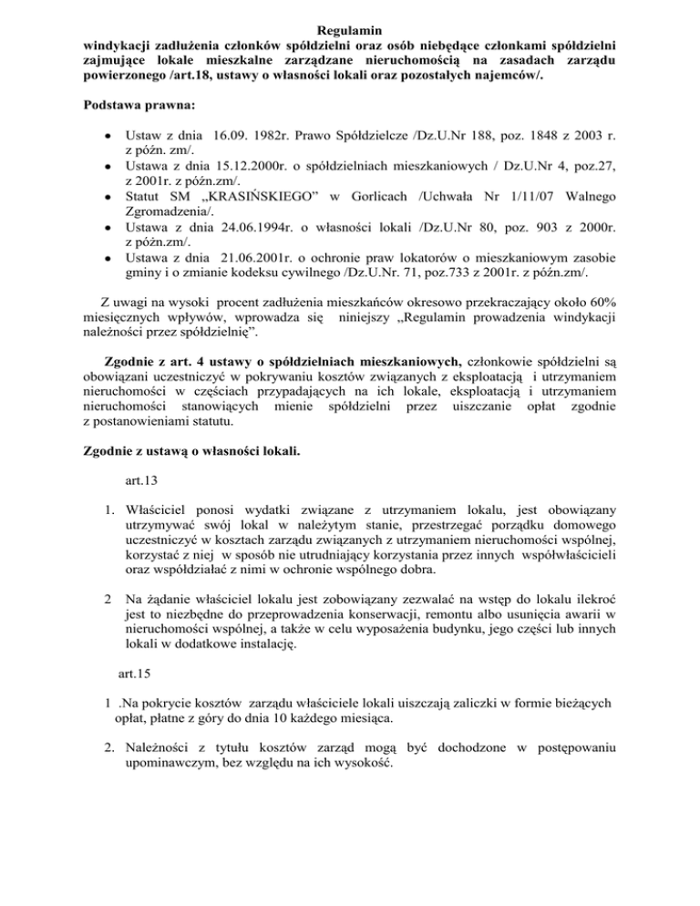 Regulamin windykacji zadłużenia członków spółdzielni oraz osób niebędące członkami spółdzielni zajmujące lokale mieszkalne zarządzane nieruchomością na zasadach zarządu powierzonego /art.18, ustawy o własności lokali oraz pozostałych najemców/. Podstawa prawna: Ustaw z dnia 16.09. 1982r. Prawo Spółdzielcze /Dz.U.Nr 188, poz. 1848 z 2003 r. z późn. zm/. Ustawa z dnia 15.12.2000r. o spółdzielniach mieszkaniowych / Dz.U.Nr 4, poz.27, z 2001r. z późn.zm/. Statut SM „KRASIŃSKIEGO” w Gorlicach /Uchwała Nr 1/11/07 Walnego Zgromadzenia/. Ustawa z dnia 24.06.1994r. o własności lokali /Dz.U.Nr 80, poz. 903 z 2000r. z póżn.zm/. Ustawa z dnia 21.06.2001r. o ochronie praw lokatorów o mieszkaniowym zasobie gminy i o zmianie kodeksu cywilnego /Dz.U.Nr. 71, poz.733 z 2001r. z późn.zm/. Z uwagi na wysoki procent zadłużenia mieszkańców okresowo przekraczający około 60% miesięcznych wpływów, wprowadza się niniejszy „Regulamin prowadzenia windykacji należności przez spółdzielnię”. Zgodnie z art. 4 ustawy o spółdzielniach mieszkaniowych, członkowie spółdzielni są obowiązani uczestniczyć w pokrywaniu kosztów związanych z eksploatacją i utrzymaniem nieruchomości w częściach przypadających na ich lokale, eksploatacją i utrzymaniem nieruchomości stanowiących mienie spółdzielni przez uiszczanie opłat zgodnie z postanowieniami statutu. Zgodnie z ustawą o własności lokali. art.13 1. Właściciel ponosi wydatki związane z utrzymaniem lokalu, jest obowiązany utrzymywać swój lokal w należytym stanie, przestrzegać porządku domowego uczestniczyć w kosztach zarządu związanych z utrzymaniem nieruchomości wspólnej, korzystać z niej w sposób nie utrudniający korzystania przez innych współwłaścicieli oraz współdziałać z nimi w ochronie wspólnego dobra. 2 Na żądanie właściciel lokalu jest zobowiązany zezwalać na wstęp do lokalu ilekroć jest to niezbędne do przeprowadzenia konserwacji, remontu albo usunięcia awarii w nieruchomości wspólnej, a także w celu wyposażenia budynku, jego części lub innych lokali w dodatkowe instalację. art.15 1 .Na pokrycie kosztów zarządu właściciele lokali uiszczają zaliczki w formie bieżących opłat, płatne z góry do dnia 10 każdego miesiąca. 2. Należności z tytułu kosztów zarząd mogą być dochodzone w postępowaniu upominawczym, bez względu na ich wysokość. 2 art.16 1. Jeżeli właściciel lokalu zalega długotrwale z zapłatą należnych od niego opłat lub wykracza w sposób rażący lub uporczywy przeciwko obowiązującemu porządkowi domowemu albo przez swoje niewłaściwe zachowanie czyni korzystanie z innych lokali lub nieruchomości wspólnej uciążliwym, wspólnota mieszkaniowa może w trybie procesu żądać sprzedaży lokalu w drodze licytacji na podstawie przepisów Kodeksu postępowania cywilnego o egzekucji z nieruchomości. Właścicielowi, którego lokal został sprzedany nie przysługuje prawo do lokalu zamiennego. Zgodnie z Statutem Spółdzielni § 16 ust.3: Członek zobowiązany jest regularnie uiszczać opłaty za używanie należących do niego lokali w wysokości określonej przez Spółdzielnię § 95 do 101 określają sposób ustalenia i wnoszenie opłat za używanie lokali. W świetle przytoczonych podstaw prawnych ustala się następujący tok postępowania w prowadzeniu windykacji należności. §1 1. Wszystkie opłaty należy wnosić zgodnie ze Statutem § 99 z góry do dnia 15 każdego miesiąca. 2. Każdy użytkownik lokalu mieszkalnego zalegający z opłatą: a) do dwóch miesięcy otrzyma pisemne upomnienie; b) po trzech miesiącach wezwanie do zapłaty. c) po czterech miesiącach wezwanie na rozmowy wyjaśniające na posiedzeniu Rady Nadzorczej celem zawarcie umowy ugody. Nie spełnienie warunków umowy ugody przez dłużnika skutkować będzie wykluczeniem ze spółdzielni ( zgodnie z § 19 ust. 1,2 pkt.1 Statutu) i skierowaniem sprawy na drogę postępowania sądowego bez dodatkowych ostrzeżeń. d) W przypadku braku umowy po pięciu miesiącach wezwanie ostateczne przed procesowe. e) Po sześciu miesiącach sprawa zostanie skierowana na drogę postępowania sądowego. §2 Od wszystkich zaległości będą naliczane odsetki ustawowe, bez możliwości odstąpienia od ich naliczania. §3 Od przesłanych upomnień i korespondencji związanej z windykacją zostaną pobierane dodatkowe opłaty (pocztowe, przesyłki polecone, za potwierdzeniem zwrotnym, nieodebrana korespondencja i inne). §4 Zgodnie z § 82, ust. 2 oraz § 146 ust. 14 Statutu, Rada Nadzorcza określa w formie regulaminu szczegółowe zasady gospodarki Spółdzielni w ramach przepisów ustawy, prawa spółdzielczego i postanowień statutu. 3 §5 Niniejszy regulamin został przyjęty Uchwałą Nr 5/12 Rady Nadzorczej z dnia 20.08.2012r. i obowiązuje od dnia przyjęcia. .