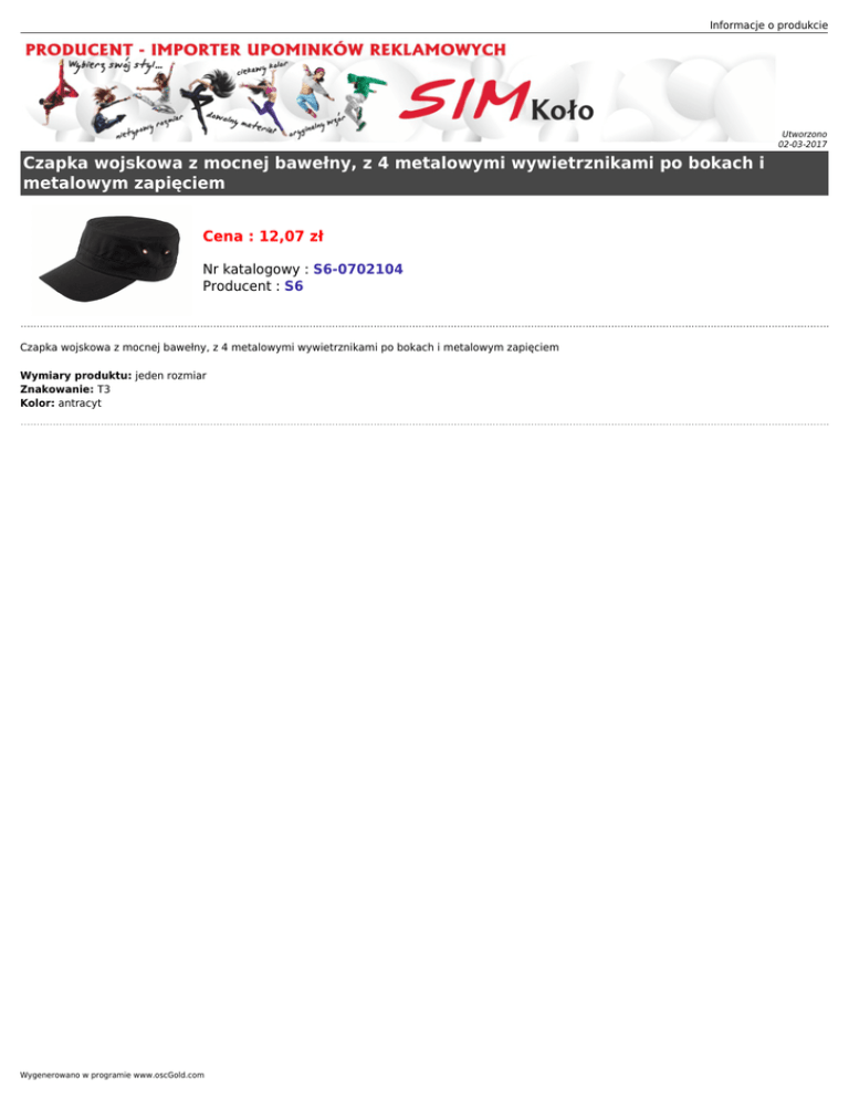 Informacje o produkcie Utworzono 02-03-2017 Czapka wojskowa z mocnej bawełny, z 4 metalowymi wywietrznikami po bokach i metalowym zapięciem Cena : 12,07 zł Nr katalogowy : S6-0702104 Producent : S6 Czapka wojskowa z mocnej bawełny, z 4 metalowymi wywietrznikami po bokach i metalowym zapięciem Wymiary produktu: jeden rozmiar Znakowanie: T3 Kolor: antracyt Wygenerowano w programie www.oscGold.com