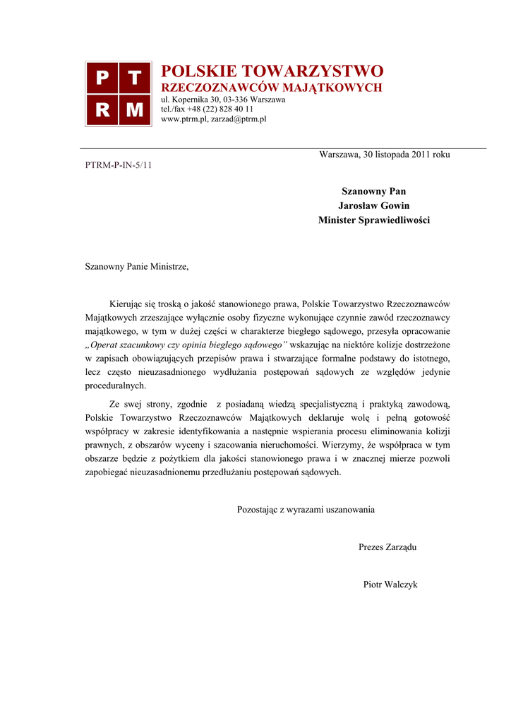 POLSKIE TOWARZYSTWO RZECZOZNAWCÓW MAJĄTKOWYCH ul. Kopernika 30, 03-336 Warszawa tel./fax +48 (22) 828 40 11 www.ptrm.pl, [email protected] Warszawa, 30 listopada 2011 roku PTRM-P-IN-5/11 Szanowny Pan Jarosław Gowin Minister Sprawiedliwości Szanowny Panie Ministrze, Kierując się troską o jakość stanowionego prawa, Polskie Towarzystwo Rzeczoznawców Majątkowych zrzeszające wyłącznie osoby fizyczne wykonujące czynnie zawód rzeczoznawcy majątkowego, w tym w dużej części w charakterze biegłego sądowego, przesyła opracowanie „Operat szacunkowy czy opinia biegłego sądowego” wskazując na niektóre kolizje dostrzeżone w zapisach obowiązujących przepisów prawa i stwarzające formalne podstawy do istotnego, lecz często nieuzasadnionego wydłużania postępowań sądowych ze względów jedynie proceduralnych. Ze swej strony, zgodnie z posiadaną wiedzą specjalistyczną i praktyką zawodową, Polskie Towarzystwo Rzeczoznawców Majątkowych deklaruje wolę i pełną gotowość współpracy w zakresie identyfikowania a następnie wspierania procesu eliminowania kolizji prawnych, z obszarów wyceny i szacowania nieruchomości. Wierzymy, że współpraca w tym obszarze będzie z pożytkiem dla jakości stanowionego prawa i w znacznej mierze pozwoli zapobiegać nieuzasadnionemu przedłużaniu postępowań sądowych. Pozostając z wyrazami uszanowania Prezes Zarządu Piotr Walczyk 2 „Operat szacunkowy czy opinia biegłego sądowego” – opracował Zbigniew Pałgan Udział rzeczoznawcy majątkowego w czynnościach procesowych nacechowany jest dość daleko idącą autonomią, wyraźnie oddzielającą ją od zakresu czynności przedstawicieli innych profesji. Umocowanie powyższego odnaleźć można w ustawie o gospodarce nieruchomościami oraz przepisach wykonawczych do niej. Na ile ta autonomia sprzyja sprawności prowadzonych postępowań, praktyka jak na razie niewiele ujawnia. Bynajmniej nie z powodu doskonałości wdrożonych rozwiązań, co raczej z rozsądku w zakresie interpretacji. Niestety, współcześnie takie doświadczenie praktyki już przestaje wystarczać, a nawet zaczyna być dla organów procesowych kłopotliwe. Należy zauważyć, że prowadzenie czynności procesowych na podstawie wiadomości specjalnych, które posiada rzeczoznawca majątkowy, musi uwzględniać autonomiczne regulacje tego zawodu. Regulacje te, niekiedy dość drastycznie odmiennie definiują poszczególne czynności od tych, które na zasadach ogólnych wykonuje biegły sądowy. W obszarze tym pojawiają się różnice, mogące istotnie zakłócać prowadzone postępowania, a przy użyciu wysublimowanej wiedzy prawnej, wręcz niekiedy je blokować. Kwestia interpretacji przepisów, dylematów i rozstrzygnięć prawnych pomiędzy lex specialis czy lex generalis, może prowadzić do przykrych konsekwencji natury procesowej lub zawodowej, a wszak nie jest to obszar wiadomości specjalnych, które rzeczoznawca majątkowy posiada. Sposób postępowania wybrany przez podsądnych dla osiągania założonego przez nich celu, dotykać może tak szerokiego spectrum spraw, jakie jest ono bezwzględnie skuteczne dla realizacji korzystnego rozstrzygnięcia. Poszukiwanie formalnych przesłanek wyekstrahowanych z zasad wykonywania zawodu, ubogaca możliwości przeprowadzania swoich spraw skutecznie. A jest gdzie doszukiwać się kolizji prawnych, różnic w interpretacjach, czyli potencjalnych źródeł sporów i w konsekwencji, konieczności ich rozstrzygania na etapie odwołań, kasacji – jeśli tylko to miałoby być efektywnym dążeniem do wydłużenia postępowania. Meritum sprawy nie zawsze jest sednem sporu, niekiedy jest nim sam spór i jego przewlekanie. W takiej sytuacji staje biegły sądowy, a nie posiadając wiedzy specjalistycznej z zakresu prawa, staje często na pozycji przegranej. Pamiętać przy tym należy, że dla biegłego sądowego przykrym skutkiem może być nie tylko oddalenie jego opinii. Przegraną i to dotkliwą, bywa samo podejrzenie o wadliwości wydanej opinii sądowej, nie mówiąc już o odwlekaniu decyzji procesowych, w tym na przykład o przyznaniu wynagrodzenia i rzeczywistego przelania środków. Strona postępowania sądowego niezadowolona z orzeczenia, może (i często tak jest) „odgrywać się” na biegłym korzystając z przysługującego jej prawa do zaskarżenia decyzji – bo to przecież jego opinia „pokrzywdziła” przegranego. Odpowiedzialność zawodowa, to kolejny obszar cech szczególnych zawodu rzeczoznawcy majątkowego, nieznany w obszarze sprawowania funkcji biegłego sądowego, takim sytuacjom mogący sprzyjać. Na styku prawa materialnego i procesowego, sporządzane opinie szczególnie narażone są na ocenę formalną, mogąca skutkować odrzucaniem ich jako dowodów, pomimo nawet poprawnego odwzorowania relacji rynkowych, oszacowanego wyniku oraz wniosków. Naturalnym wtedy staje się pytanie, jakie konsekwencje powinien ponieść autor skoro czynności wykonał wadliwie, niezależnie od tego, że owa wadliwość nie wynika z warsztatu zawodowego, a z natury i skomplikowania uregulowań poza nim leżących. Nieodparcie przy tym rodzi się pytanie następne, dlaczego czynności procesowe mają się gmatwać i przedłużać, z tychże samych względów? Coraz częściej pojawiające się postępowania, w których jedna opinia zastępowana jest kolejnymi, są zjawiskiem opisującym rodzące się konflikty. 3 Poniżej zaprezentowany został zestaw tez i poglądów, dotyczących zakresu odpowiedzialności zawodowej rzeczoznawcy majątkowego, w związku ze sporządzanymi przez niego opiniami, w szczególnym przypadku, sporządzanymi na potrzeby postępowań sądowych i przygotowawczych. Stosownie do regulacji zawartej w art. 178 ust. 1 ustawy o gospodarce nieruchomościami, rzeczoznawca majątkowy niewypełniający obowiązków, o których mowa w art. 158 oraz art. 175, podlega odpowiedzialności zawodowej. Ma on bowiem obowiązek: - p