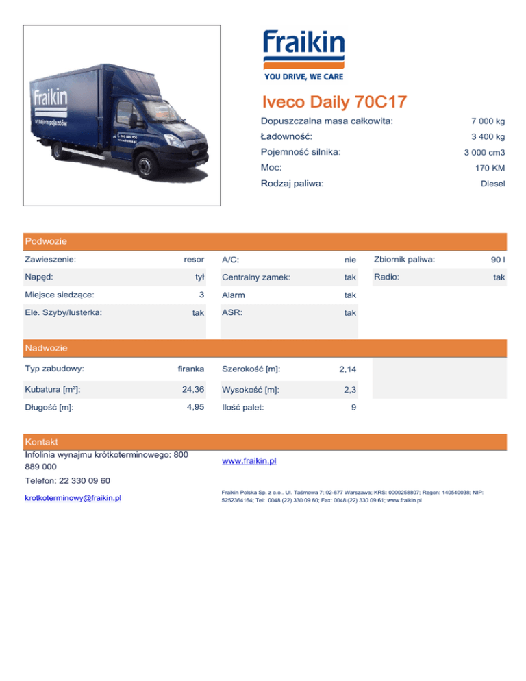 Iveco Daily 70C17 Dopuszczalna masa całkowita: 7 000 kg Ładowność: 3 400 kg Pojemność silnika: 3 000 cm3 Moc: 170 KM Rodzaj paliwa: Diesel Podwozie Zawieszenie: resor Napęd: A/C: nie Zbiornik paliwa: 90 l Centralny zamek: tak Radio: tak 3 Alarm tak tak ASR: tak tył Miejsce siedzące: Ele. Szyby/lusterka: Nadwozie Typ zabudowy: firanka Szerokość [m]: 2,14 Kubatura [m³]: 24,36 Wysokość [m]: 2,3 Długość [m]: 4,95 Ilość palet: 9 Kontakt Infolinia wynajmu krótkoterminowego: 800 889 000 www.fraikin.pl Telefon: 22 330 09 60 [email protected] Fraikin Polska Sp. z o.o.. Ul. Taśmowa 7; 02-677 Warszawa; KRS: 0000258807; Regon: 140540038; NIP: 5252364164; Tel: 0048 (22) 330 09 60; Fax: 0048 (22) 330 09 61; www.fraikin.pl