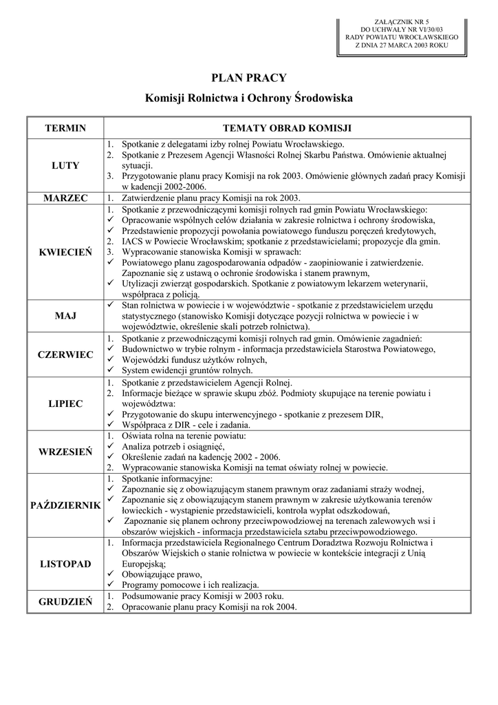 ZAŁĄCZNIK NR 5 DO UCHWAŁY NR VI/30/03 RADY POWIATU WROCŁAWSKIEGO Z DNIA 27 MARCA 2003 ROKU PLAN PRACY Komisji Rolnictwa i Ochrony Środowiska TERMIN TEMATY OBRAD KOMISJI 1. Spotkanie z delegatami izby rolnej Powiatu Wrocławskiego. 2. Spotkanie z Prezesem Agencji Własności Rolnej Skarbu Państwa. Omówienie aktualnej sytuacji. LUTY 3. Przygotowanie planu pracy Komisji na rok 2003. Omówienie głównych zadań pracy Komisji w kadencji 2002-2006. 1. Zatwierdzenie planu pracy Komisji na rok 2003. MARZEC 1. Spotkanie z przewodniczącymi komisji rolnych rad gmin Powiatu Wrocławskiego: Opracowanie wspólnych celów działania w zakresie rolnictwa i ochrony środowiska, Przedstawienie propozycji powołania powiatowego funduszu poręczeń kredytowych, 2. IACS w Powiecie Wrocławskim; spotkanie z przedstawicielami; propozycje dla gmin. KWIECIEŃ 3. Wypracowanie stanowiska Komisji w sprawach: Powiatowego planu zagospodarowania odpadów - zaopiniowanie i zatwierdzenie. Zapoznanie się z ustawą o ochronie środowiska i stanem prawnym, Utylizacji zwierząt gospodarskich. Spotkanie z powiatowym lekarzem weterynarii, współpraca z policją. Stan rolnictwa w powiecie i w województwie - spotkanie z przedstawicielem urzędu statystycznego (stanowisko Komisji dotyczące pozycji rolnictwa w powiecie i w MAJ województwie, określenie skali potrzeb rolnictwa). 1. Spotkanie z przewodniczącymi komisji rolnych rad gmin. Omówienie zagadnień: Budownictwo w trybie rolnym - informacja przedstawiciela Starostwa Powiatowego, CZERWIEC Wojewódzki fundusz uŜytków rolnych, System ewidencji gruntów rolnych. 1. Spotkanie z przedstawicielem Agencji Rolnej. 2. Informacje bieŜące w sprawie skupu zbóŜ. Podmioty skupujące na terenie powiatu i województwa: LIPIEC Przygotowanie do skupu interwencyjnego - spotkanie z prezesem DIR, Współpraca z DIR - cele i zadania. 1. Oświata rolna na terenie powiatu: Analiza potrzeb i osiągnięć, WRZESIEŃ Określenie zadań na kadencję 2002 - 2006. 2. Wypracowanie stanowiska Komisji na temat oświaty rolnej w powiecie. 1. Spotkanie informacyjne: Zapoznanie się z obowiązującym stanem prawnym oraz zadaniami straŜy wodnej, Zapoznanie się z obowiązującym stanem prawnym w zakresie uŜytkowania terenów PAŹDZIERNIK łowieckich - wystąpienie przedstawicieli, kontrola wypłat odszkodowań, Zapoznanie się planem ochrony przeciwpowodziowej na terenach zalewowych wsi i obszarów wiejskich - informacja przedstawiciela sztabu przeciwpowodziowego. 1. Informacja przedstawiciela Regionalnego Centrum Doradztwa Rozwoju Rolnictwa i Obszarów Wiejskich o stanie rolnictwa w powiecie w kontekście integracji z Unią Europejską; LISTOPAD Obowiązujące prawo, Programy pomocowe i ich realizacja. 1. Podsumowanie pracy Komisji w 2003 roku. GRUDZIEŃ 2. Opracowanie planu pracy Komisji na rok 2004.