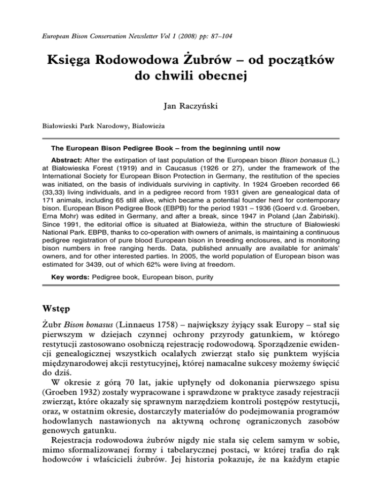 European Bison Conservation Newsletter Vol 1 (2008) pp: 87–104 Księga Rodowodowa Żubrów – od początków do chwili obecnej Jan Raczyński Białowieski Park Narodowy, Białowieża The European Bison Pedigree Book – from the beginning until now Abstract: After the extirpation of last population of the European bison Bison bonasus (L.) at Białowieska Forest (1919) and in Caucasus (1926 or 27), under the framework of the International Society for European Bison Protection in Germany, the restitution of the species was initiated, on the basis of individuals surviving in captivity. In 1924 Groeben recorded 66 (33,33) living individuals, and in a pedigree record from 1931 given are genealogical data of 171 animals, including 65 still alive, which became a potential founder herd for contemporary bison. European Bison Pedigree Book (EBPB) for the period 1931 – 1936 (Goerd v.d. Groeben, Erna Mohr) was edited in Germany, and after a break, since 1947 in Poland (Jan Żabiński). Since 1991, the editorial office is situated at Białowieża, within the structure of Białowieski National Park. EBPB, thanks to co-operation with owners of animals, is maintaining a continuous pedigree registration of pure blood European bison in breeding enclosures, and is monitoring bison numbers in free ranging herds. Data, published annually are available for animals’ owners, and for other interested parties. In 2005, the world population of European bison was estimated for 3439, out of which 62% were living at freedom. Key words: Pedigree book, European bison, purity Wstęp Żubr Bison bonasus (Linnaeus 1758) – największy żyjący ssak Europy – stał się pierwszym w dziejach czynnej ochrony przyrody gatunkiem, w którego restytucji zastosowano osobniczą rejestrację rodowodową. Sporządzenie ewidencji genealogicznej wszystkich ocalałych zwierząt stało się punktem wyjścia międzynarodowej akcji restytucyjnej, której namacalne sukcesy możemy święcić do dziś. W okresie z górą 70 lat, jakie upłynęły od dokonania pierwszego spisu (Groeben 1932) zostały wypracowane i sprawdzone w praktyce zasady rejestracji zwierząt, które okazały się sprawnym narzędziem kontroli postępów restytucji, oraz, w ostatnim okresie, dostarczyły materiałów do podejmowania programów hodowlanych nastawionych na aktywną ochronę ograniczonych zasobów genowych gatunku. Rejestracja rodowodowa żubrów nigdy nie stała się celem samym w sobie, mimo sformalizowanej formy i tabelarycznej postaci, w której trafia do rąk hodowców i właścicieli żubrów. Jej historia pokazuje, że na każdym etapie 88 Księga Rodowodowa Żubrów rozwoju hodowli światowych, formuła Księgi podlegała stosownym modyfikacjom, dzięki którym nadążała ona za nowymi trendami w restytucji gatunku, jakie pojawiały się na świecie. Także w czasach współczesnych Księga w pełni realizuje swą podstawową rolę w zakresie śledzenia rozwoju światowego stada żubrów czystej krwi. Mimo postępu w dziedzinie gromadzenia danych o żubrach (na nośnikach elektronicznych), podstawową rolę odgrywa system zbierania danych w sposób ciągły i pozbawiony luk w odniesieniu do całkowitej puli zarejestrowanych zwierząt. Jego istotą są stałe kontakty z hodowcami i właścicielami żubrów w skali światowej. Udostępnianie tych informacji w postaci publikacji (lub stron internetowych) stanowić będzie, również w przyszłości, podstawową funkcję Księgi Rodowodowej Żubrów. Niniejsze opracowanie ma na celu przedstawienie, w ujęciu chronologicznym, rozwoju Księgi Rodowodowej Żubrów oraz dokonanie oceny jej znaczenia, we wczesnym i współczesnym okresie, dla prac nad ochroną i utrzymaniem zasobów tego zagrożonego gatunku. Wytępienie ostatnich naturalnych stad żubrów Punktem zwrotnym w historii żubra była zagłada ostatniej reliktowej populacji żubrów w Puszczy Białowieskiej. Należy pamiętać, że historyczny areał żubra obejmował przeważającą część Europy, od jej zachodnich rubieży (bez półwyspu Apenińskiego), poprzez Europę Środkową aż po Wołgę i Kaukaz na wschodzie (Pucek 1994; Krasińska i Krasiński 2004). Kurczenie się naturalnego areału gatunku omawia szczegółowo Pucek (1994). Naturalne stado żubrów nizinnych na terytorium Puszczy Białowieskiej (znanych później także pod nazwą białowieskich) pozostawało od dziesiątków lat pod szczególną opieką, głównie ze względu na chęć utrzymania wysokich walorów myśliwskich reprezentacyjnego carskiego łowiska (Karcov 1903). Położenie nacisku na utrzymywanie licznych stad dzikiej zwierzyny, głównie jeleniowatych i żubrów, nie sprzyjało ekologicznej sytuacji tych ostatnich, ze względu na istnienie konkurencji pokarmowej w grupie roślinożerców (Wróblewski 1927; Jędrzejewska i in. 1997). Mimo to białowieskie stado żubrów, dzięki zimowemu dokarmianiu, nie było zagrożone i mogło rozwijać się liczebnie. Klęskę jego egzystencji przyniosły działania podczas I wojny światowej, które nie ominęły Puszczy Białowieskiej. Prawdziwe jednak zagrożenie przyniósł żubrom krótki okres bezprawia po ustąpieniu wojsk i bezkarny rozwój kłusownictwa, które zawsze drzemało jako obyczaj wśród miejscowej ludności. Wiosna 1919 r. zapisała się w historii jako tragiczny koniec populacji żubrów w Puszczy Białowieskiej (Sztolcman 1926). Działania administracyjne nowo powołanego polskiego zarządu Lasów Państwowych przyszły w momencie, gdy dramat już się rozegrał i nie mogły odwrócić biegu historii. Ostatnie dzikie stado żubrów, zachowane od prawieków w środku Europy, przestało istnieć. W części dawnej literatury naukowej pokutuje Jan Raczyński 89 błędna data zagłady żubrów w Białowieży. Stosowne sprostowanie i opis okoliczności powstania tego błędu podają Krasińska i Krasiński (2004). Wkrótce (według różnych źródeł w 1926 lub 1927 r.), los żubrów białowiesk