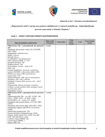 1 Załącznik nr 4a/1 – formularz cen jednostkowych „Doposażenie szkół w sprzęt oraz pomoce dydaktyczne w ramach projektu pn. Indywidualizacja procesu nauczania w Gminie Chojnów” Część 1 – ZAKUP I DOSTAWA SPRZĘTU ELEKTRONICZNEGO Opis przedmiotu zamówienia Odtwarzacz CD o parametrach nie gorszych niż: Standardy odtwarzania: Audio CD, CD-R/RW, MP3, WMA Magnetofon: Jednokasetowy Radio: Cyfrowe Dźwięk: Stereo Ty głośników: Szerokopasmowe Moc wejściowa RMS: 2 x 4 W Korektor dźwięku: Tak Podbicie basów: Tak Wyświetlacz: Czarno – biały LCD Pilot: Tak Funkcje dodatkowe: Autostop, czytnik kart pamięci SD/MMC, odtwarzanie plików MP3, WMA przez złącze USB, synchroniczne nagrywanie z CD Wejścia/Wyjścia: USB, wejście słuchawkowe Wymiary: 420 x 166 x 280 mm Zasilanie: 6 baterii R20, sieciowe 220 – 240 V, 50/60 Hz Wyposażenie: Baterie do pilota, instrukcja obsługi w języku polskim, kabel zasilający, karta gwarancyjna, pilot Gwarancja: 12 m-cy Odtwarzacz DVD o parametrach nie gorszych niż: Odtwarzanie płyt: Blu – ray, BD - R, BD – RE, DVD + R/RW, DVD + R, DVD + RDL, , DVDVIDEO, CD – Audio, CD – R/RW Standardy odtwarzania obrazu: AVC-HD, MKV, DIVIX Standardy odtwarzania zdjęć: HD-JPEG, JPEG Interpolacja nagrań z płyt DVD: Do formatu 1080p Skanowanie progresywne: Tak System dźwięku wielokanałowego: Dolby Digital, Dolby Digital Plus, Dolby True HD, DTS, DTS-HD Master Audio Cyfrowe wejście HDMI: Tak Liczba złączy HDMI: 1 Złącze USB: Tak Ilość sztuk /zestawów Cena netto Cena netto razem VAT Cena brutto razem 3 sztuki 1 sztuka Projekt współfinansowany przez Unię Europejska w ramach Europejskiego Funduszu Społecznego 1 2 Złącze Ethernet: Tak Wejście kompozytowe: Tak Liniowe wejście audio: Tak Czytnik kart pamięci: SD WiFi: Ready DLNA: Tak Funkcje dodatkowe: BD-LIVE profil 2.0, BonusView, Deep Colour, możliwość aktualizacji oprogramowania, x.v. Colour Pilot: Obsługujący odtwarzacz Kolor obudowy: Czarny Pobór mocy: 12 W Zasilanie: 230 V, 50/60 Hz Wymiary: 430 x 35 x 179 mm Wyposażenie: 2 baterie AA, instrukcja obsługi w języku polskim, karta gwarancyjna, pilot Gwarancja: 12 miesięcy Notebook o parametrach nie gorszych niż: System operacyjny: Microsoft Windows 7 Home Premium 64 – bit/ Professional 64 - bit Dodatkowe oprogramowanie: Program antywirusowy – licencja na rok, MS Office 2010 Starter/ MS Office Home and Student 2010 PL Procesor: Procesor czterordzeniowy, taktowane minimum 2,3 GHz Gwarancja: Min 24 m-ce , gwarancja baterii: min. 6 m-cy Ekran: Min. Przekątna ekranu: 17 cali, rozdzielczość 1600x900, Typ: Led, błyszczący Pamięć RAM: 4 GB Dysk twardy: Min. 320 GB Inne napędy: Nagrywarka DVD - RW DL Karta grafiki HD: Min. 512 MB własnej pamięci Dodatkowe wyposażenie: Karta dźwiękowa, głośniki, mikrofon, kamera internetowa, karta sieciowa 10/100/1000 Mbps, karta WiFi, Blutooth min. 2, złącza USB, wyjście VGA RAZEM 6 sztuk Projekt współfinansowany przez Unię Europejska w ramach Europejskiego Funduszu Społecznego 2