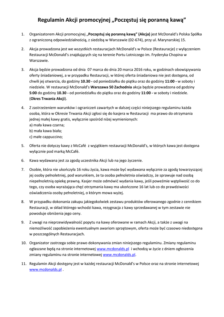 Regulamin Akcji promocyjnej „Poczęstuj się poranną kawą” 1. Organizatorem Akcji promocyjnej „Poczęstuj się poranną kawą” (Akcja) jest McDonald’s Polska Spółka z ograniczoną odpowiedzialnością, z siedzibą w Warszawie (02-674), przy ul. Marynarskiej 15. 2. Akcja prowadzona jest we wszystkich restauracjach McDonald’s w Polsce (Restauracje) z wyłączeniem Restauracji McDonald’s znajdujących się na terenie Portu Lotniczego im. Fryderyka Chopina w Warszawie. 3. Akcja będzie prowadzona od dnia 07 marca do dnia 20 marca 2016 roku, w godzinach obowiązywania oferty śniadaniowej, a w przypadku Restauracji, w której oferta śniadaniowa nie jest dostępna, od chwili jej otwarcia, do godziny 10.30 - od poniedziałku do piątku oraz do godziny 11:00 - w soboty i niedziele. W restauracji McDonald’s Warszawa 50 Zachodnia akcja będzie prowadzona od godziny 5:00 do godziny 10.30 - od poniedziałku do piątku oraz do godziny 11:00 - w soboty i niedziele. (Okres Trwania Akcji). 4. Z zastrzeżeniem warunków i ograniczeń zawartych w dalszej części niniejszego regulaminu każda osoba, która w Okresie Trwania Akcji zgłosi się do kasjera w Restauracji ma prawo do otrzymania jednej małej kawy gratis, wyłącznie spośród niżej wymienionych: a) mała kawa czarna; b) mała kawa biała; c) małe cappuccino; 5. Oferta nie dotyczy kawy z McCafé z wyjątkiem restauracji McDonald’s, w których kawa jest dostępna wyłącznie pod marką McCafé. 6. Kawa wydawana jest za zgodą uczestnika Akcji lub na jego życzenie. 7. Osobie, która nie ukończyła 16 roku życia, kawa może być wydawana wyłącznie za zgodą towarzyszącej jej osoby pełnoletniej, pod warunkiem, że ta osoba pełnoletnia oświadczy, że sprawuje nad osobą niepełnoletnią opiekę prawną. Kasjer może odmówić wydania kawy, jeśli poweźmie wątpliwość co do tego, czy osoba wyrażająca chęć otrzymania kawy ma ukończone 16 lat lub co do prawdziwości oświadczenia osoby pełnoletniej, o którym mowa wyżej. 8. W przypadku dokonania zakupu jakiegokolwiek zestawu produktów oferowanego zgodnie z cennikiem Restauracji, w skład którego wchodzi kawa, rezygnacja z kawy sprzedawanej w tym zestawie nie powoduje obniżenia jego ceny. 9. Z uwagi na nieprzewidywalność popytu na kawy oferowane w ramach Akcji, a także z uwagi na niemożliwość zapobieżenia ewentualnym awariom sprzętowym, oferta może być czasowo niedostępna w poszczególnych Restauracjach. 10. Organizator zastrzega sobie prawo dokonywania zmian niniejszego regulaminu. Zmiany regulaminu ogłaszane będą na stronie internetowej www.mcdonalds.pl i wchodzą w życie z dniem ogłoszenia zmiany regulaminu na stronie internetowej www.mcdonalds.pl. 11. Regulamin Akcji dostępny jest w każdej restauracji McDonald’s w Polsce oraz na stronie internetowej www.mcdonalds.pl .