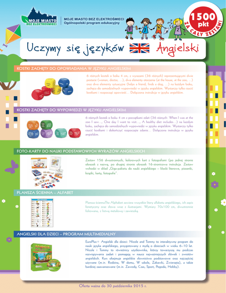 Uczymy się języków Szanowna Pani Dyrektor / Szanowny Panie Dyrektorze, Z Z ca pkt ły z e s Angielski Chciałabym serdecznie zaprosić do wzięcia udziału w Ogólnopolskim programie edukacyjnym „Moje miasto bez elektrośmieci”. Program jest działaniem długofalowym i realizowany jest od roku 2012 w blisko 3000 szkół podstawowych i jestopowiadania jednym z największych i najbardziej prestiżowych programów o tej tematyce w Polsce. Kostki zachęty do w języku angielskim W tym roku do realizacji programu zapraszamy również gimnazja. Będzie nam niezmiernie miło, jeśli i Państwa 6 różnych kostek o boku 4 cm, z wyrazami (36 różnych) reprezentującymi dwie placówka dołączy do grona uczestniczących w programie. postacie (woman, doctor, ...), dwa elementy otoczenia (at the house, at the zoo, ...) oraz dwa elementydotyczącej sytuacyjne selektywnej (helps a friend, finds zużytego a dog, ...)sprzętu na każdym boku, Celem programu jest zwiększanie świadomości społecznej zbiórki elektrycznego zachęca do samodzielnych wypowiedzi w języku angielskim. Wystarczy tylko rzucić i elektronicznego oraz mobilizowanie mieszkańców do prawidłowego postępowania z elektrośmieciami. kostkami i rozpocząć opowieść... Dołączona instrukcja w języku angielskim. Program realizowany jest pod honorowym patronatem Ministra Edukacji Narodowej, Ministerstwa Środowiska oraz Związku Miast Polskich. Organizatorem projektu jest ElektroEko Organizacja Odzysku Sprzętu Elektrycznego i Elektronicznego SA, która od lat realizuje działania edukacyjne skierowane do różnych grup społecznych, w tym również do Kostki zachęty domiasto wypowiedzi w języku dzieci. Program „Moje bez elektrośmieci” doskonaleangielskim wpisuje się w podstawę programową z dnia 23.12.2008 r. kształcenia ogólnego w poszczególnych typach szkół. Pragnę zwrócić uwagę, iż uznanie programu przez najwyższe instytucje państwowe, 6 różnych kostek o boku 4 cm z początkami zdań (36 różnych: When I was at the takie jak: Ministra Edukacji Narodowej czyzoo Ministerstwo Środowiska, do includes...) wykorzystania programu w I saw..., One day I wantdaje to Państwu visit..., Apodstawę healthy diet na każdym ewaluacji wewnętrznej, jak i zewnętrznej. boku, zachęca do samodzielnych wypowiedzi w języku angielskim. Wystarczy tylko rzucić kostkami i dokończyć rozpoczęte zdanie... Dołączona instrukcjazaświadczenie w języku Szkoły realizujące program otrzymają dyplom za uczestnictwo w programie, a koordynator - imienne angielskim. potwierdzające jego zaangażowanie w realizowanie zajęć i prowadzenie dodatkowych aktywności. Program „Moje miasto bez elektrośmieci” daje placówkom oświatowym możliwość korzystania z Funduszu Oświatowego, który jest zasilany ze zbiórek elektrośmieci i w całości przeznaczany jest na zakup nowoczesnego wyposażenia Foto-karty nauki podstawowych wyrazów angielskich i pomocy do dydaktycznych. Wiele szkół uczestniczących w programie otrzymało z Funduszu wymarzone pomoce dydaktyczne, m.in. tablice interaktywne, które cieszą się największym zainteresowaniem. Udział w Funduszu Zestaw 156 dwustronnych, kolorowych kart z fotografiami (po jednej stronie Oświatowym nie wiąże się z żadnymi kosztami, elementem organizowanie przez przedszkole obrazek jedynym z nazwą, wymaganym po drugiej stronie obrazekjest 16-stronicowa instrukcja. Zestaw zbiórek elektrośmieci. wchodzi w skład „Giga-pakietu do nauki angielskiego – klocki literowe, piosenki, karty, informowania fotografie”. rodziców oraz społeczności lokalnych, aby oddawali Zachęcam do aktywnego uczestnictwa w książki, programie, elektrośmieci na rzecz Państwa placówki podczas organizowanych zbiórek lub bezpośrednio do punktów zbierania elektrośmieci ElektroEko (lista punktów zbierania ElektroEko znajduje się na stronie www.moje-miasto-bez-elektrosmieci.pl). Chcąc zgłosić placówkę do programu należy wypełnić załączony formularz i odesłać go na podany w formularzu numer Plansza ścienna – alfabet faksu lub adres e-mail. Dodatkowo, 100 pierwszych placówek, które zamówią odbiór elektrośmieci do 31 maja 2015 r. otrzyma zegar ścienny do sali lekcyjnej oraz materiały tematyczne. Wszystkie materiały przekazywane Plansza ściennaThe Alphabet zawiera wszystkie litery alfabetu angielskiego, ich zapis w ramach programu są bezpłatne. BEZPŁATNY odbiór elektrośmieci można Wymiary zamówić70x100 poprzezcm, stronę internetową fonetyczny oraz słowa wraz z ilustracjami. dwustronnie www.moje-miasto-bez-elektrosmieci.pl. foliowana, W razie pytań, służymy pomocą pod numerem infolinii 509 856 509. z listwą metalową i zawieszką. Wierzę, że udział w Ogólnopolskim programie edukacyjnym „Moje miasto bez elektrośmieci” przyniesie korzyści zarówno placówkom edukacyjnym, jak i środowisku naturalnemu. Serdecznie zapraszam, Angielski dla dzieci – program multimedialny EuroPlus+ Angielski dla dzieci: Nicole and Tommy to interaktywny program do nauki języka angielskiego, przygotowany z myślą o dzieciach w wieku 6–10 lat. Anna Podsiadło i Tommy to rówieśnicy użytkownika, którzy towarzyszą mu podczas Koordynator Programu „Moje miasto bezNicole elektrośmieci” rozwiązywania zadań i pomagają w nauce najważniejszych słówek i zwrotów angielskich. Kurs obejmuje angielskie słownictwo podstawowe oraz najczęściej używane (m.in. Rodzina, W domu, W szkole, Zabawki, Zwierzęta), a także organizator Patronat honorowy bardziej zaawansowane (m.in. Zawody, Czas, Sport, Pogoda, Hobby). Moje miasto bez elektrośmieci • Infolinia Oferta 509ważna 856do 509 30•października [email protected] 2015 •r. www.moje-miasto-bez-elektrosmieci.pl w! K ta MOJE MIASTO BEZ ELEKTROŚMIECI Ogólnopolski program edukacyjny Za 1500 MOJE MIASTO BEZ ELEKTROŚMIECI Ogólnopolski program edukacyjny