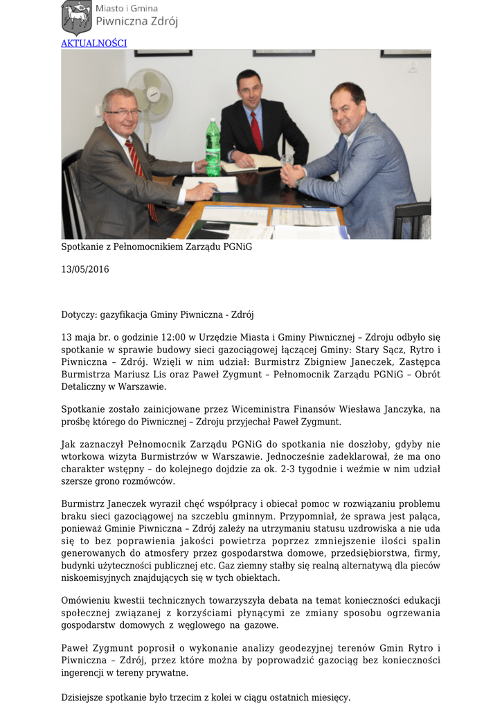 AKTUALNOŚCI Spotkanie z Pełnomocnikiem Zarządu PGNiG 13/05/2016 Dotyczy: gazyfikacja Gminy Piwniczna - Zdrój 13 maja br. o godzinie 12:00 w Urzędzie Miasta i Gminy Piwnicznej – Zdroju odbyło się spotkanie w sprawie budowy sieci gazociągowej łączącej Gminy: Stary Sącz, Rytro i Piwniczna – Zdrój. Wzięli w nim udział: Burmistrz Zbigniew Janeczek, Zastępca Burmistrza Mariusz Lis oraz Paweł Zygmunt – Pełnomocnik Zarządu PGNiG – Obrót Detaliczny w Warszawie. Spotkanie zostało zainicjowane przez Wiceministra Finansów Wiesława Janczyka, na prośbę którego do Piwnicznej – Zdroju przyjechał Paweł Zygmunt. Jak zaznaczył Pełnomocnik Zarządu PGNiG do spotkania nie doszłoby, gdyby nie wtorkowa wizyta Burmistrzów w Warszawie. Jednocześnie zadeklarował, że ma ono charakter wstępny – do kolejnego dojdzie za ok. 2-3 tygodnie i weźmie w nim udział szersze grono rozmówców. Burmistrz Janeczek wyraził chęć współpracy i obiecał pomoc w rozwiązaniu problemu braku sieci gazociągowej na szczeblu gminnym. Przypomniał, że sprawa jest paląca, ponieważ Gminie Piwniczna – Zdrój zależy na utrzymaniu statusu uzdrowiska a nie uda się to bez poprawienia jakości powietrza poprzez zmniejszenie ilości spalin generowanych do atmosfery przez gospodarstwa domowe, przedsiębiorstwa, firmy, budynki użyteczności publicznej etc. Gaz ziemny stałby się realną alternatywą dla pieców niskoemisyjnych znajdujących się w tych obiektach. Omówieniu kwestii technicznych towarzyszyła debata na temat konieczności edukacji społecznej związanej z korzyściami płynącymi ze zmiany sposobu ogrzewania gospodarstw domowych z węglowego na gazowe. Paweł Zygmunt poprosił o wykonanie analizy geodezyjnej terenów Gmin Rytro i Piwniczna – Zdrój, przez które można by poprowadzić gazociąg bez konieczności ingerencji w tereny prywatne. Dzisiejsze spotkanie było trzecim z kolei w ciągu ostatnich miesięcy.